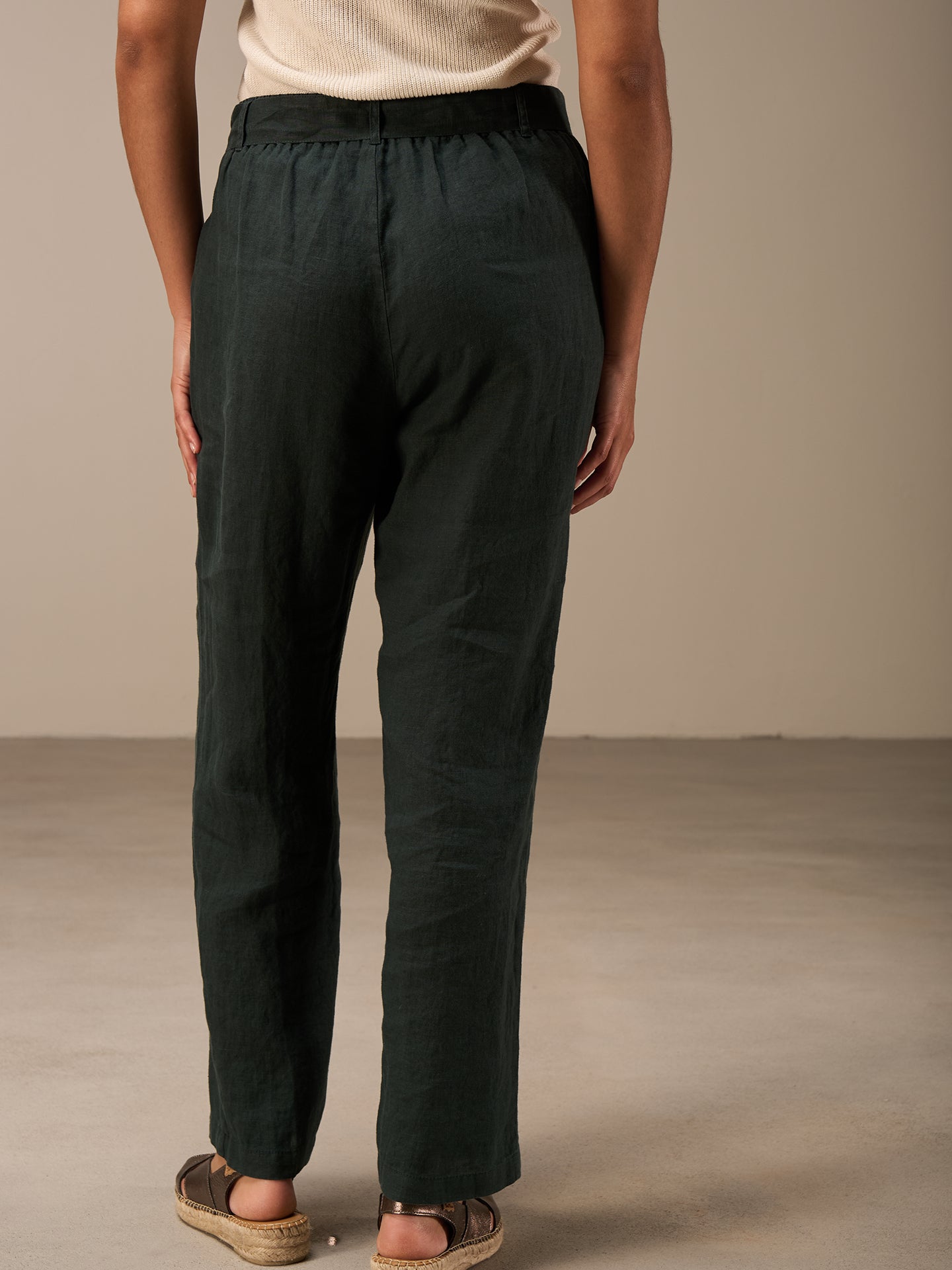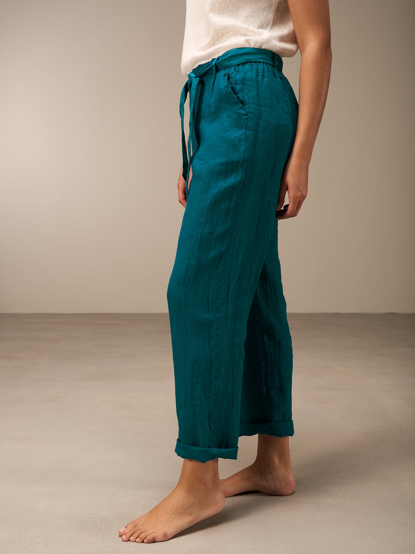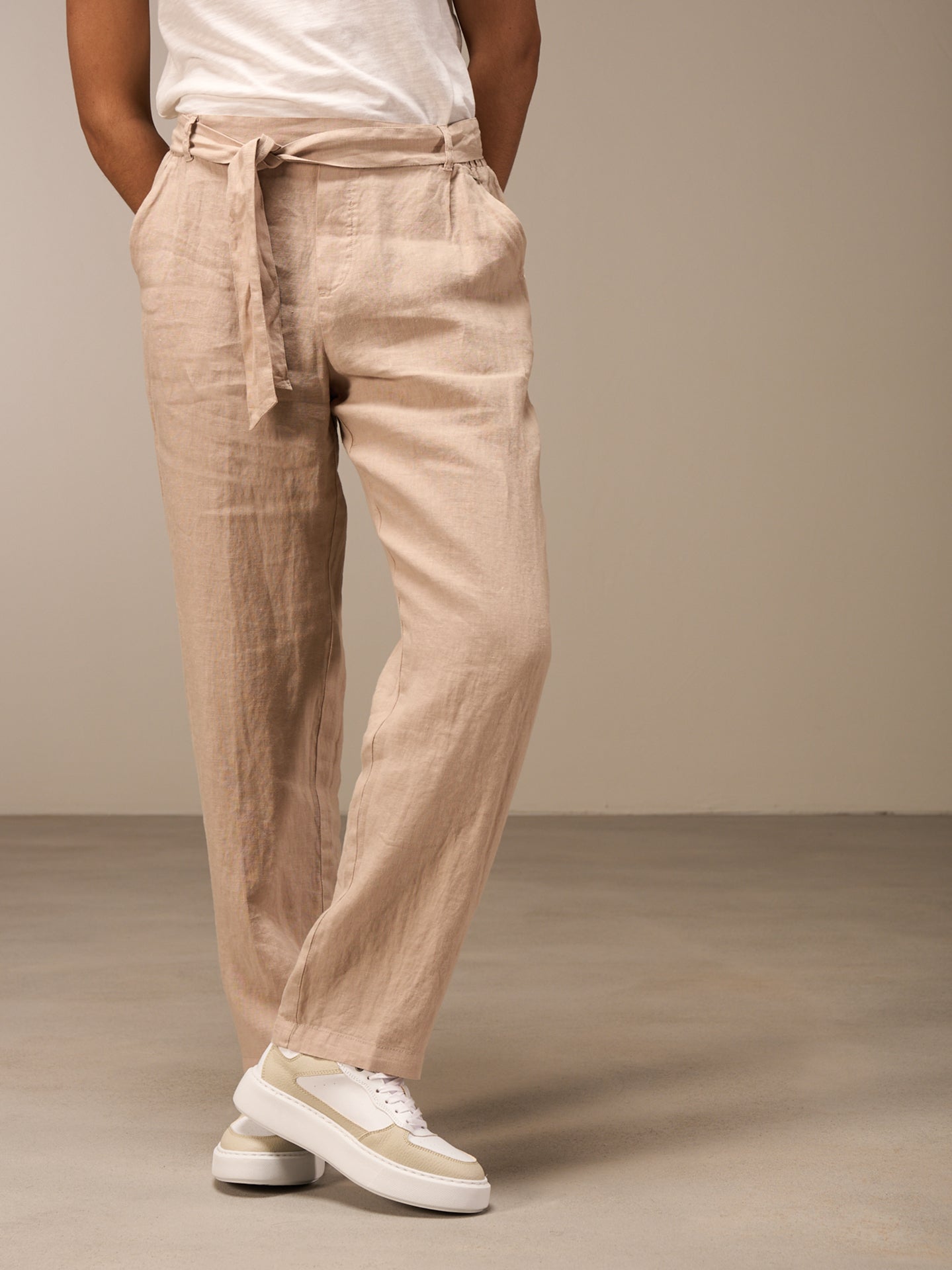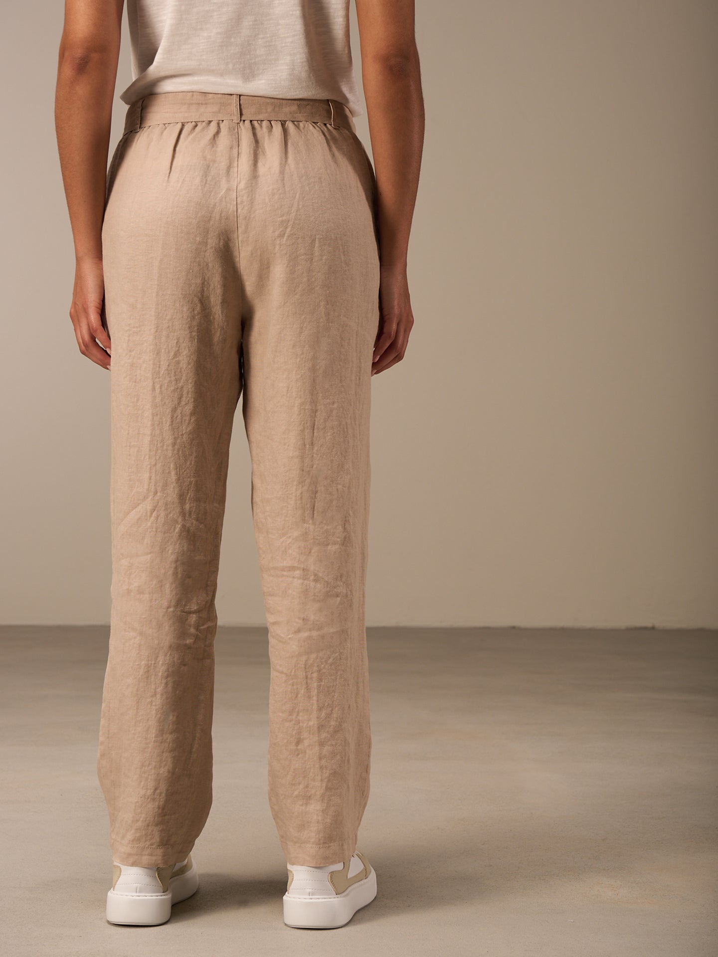 Lässige Hose mit Elastikbund hinten für eine bequeme Passform. Der Stoffgürtel rundet den Look ab. Die 100% Leinen Qualität sorgt auch bei sommerlichen Temperaturen für einen idealen Tragekomfort.
