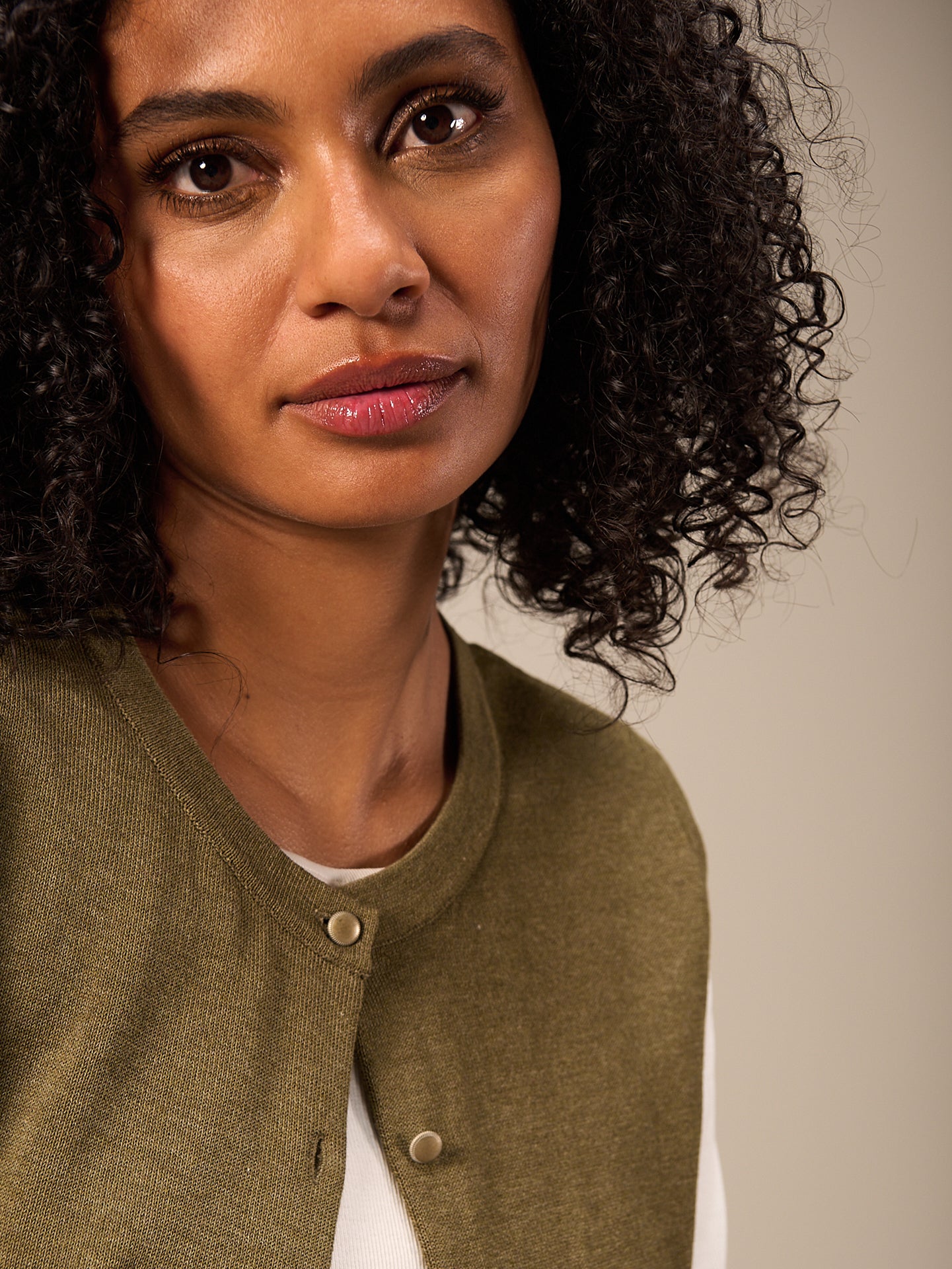 Mit wertigen Knöpfen verschliessbare Strickweste in Melangegarn mit Rundhalsausschnitt und Rippenborte am Saum. 60% Bio-Baumwolle aus OCS-zertifiziertem Anbau und 40% recyceltes Polyester. Der Organic Content Standard (OCS) überprüft den Anteil an biologisch angebauten Materialien in einem Endprodukt und stellt durch lückenlose Rückverfolgbarkeit sicher, dass die Angaben zum biologischen Materialanteil korrekt sind.