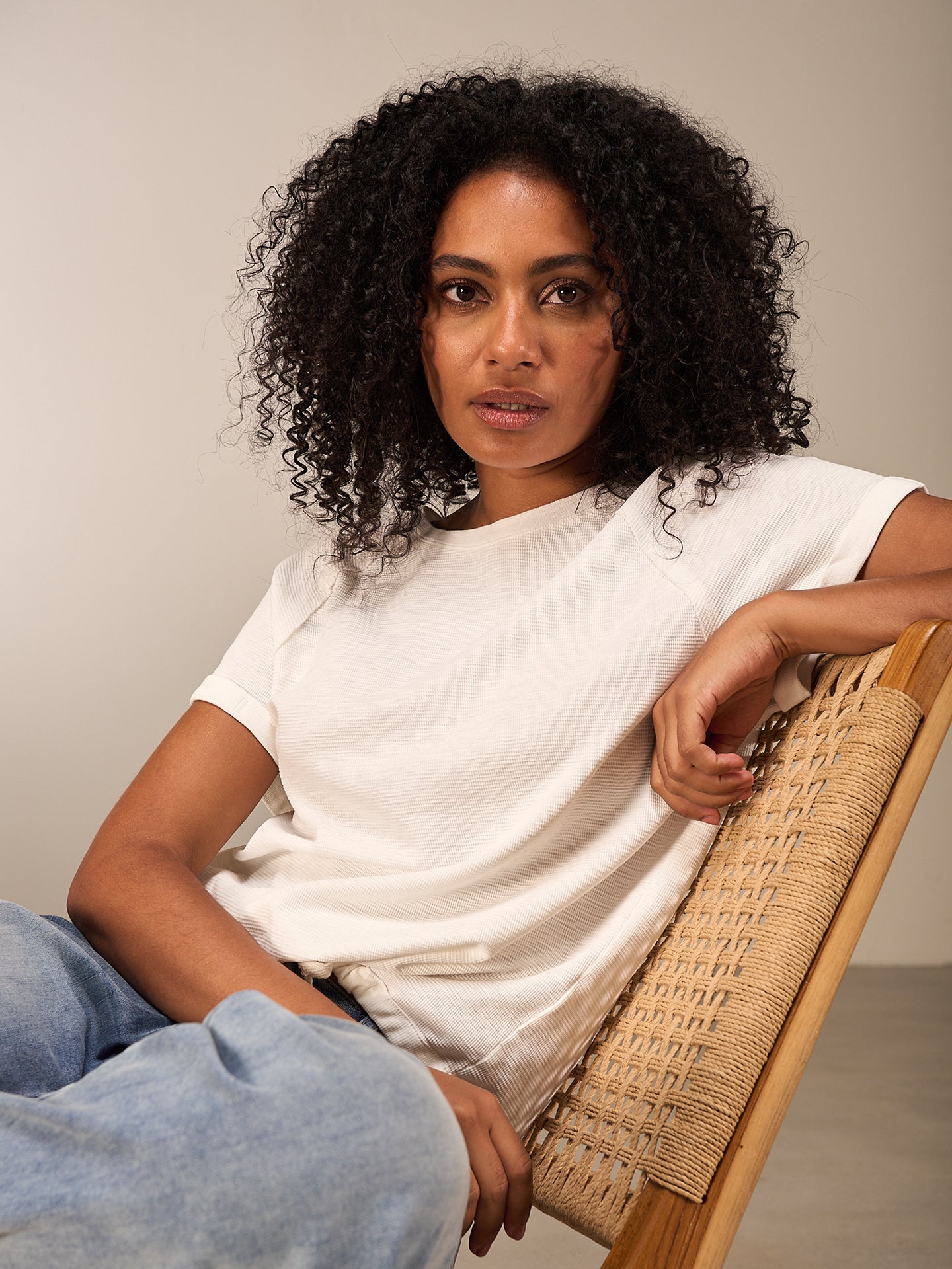 Weit geschnittenes Rundhals Shirt mit Raglanarm, sportlichem Tunnelzug mit Band am Saum. Das hochwertig gewirkte Waffeljersey sorgt für einen perfekten Tragekomfort. Stückgefärbt in pigment-dye Verfahren. Aus 100% GOTS-zertifizierter Bio-Baumwollqualität. Stückgefärbt.