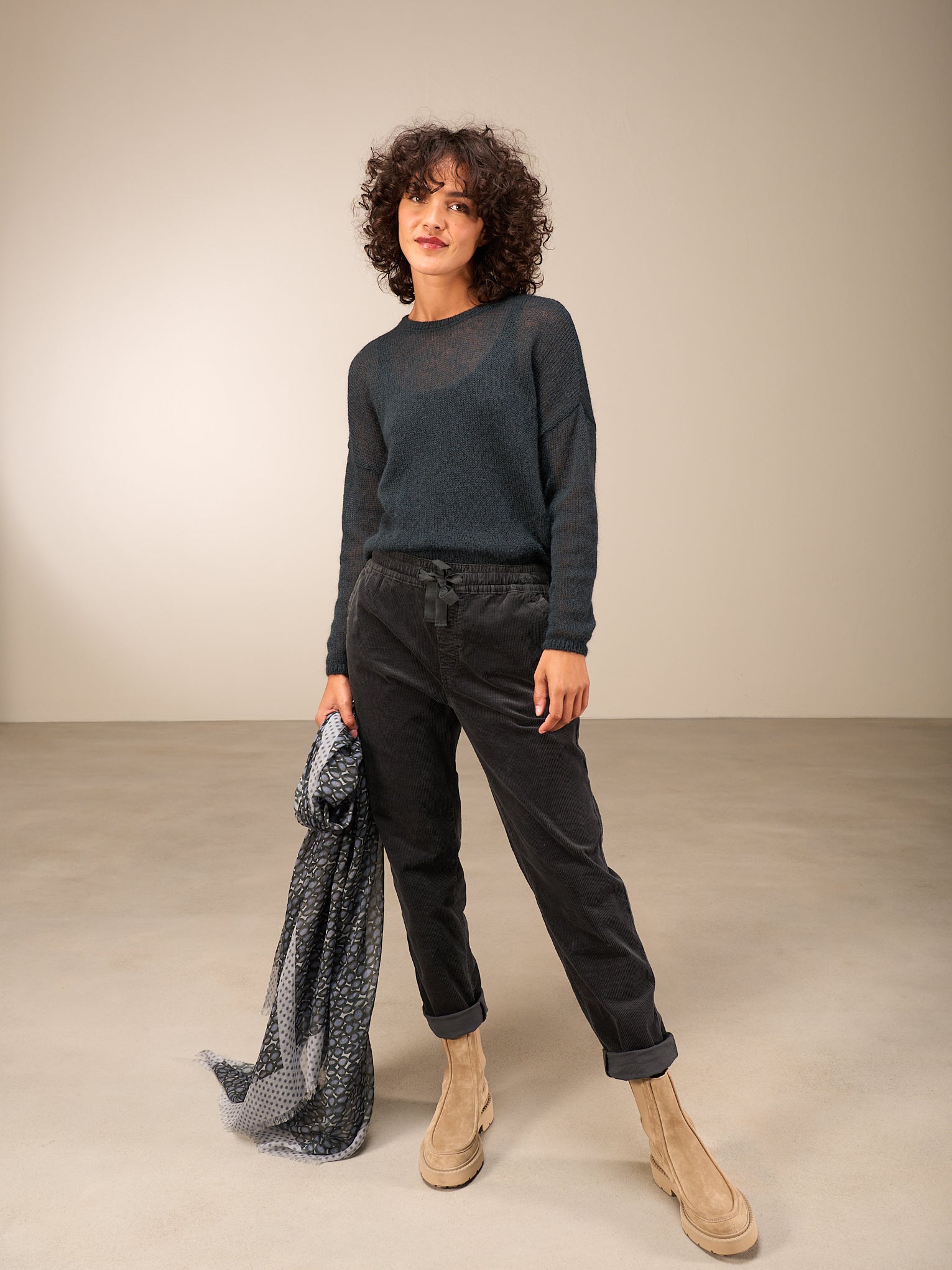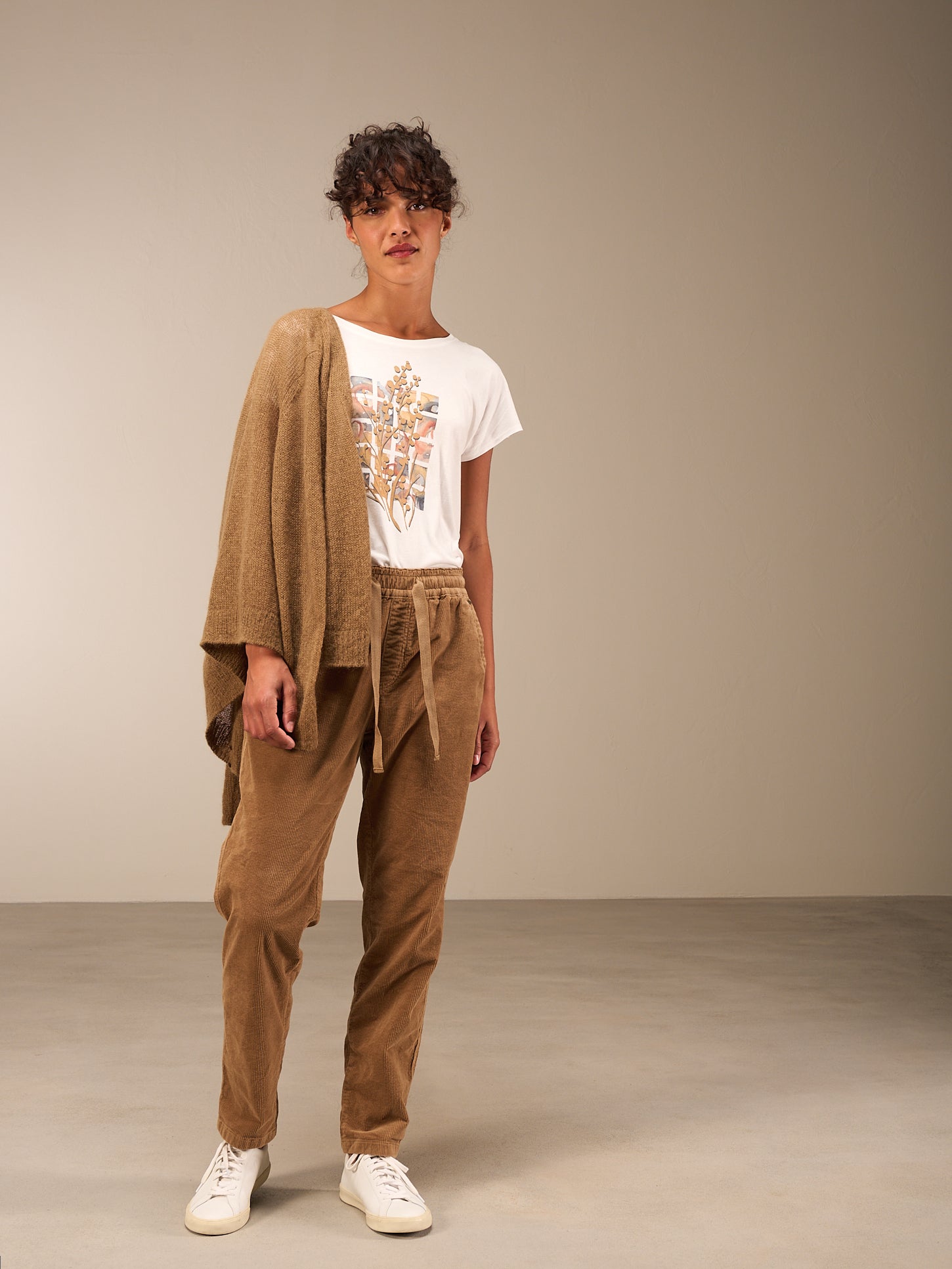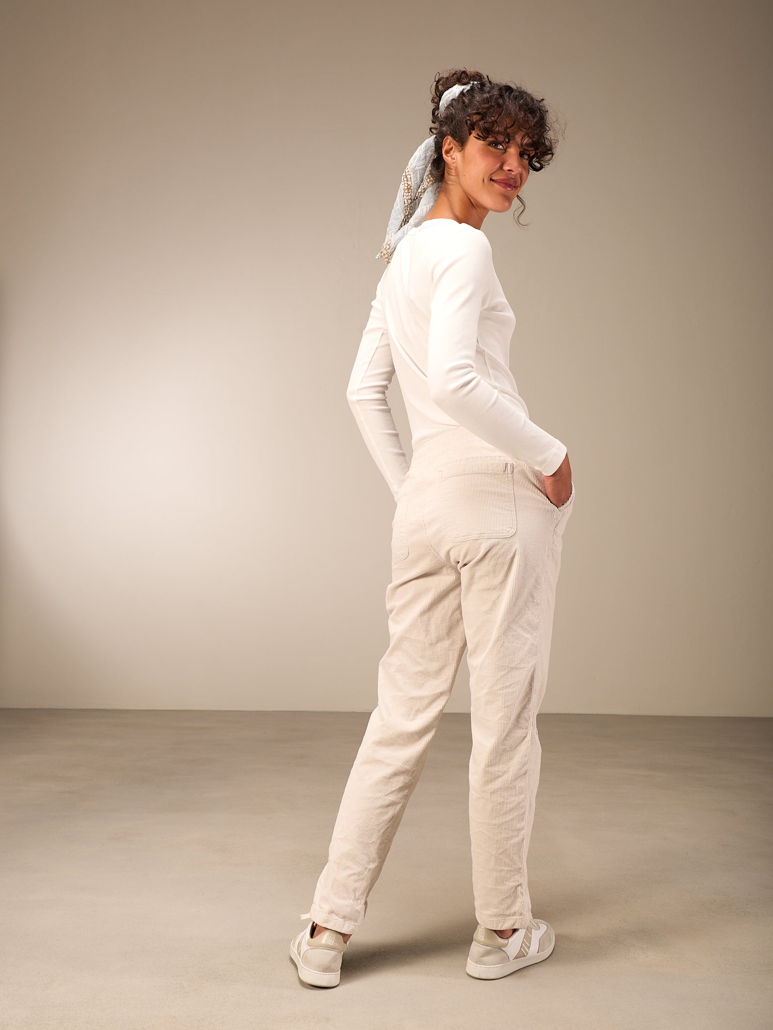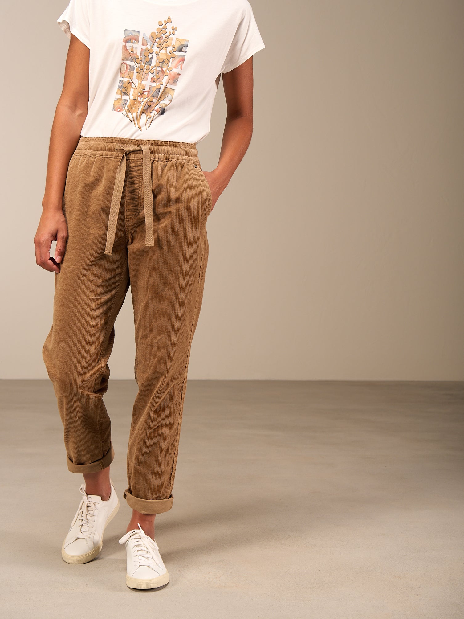 Lässige sportliche Hose in weicher Längsrippen-Cord Qualitat mit mittelhohem elastischem Bund mit Kordelzug, gekrempeltem Saum und aufgesetzen Taschen am Gesäss.