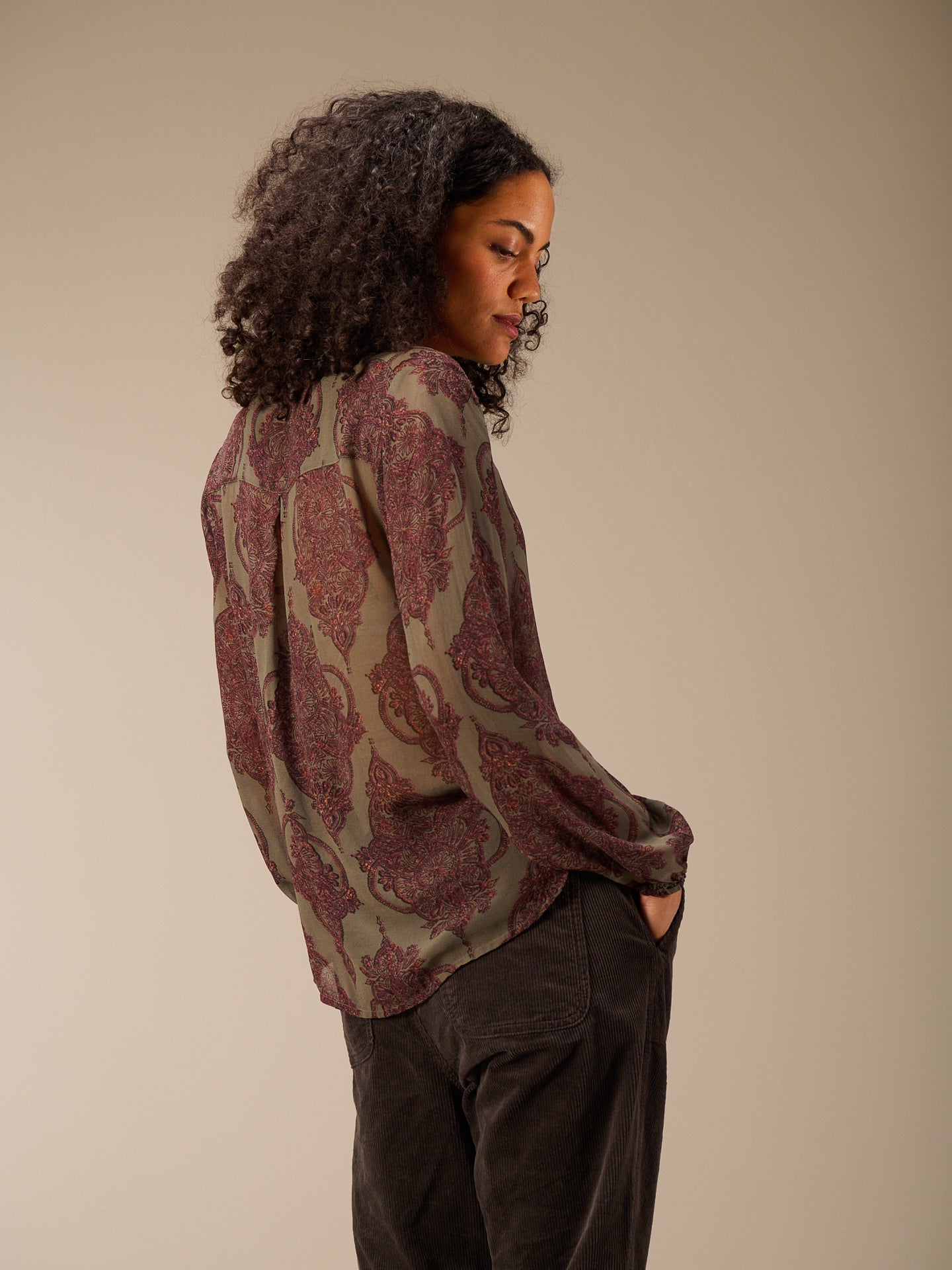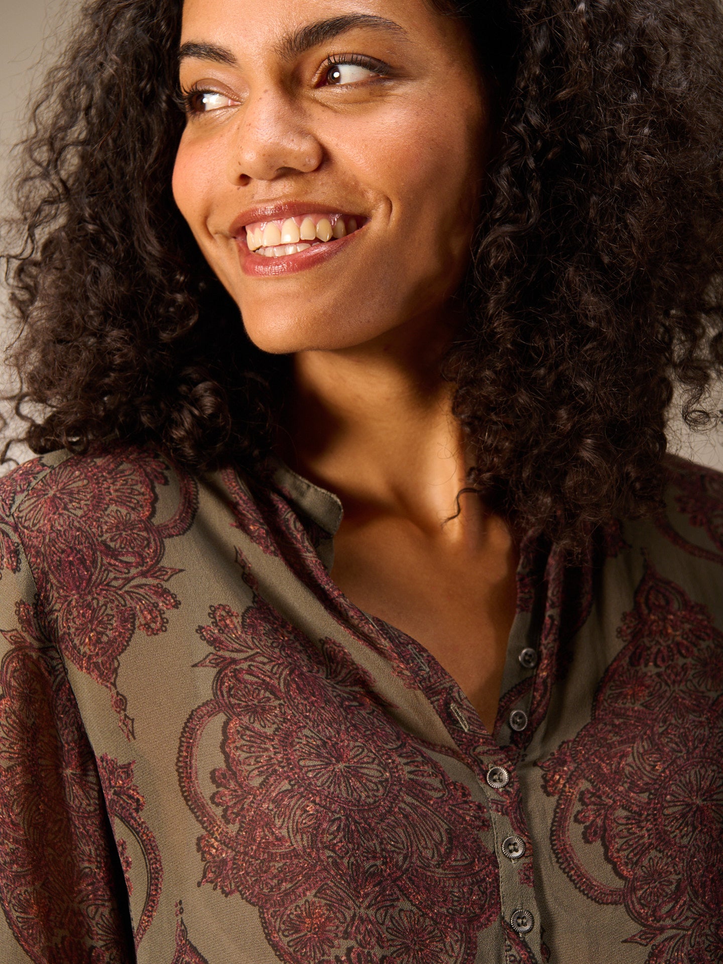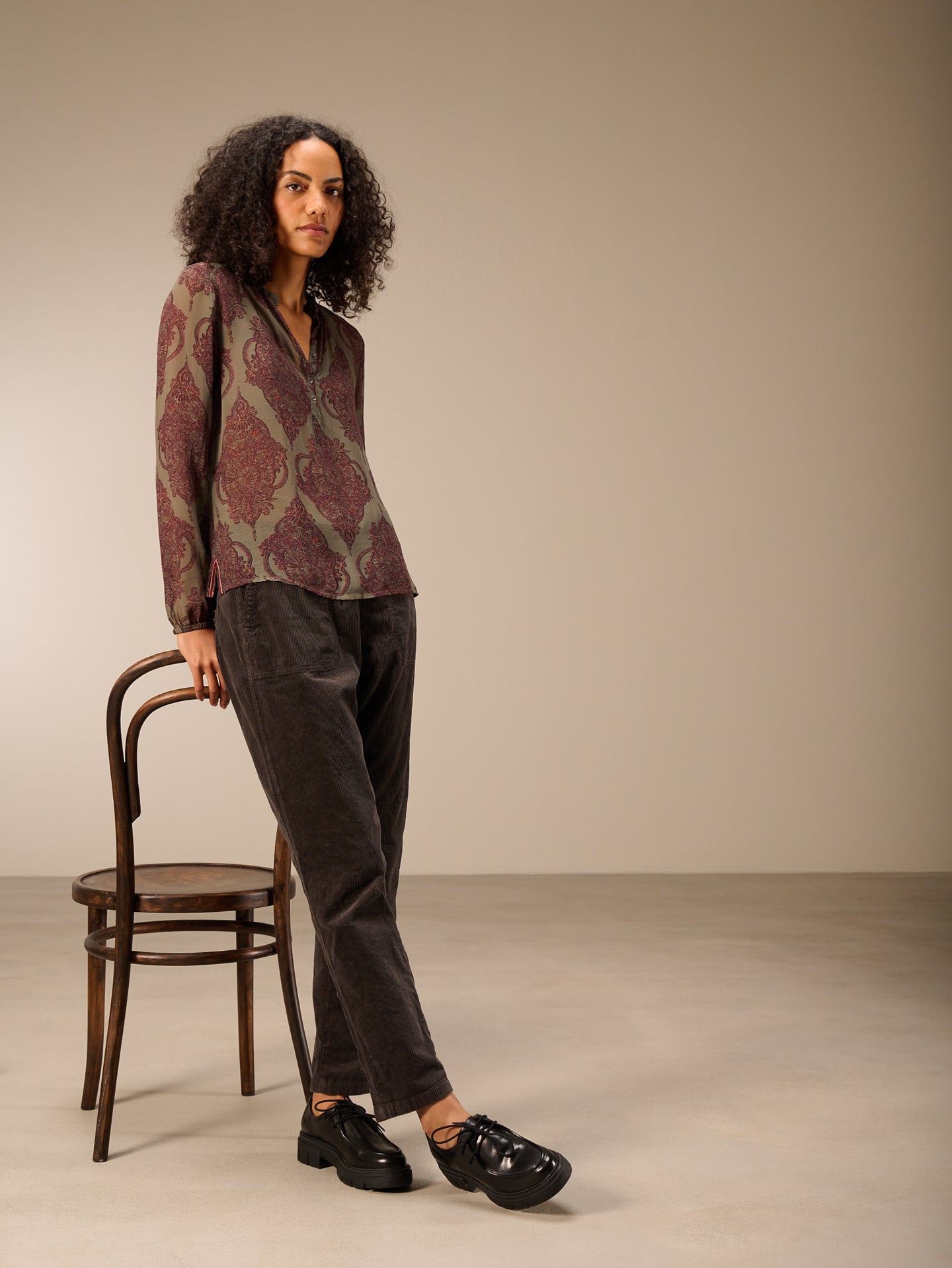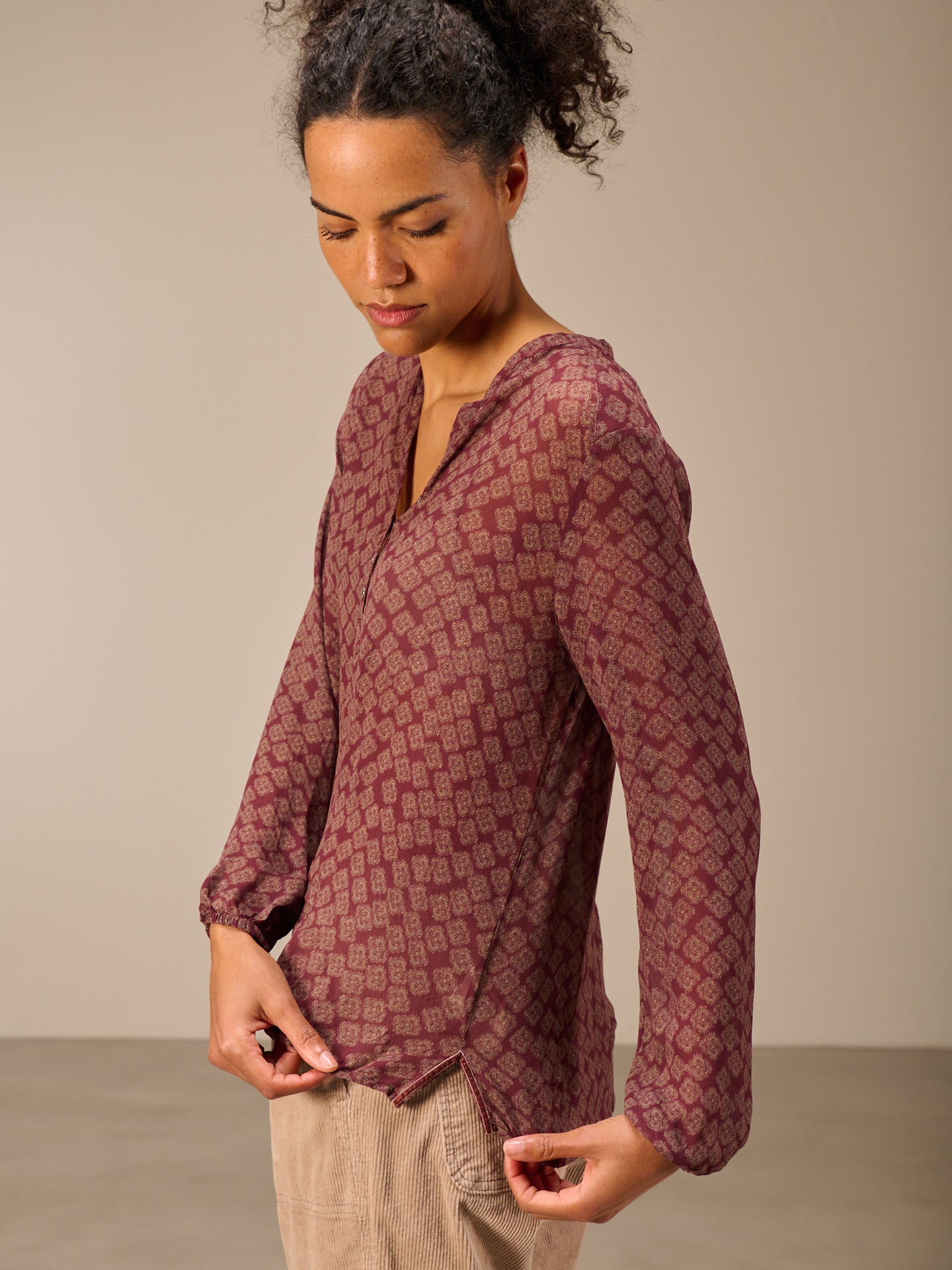Gerade geschnittene Bluse mit langen Ärmeln die durch den leichten Elastikbund viele Stylemöglichkeiten bietet. Der V-Ausschnitt und eine attraktive schmale Knopfleiste runden den Look der Bluse ab.