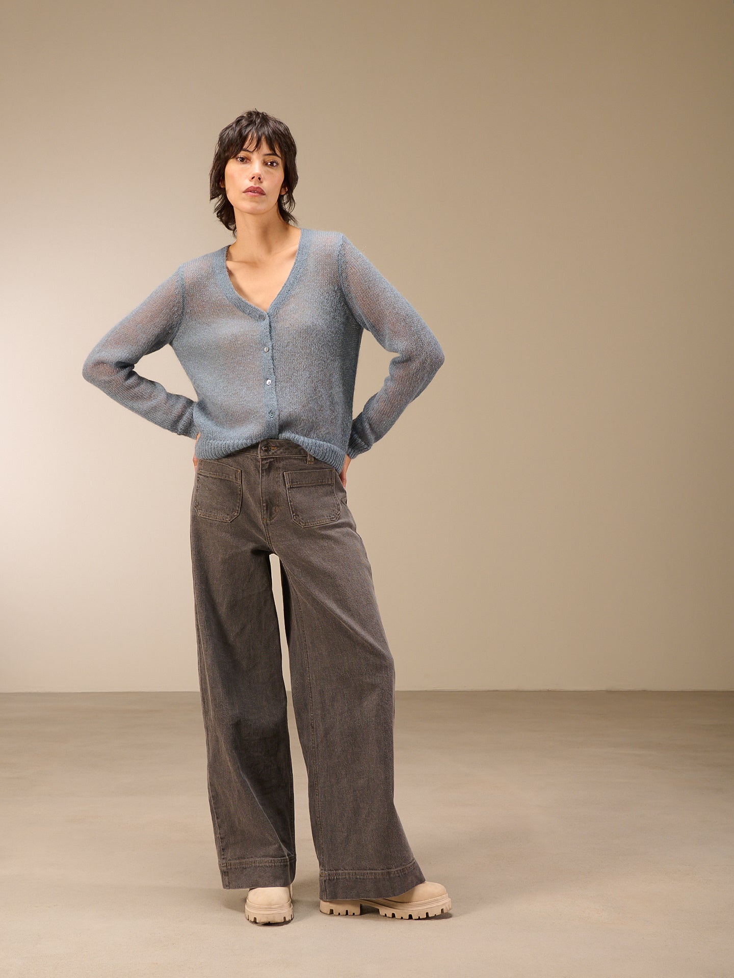 Locker geschnittene Strickjacke mit schmalen Schultern und V-Ausschnitt in leicht transparenter Optik. Ton-in-ton Perlmutt-Knöpfe dienen als Verschluss, Rippen-Borte an Ärmel und Saum.