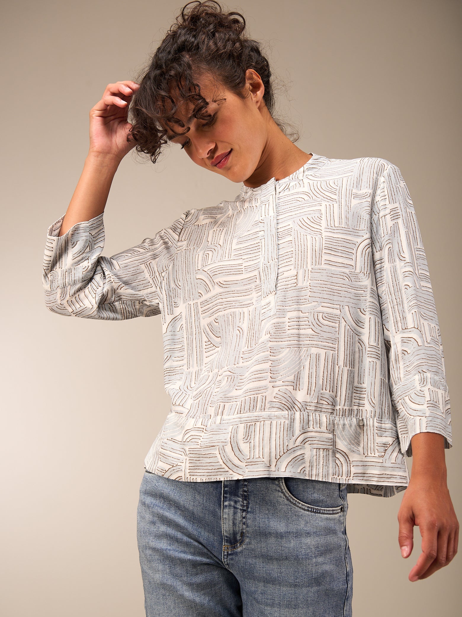 Slightly cropped, boxy blouse with a stand-up collar, short concealed button placket and straight 3/4-length sleeves. The matching hand-drawn all-over print and the soft, flowing, opaque material round off the blouse's look.