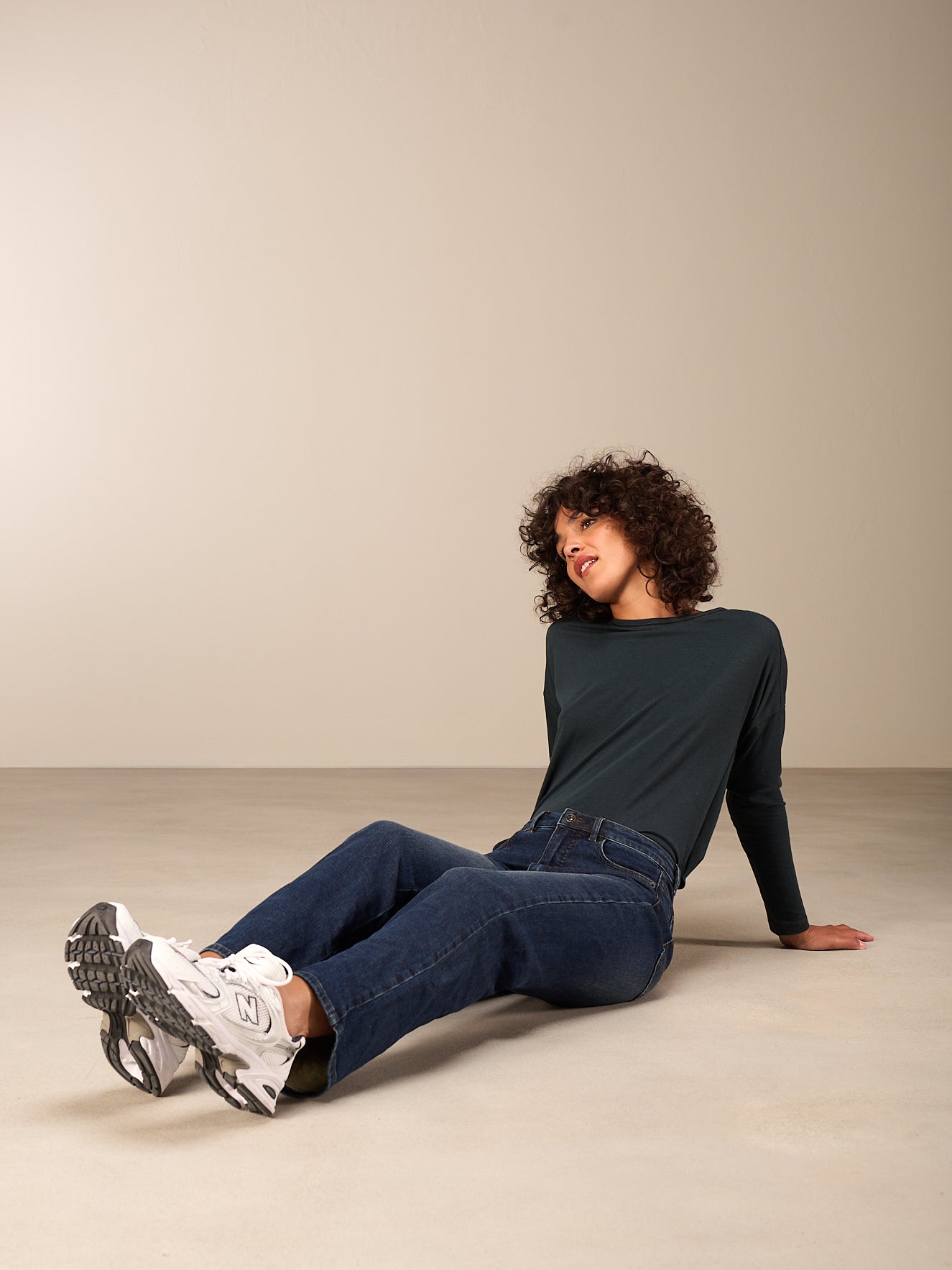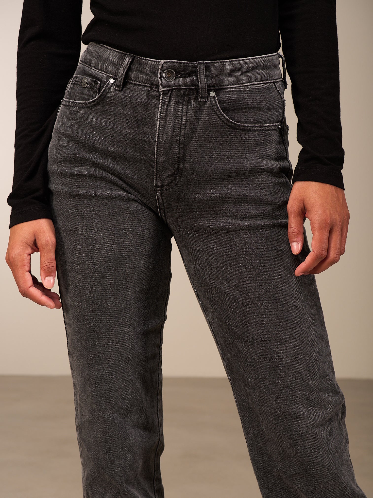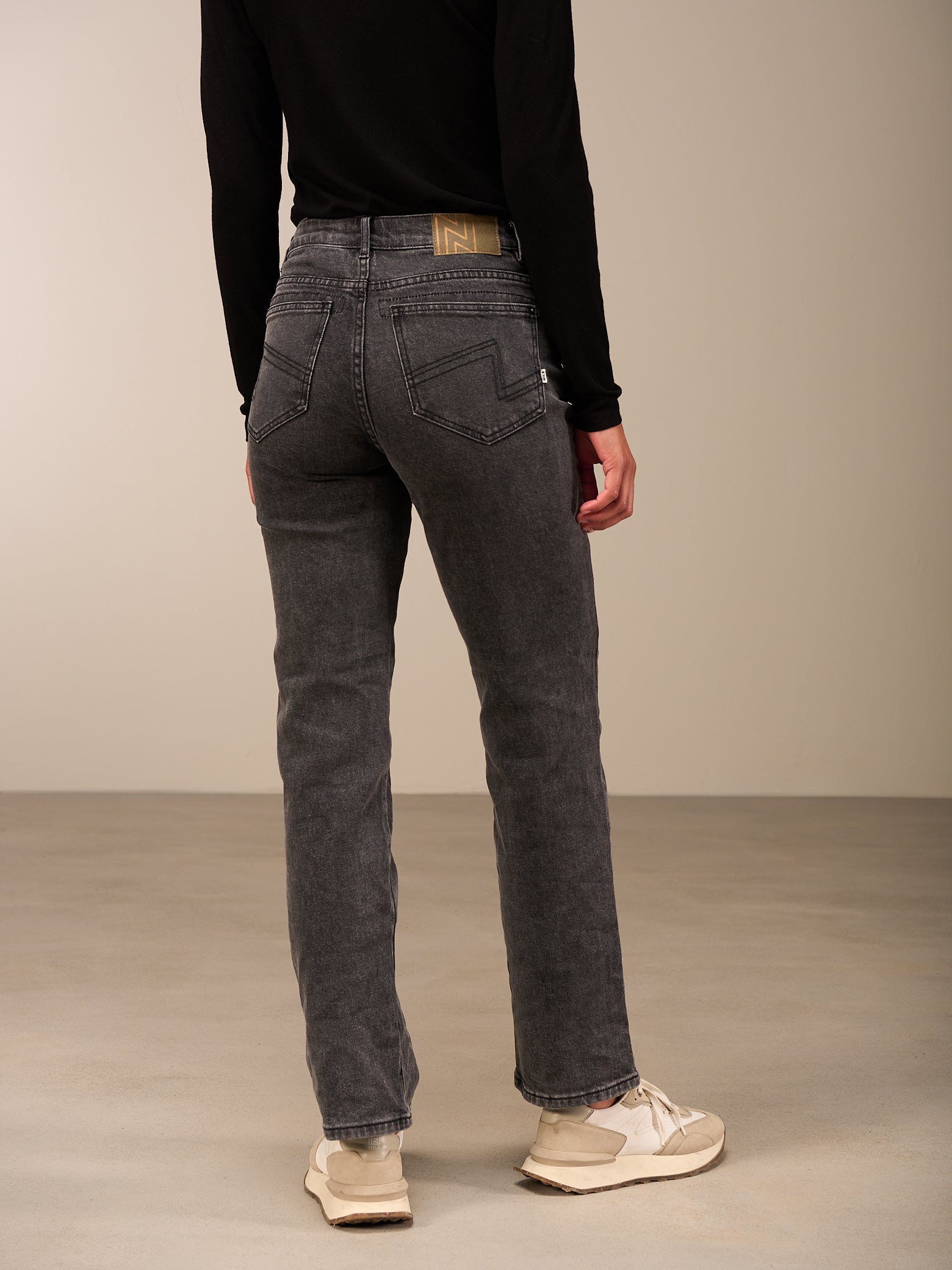 Fitted trousers with a mid-rise waistband and straight leg. The trouser legs are finished on the inside with decorative bands on the turn-ups, which add extra flair when the jeans are rolled up. Sturdy denim with a slight stretch and classic demin wash combine style and comfort. Irregularities in colour and an increased fading effect are intentional and make the piece unique. The product may rub off on clothing and surfaces.