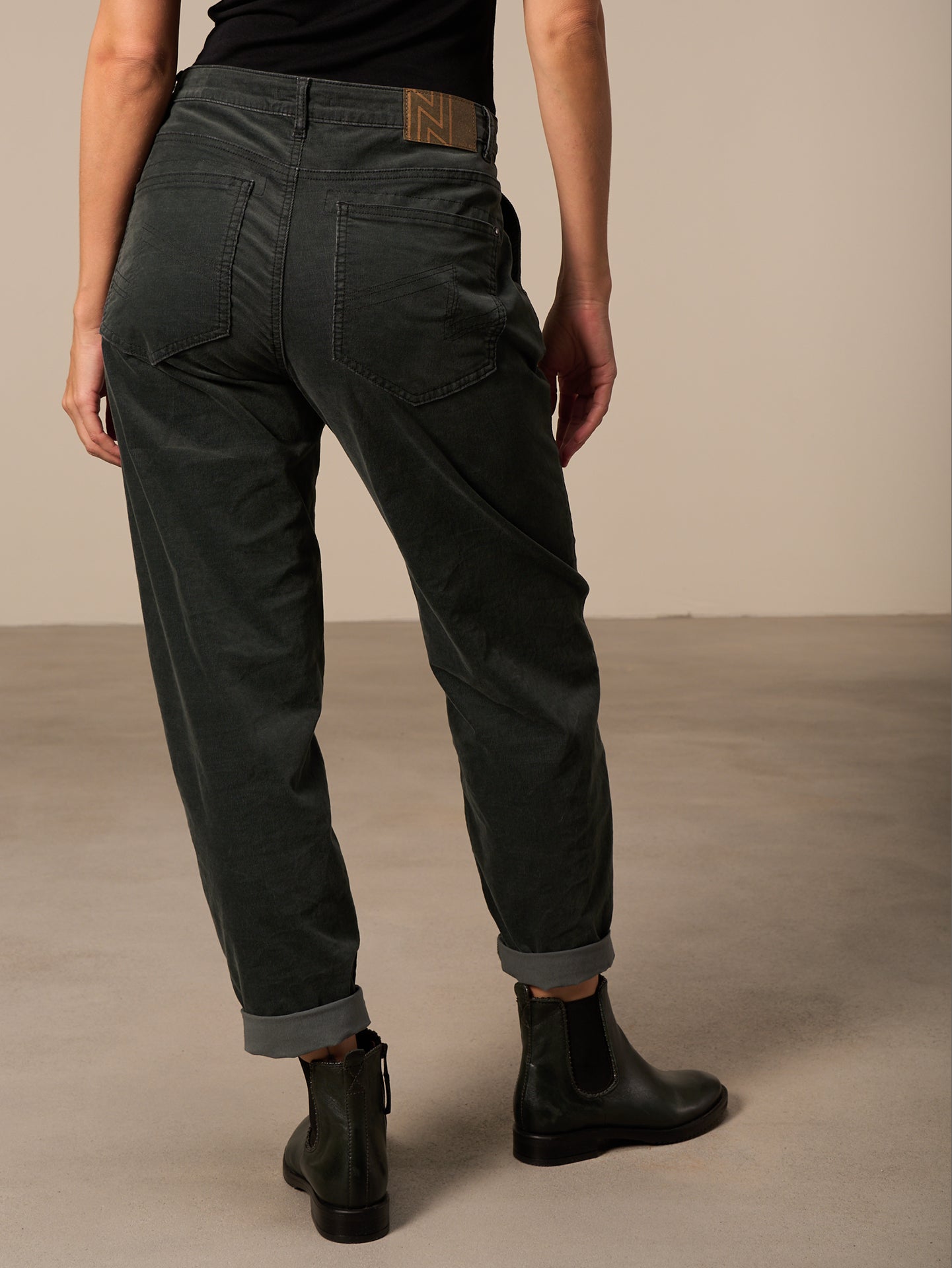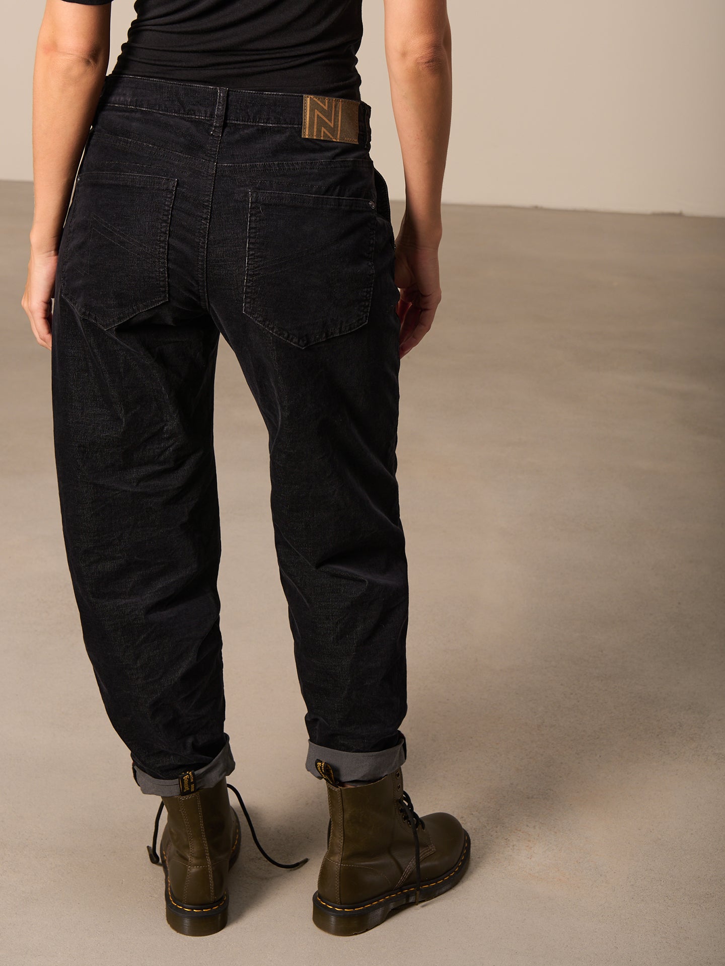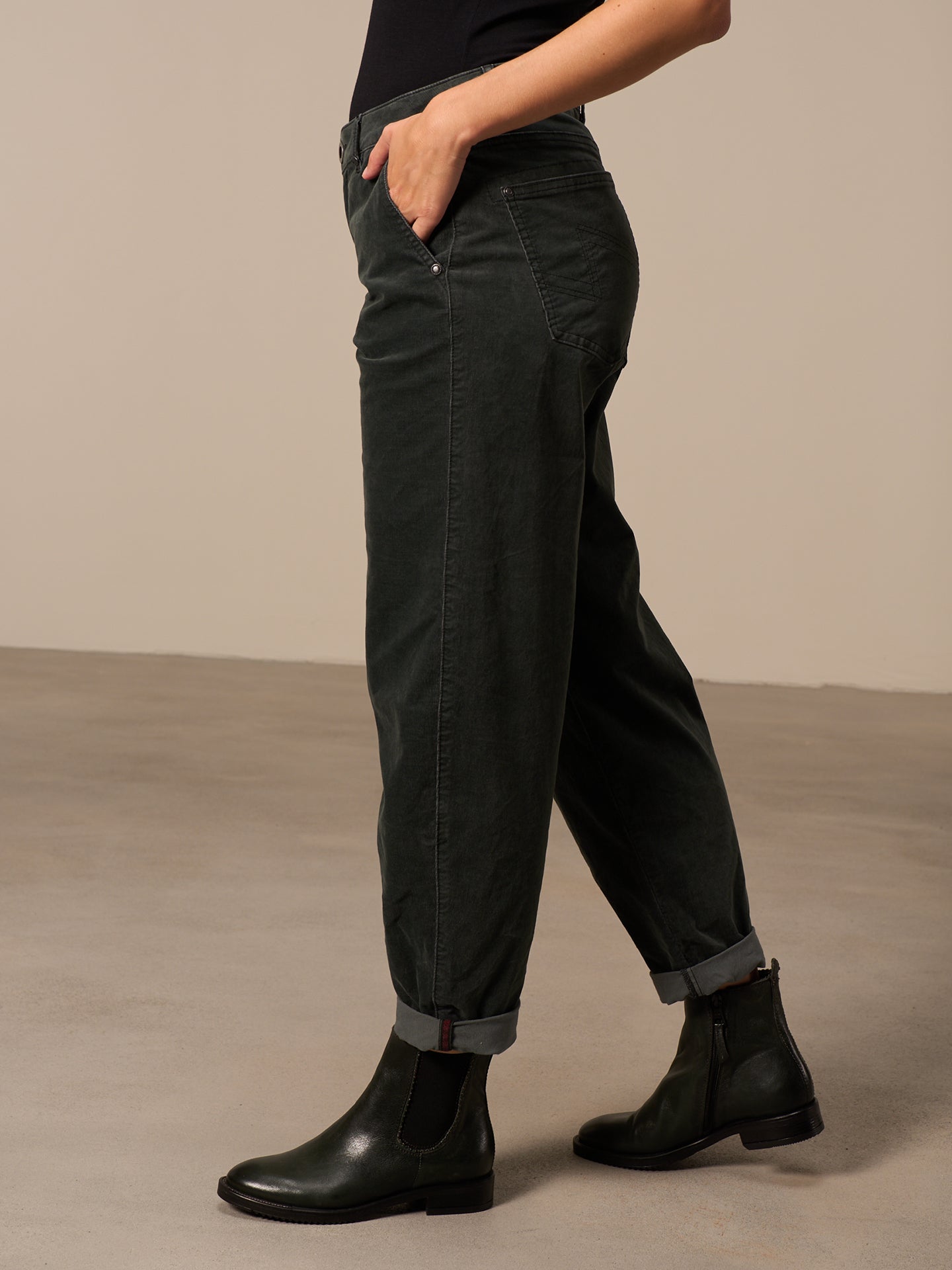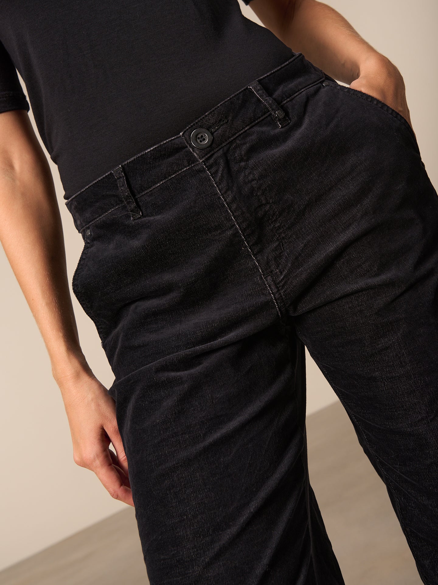 Loose-fitting trousers in fine-ribbed cord with trouser legs in a trendy O-shape. Material blend with certified organic cotton and recycled polyester in a very comfortable stretchy babycord fabric.