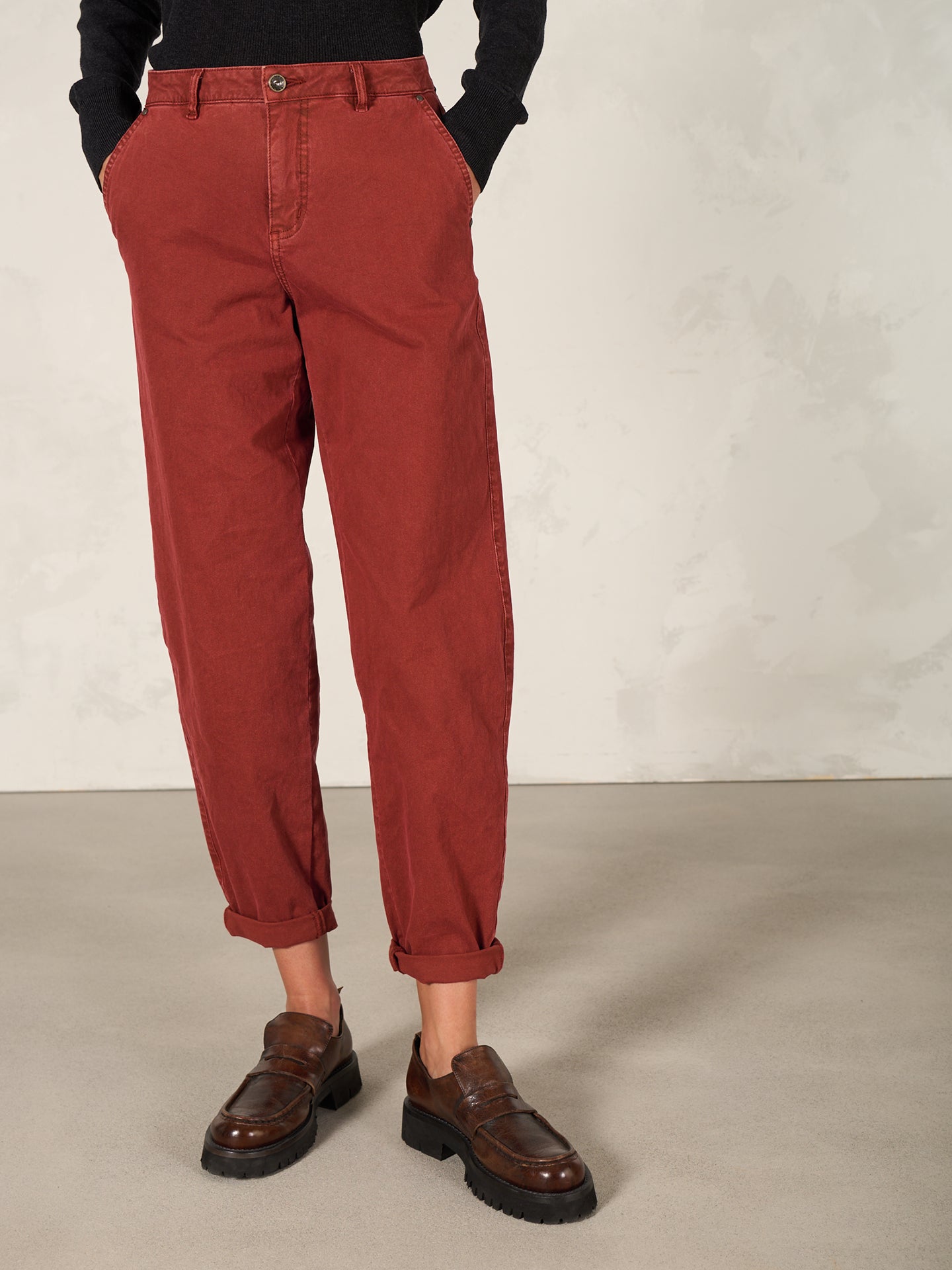 Loose-fitting trousers in a trendy O-shape with rolled-up trouser legs, decorative ribbons on the turn-ups and embroidery on the pocket openings for added style.