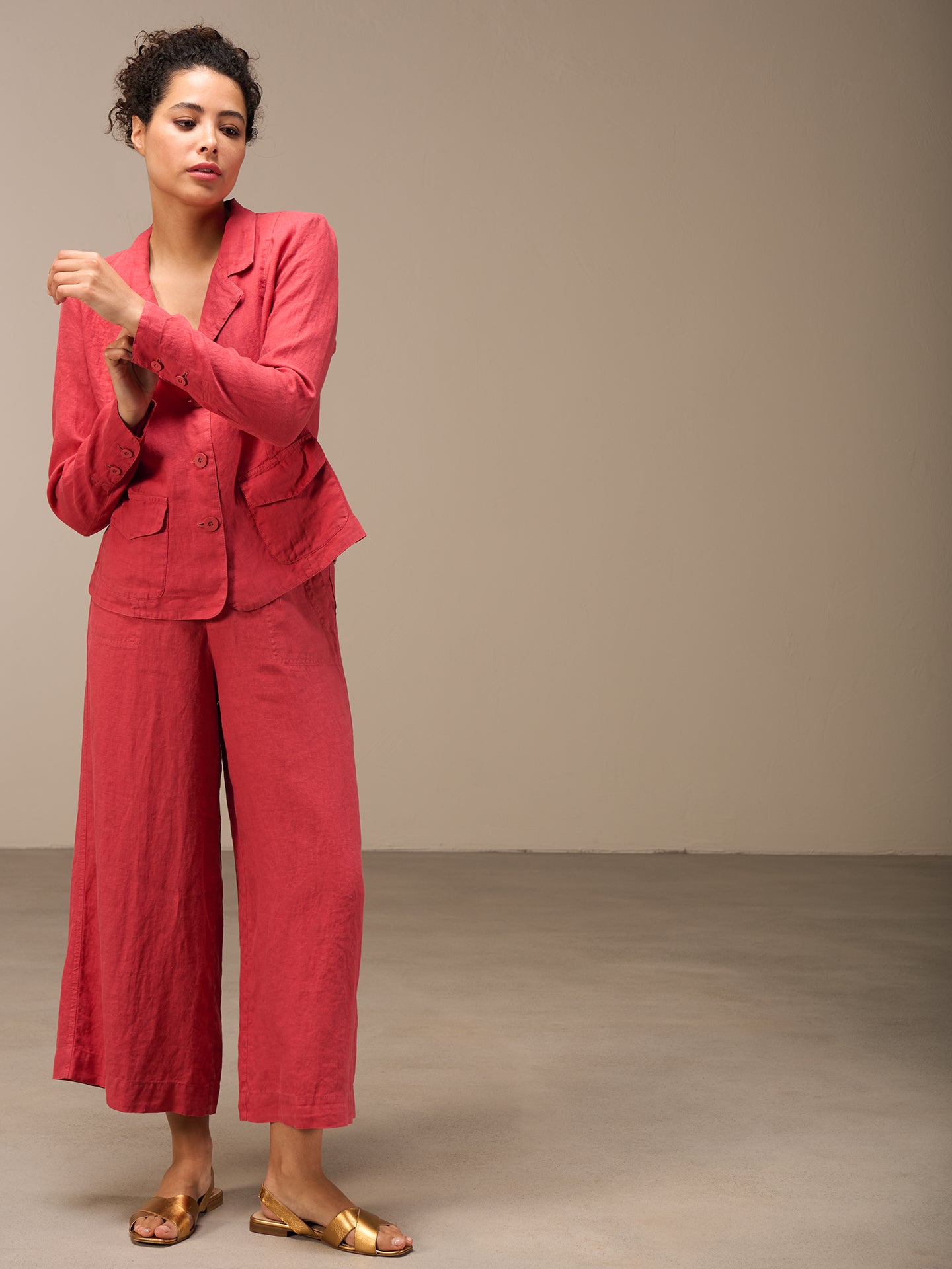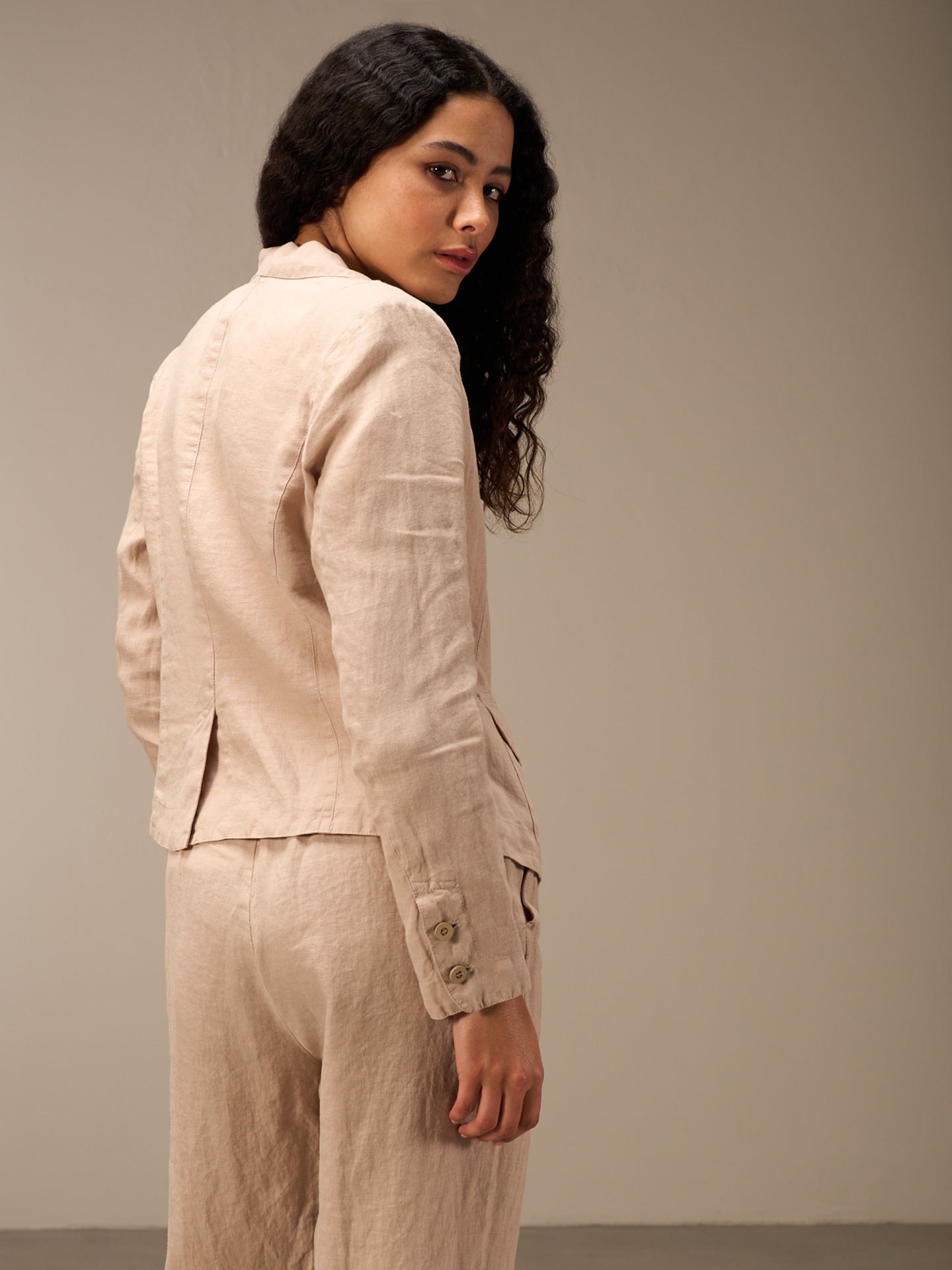 Tailored buttoned blazer with a narrow lapel collar and patch pockets with small flaps. The small shoulder pads ensure a perfect fit. The 100% linen fabric ensures ideal comfort even in summer temperatures.