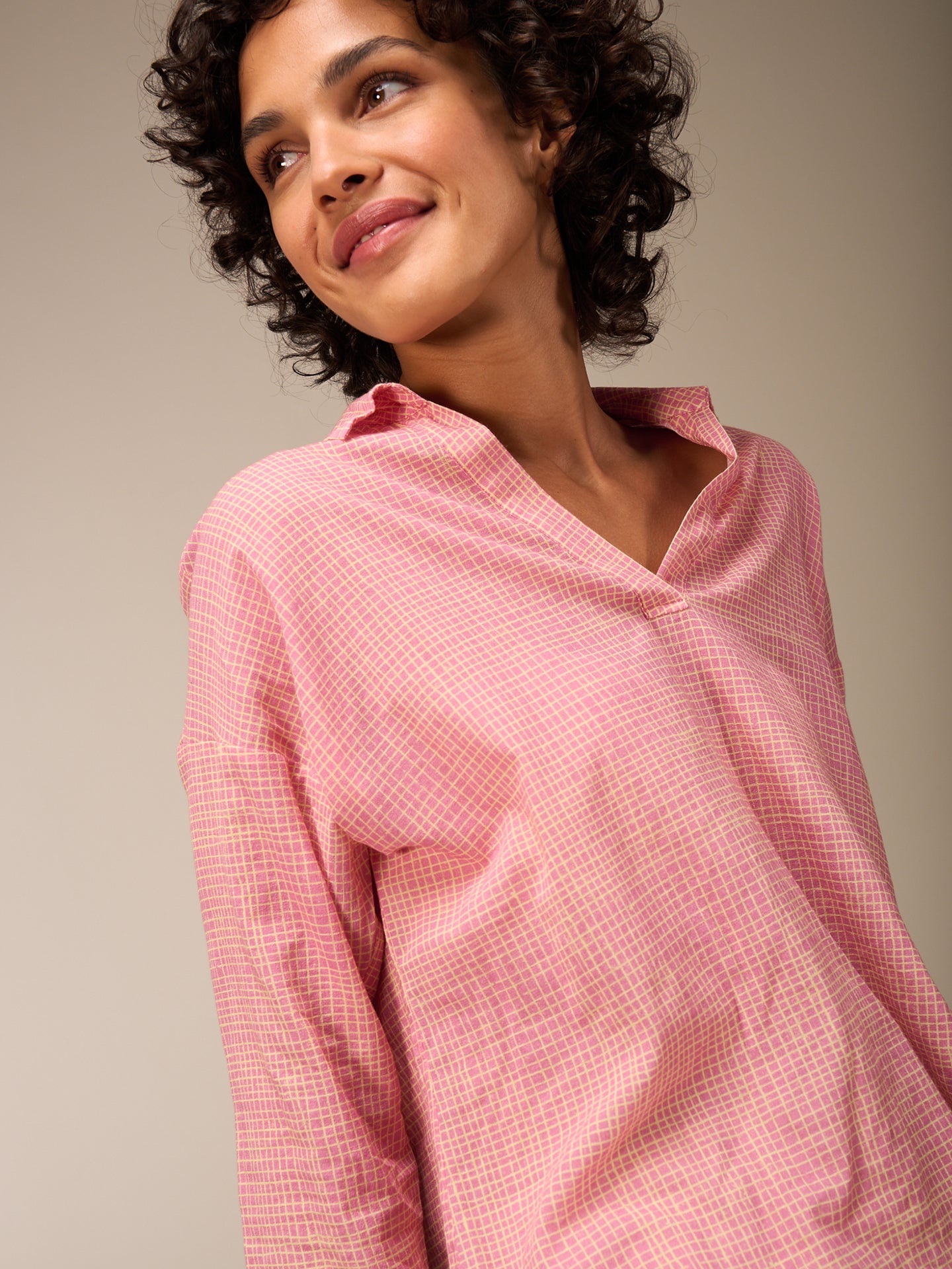 Everyday shirt blouse with a V-neckline and wide 3/4 sleeves made from comfortable summer-weight 100% certified organic cotton.
