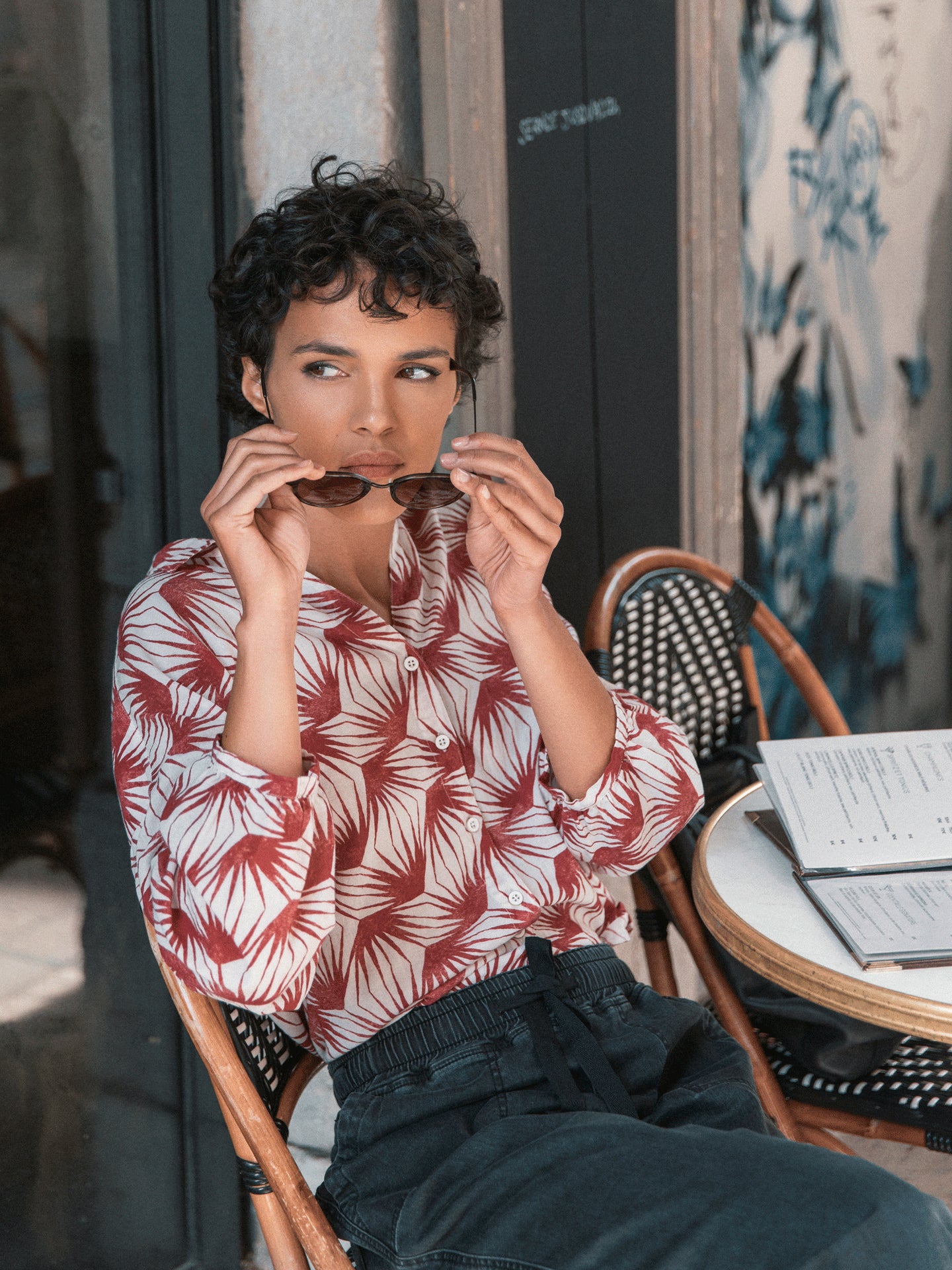 Airy button-through blouse with elegant wooden buttons in a graphic all-over print with a chemise collar and voluminous long sleeves. 100% organic cotton from certified farms.