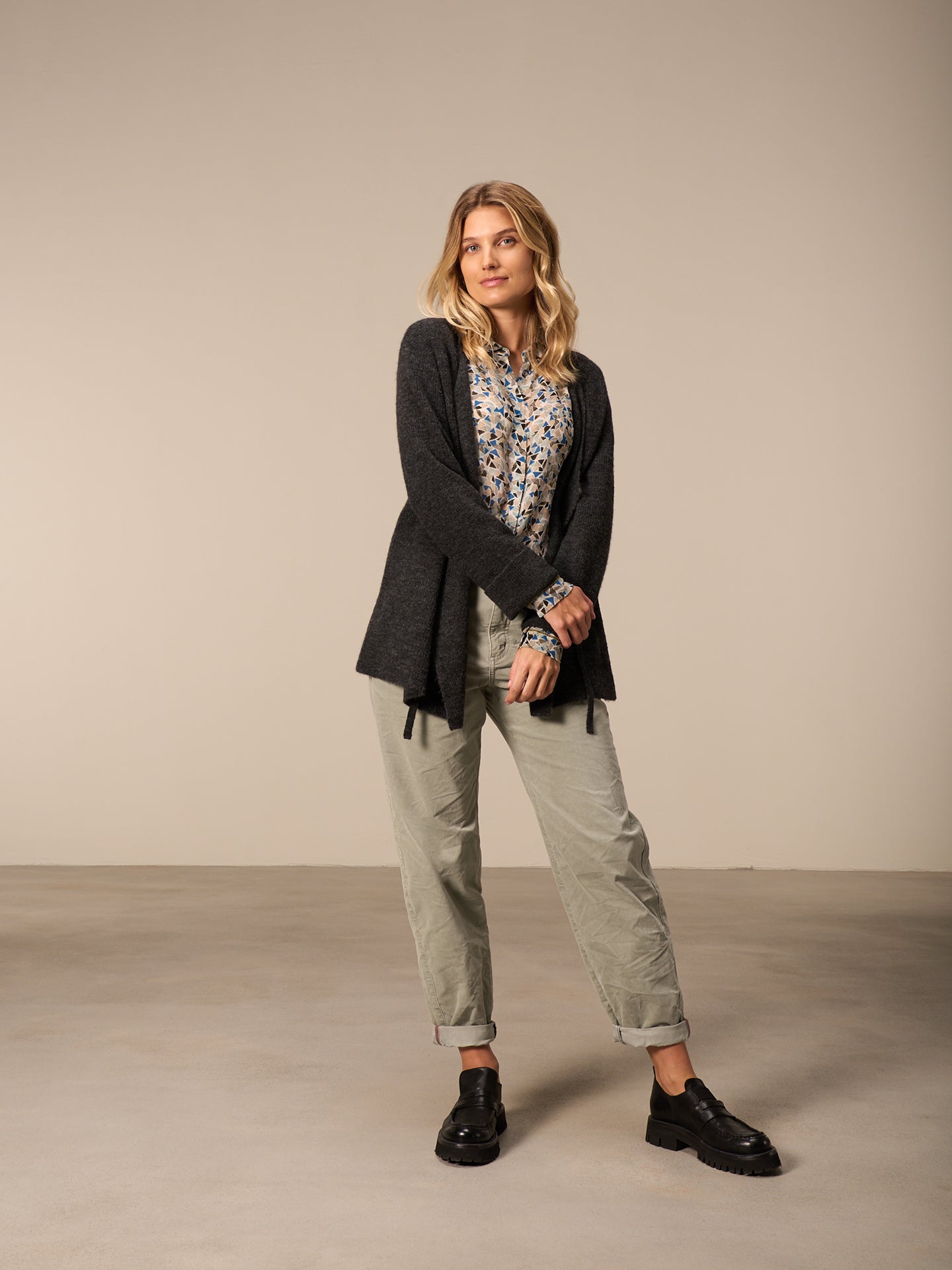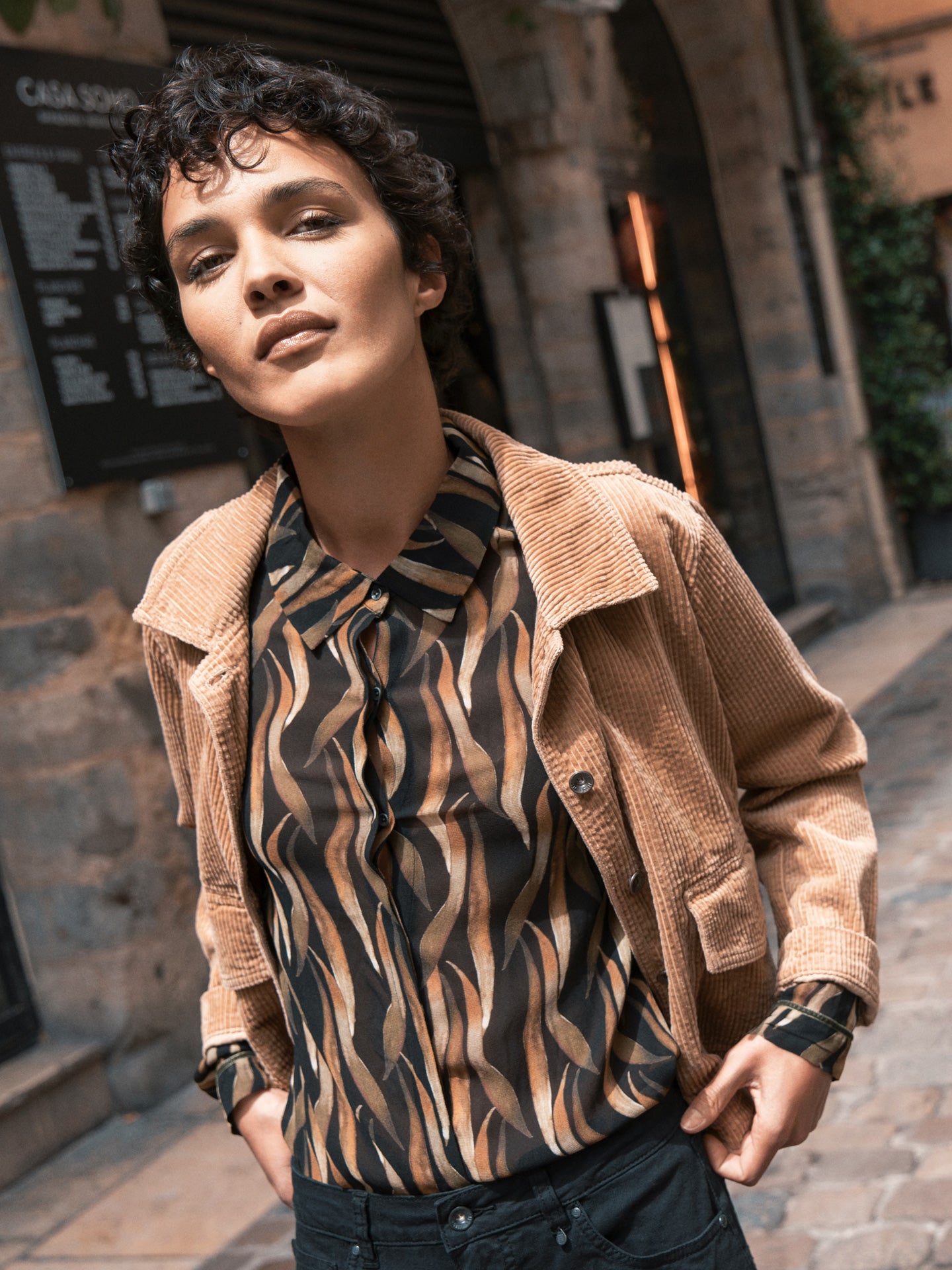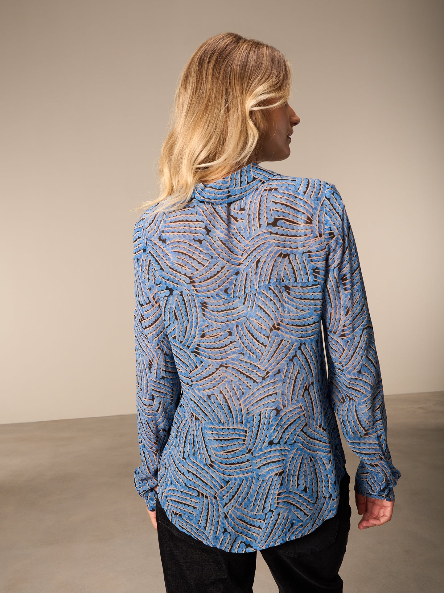 Button-through tailored shirt collar blouse with a hidden button placket and long sleeves in a popular chiffon fabric with a hand-drawn all-over print.