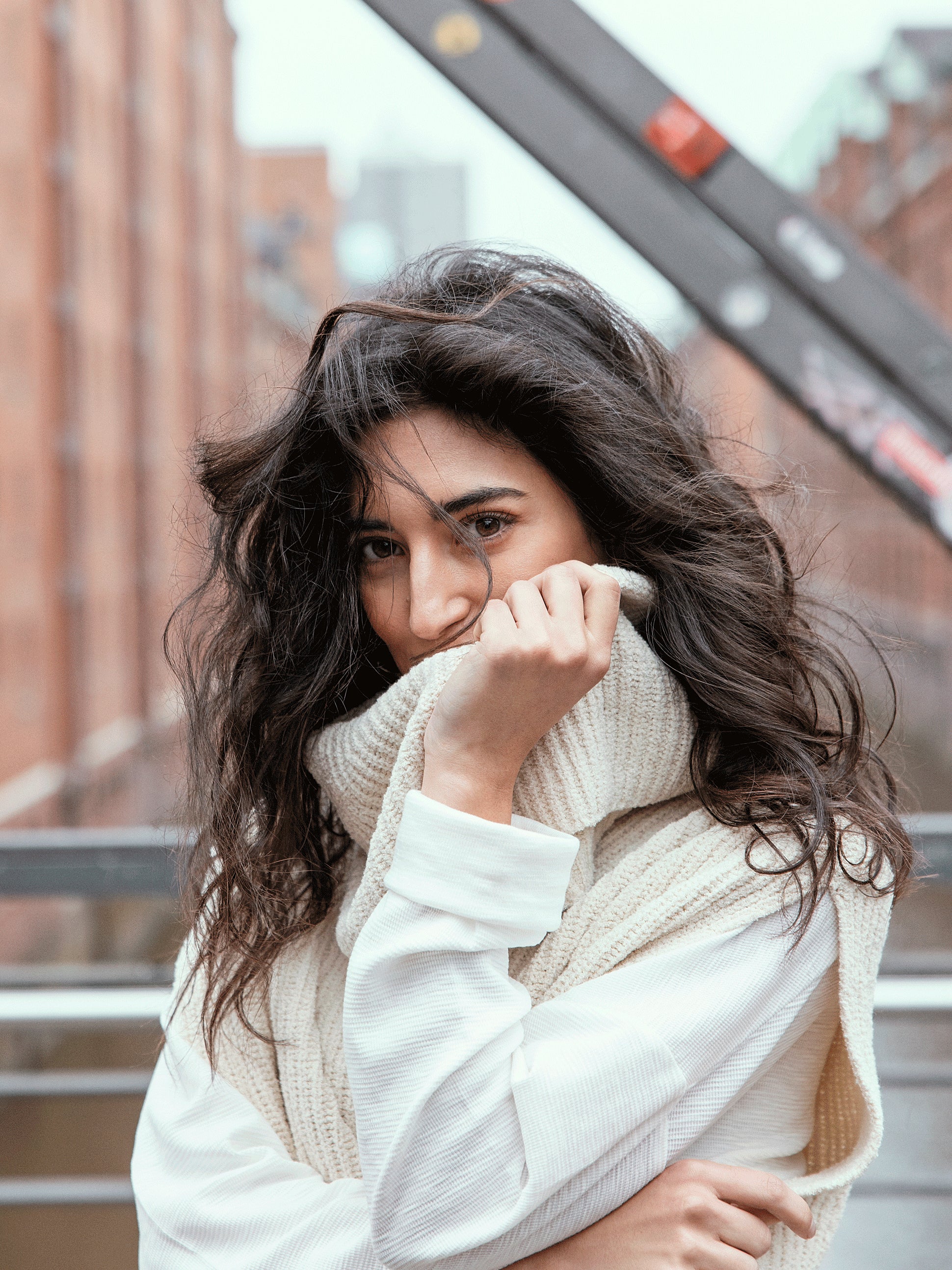 Loose-fitting tubular collar in a half-patent pattern in special fluffy bouclé yarn. Ideal as an addition to a jumper or jacket.