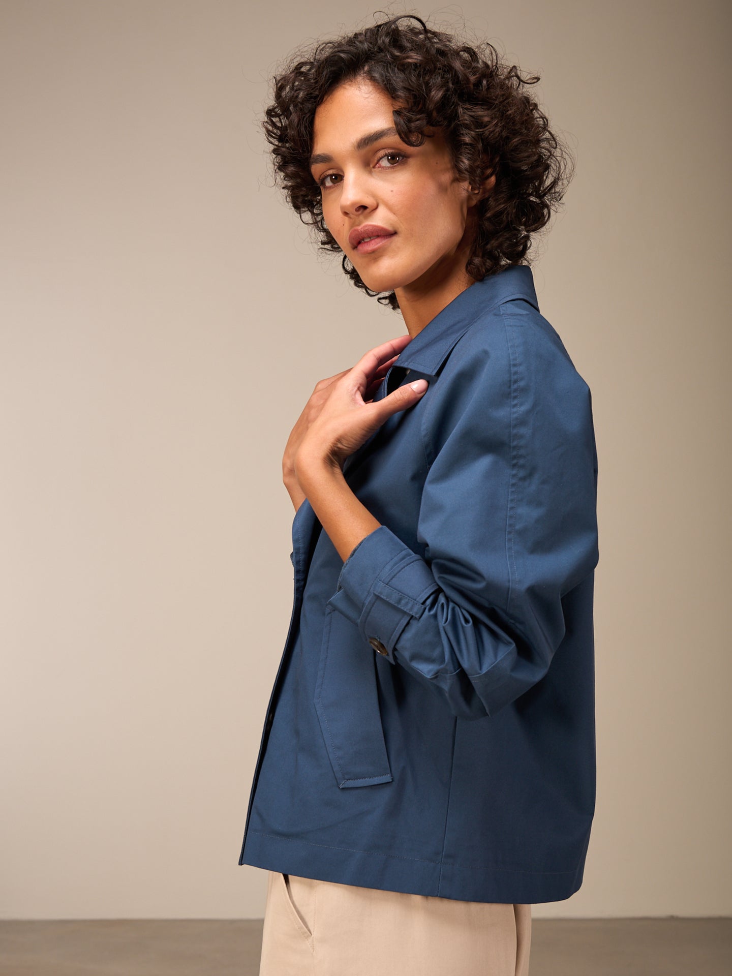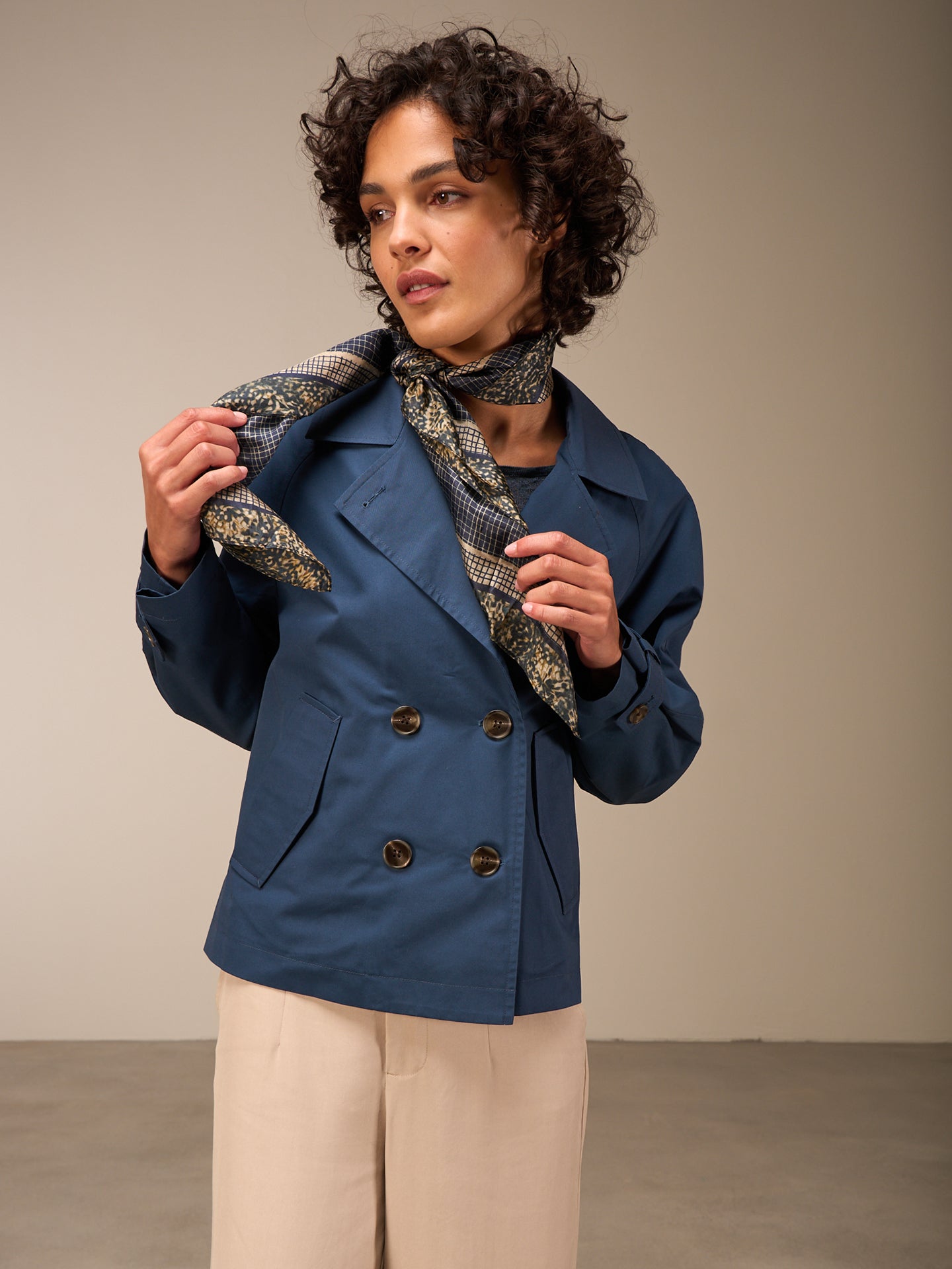 Trendy short, wide spring jacket in a water-repellent fabric in a casual A-shape with a reverse collar, double-breasted fastening and stylish fake horn buttons.