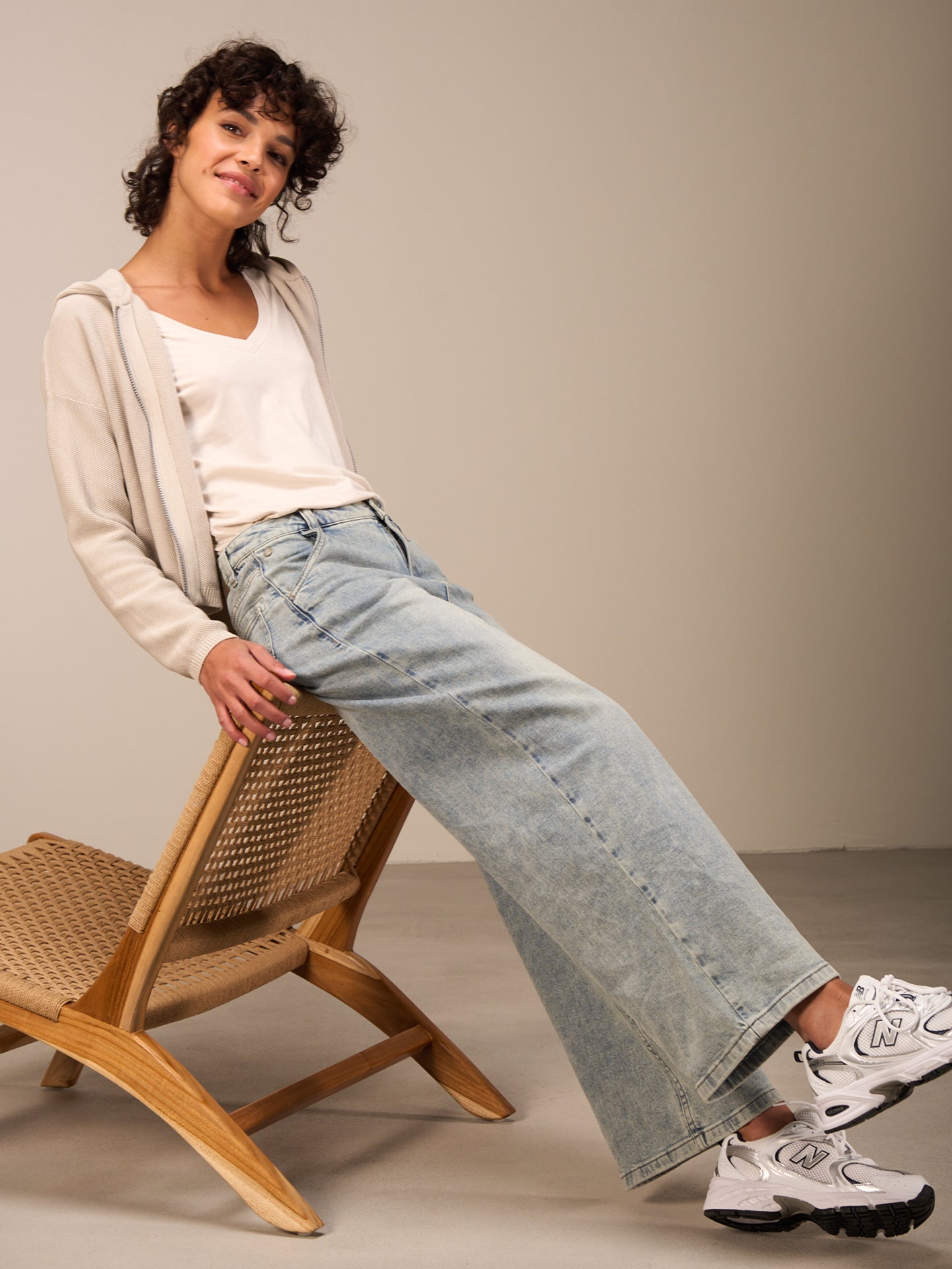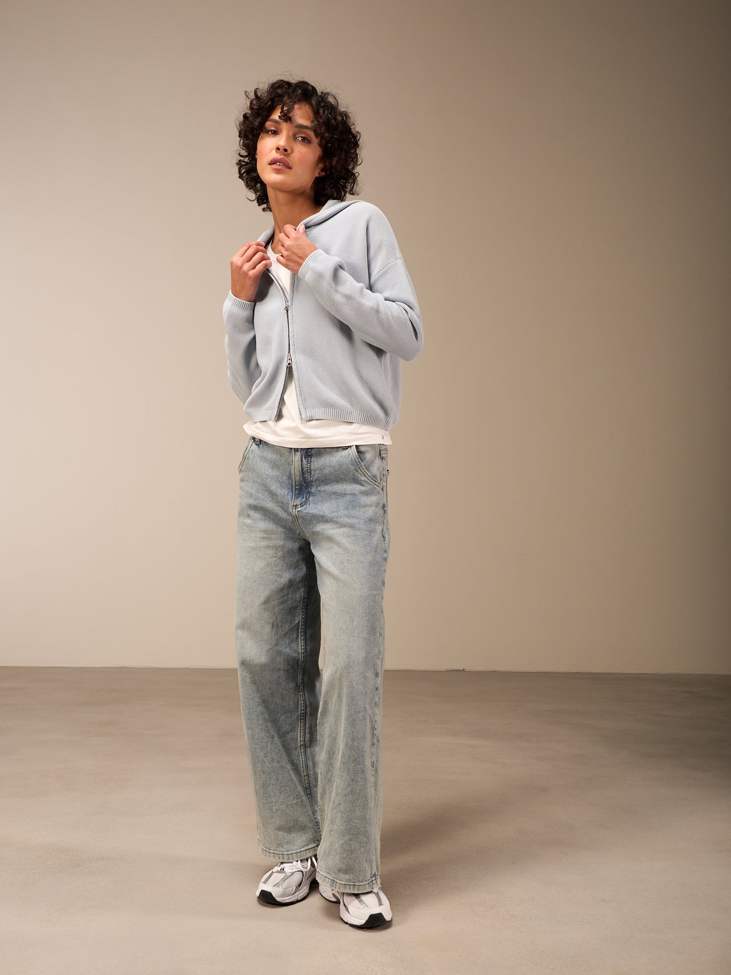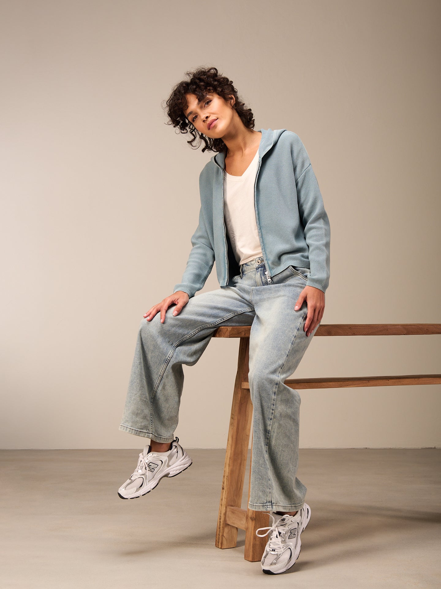 Sporty jacket knitted in a pearl pattern with two-way zipper and hood. Made of 100% GOTS certified organic cotton.