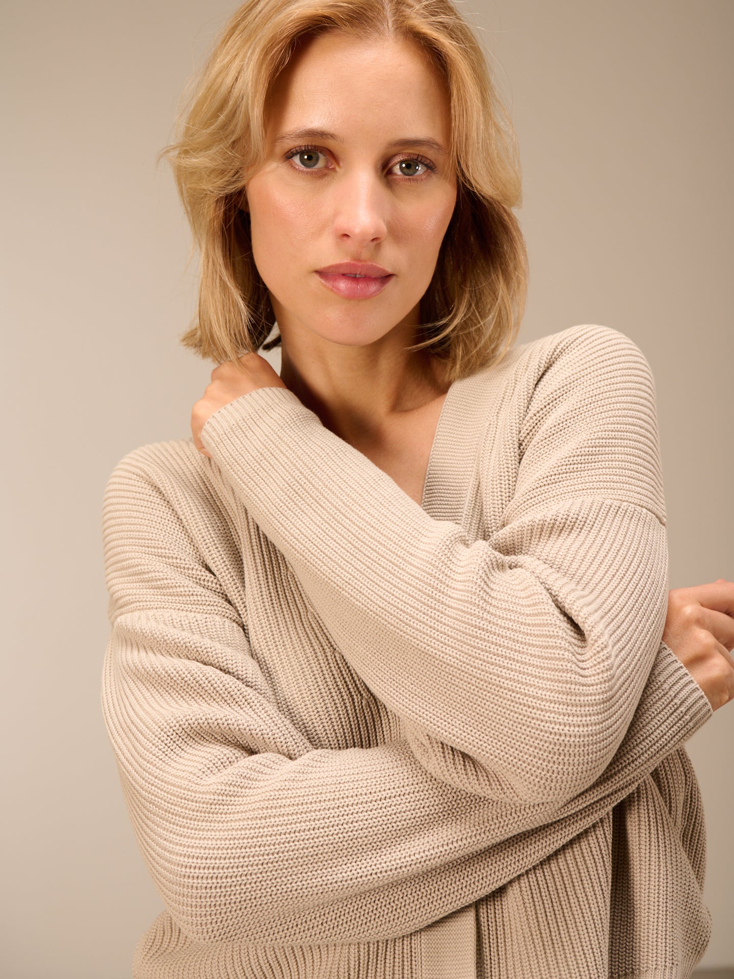 Loose-fitting cardigan with a V-neck in a ribbed look and decorative waistband. Piece-dyed. Irregularities in the color make each piece unique. The fading effect is enhanced.