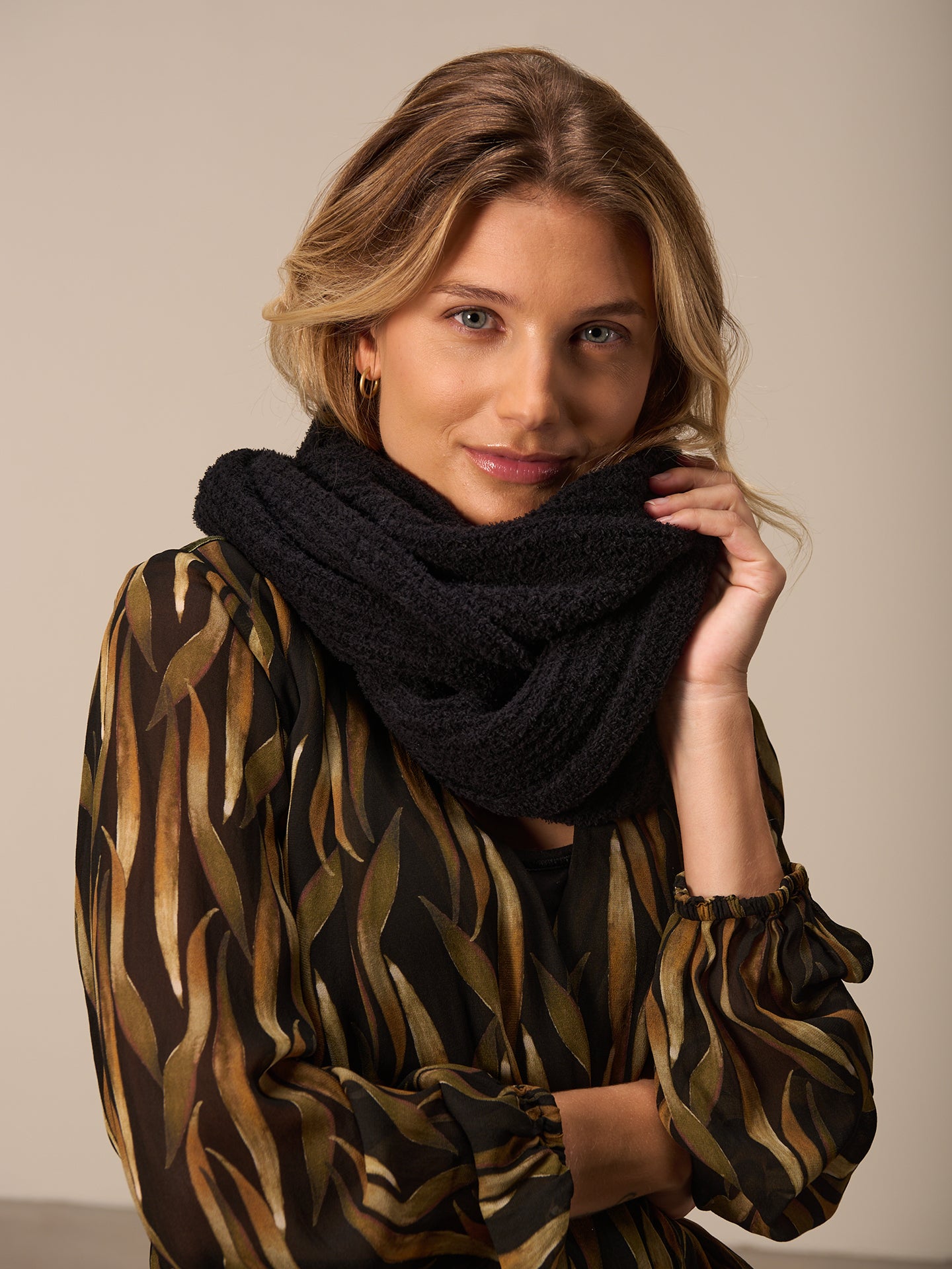 A round scarf knitted in a patented pattern from special towelling yarn. 80% certified organic cotton.