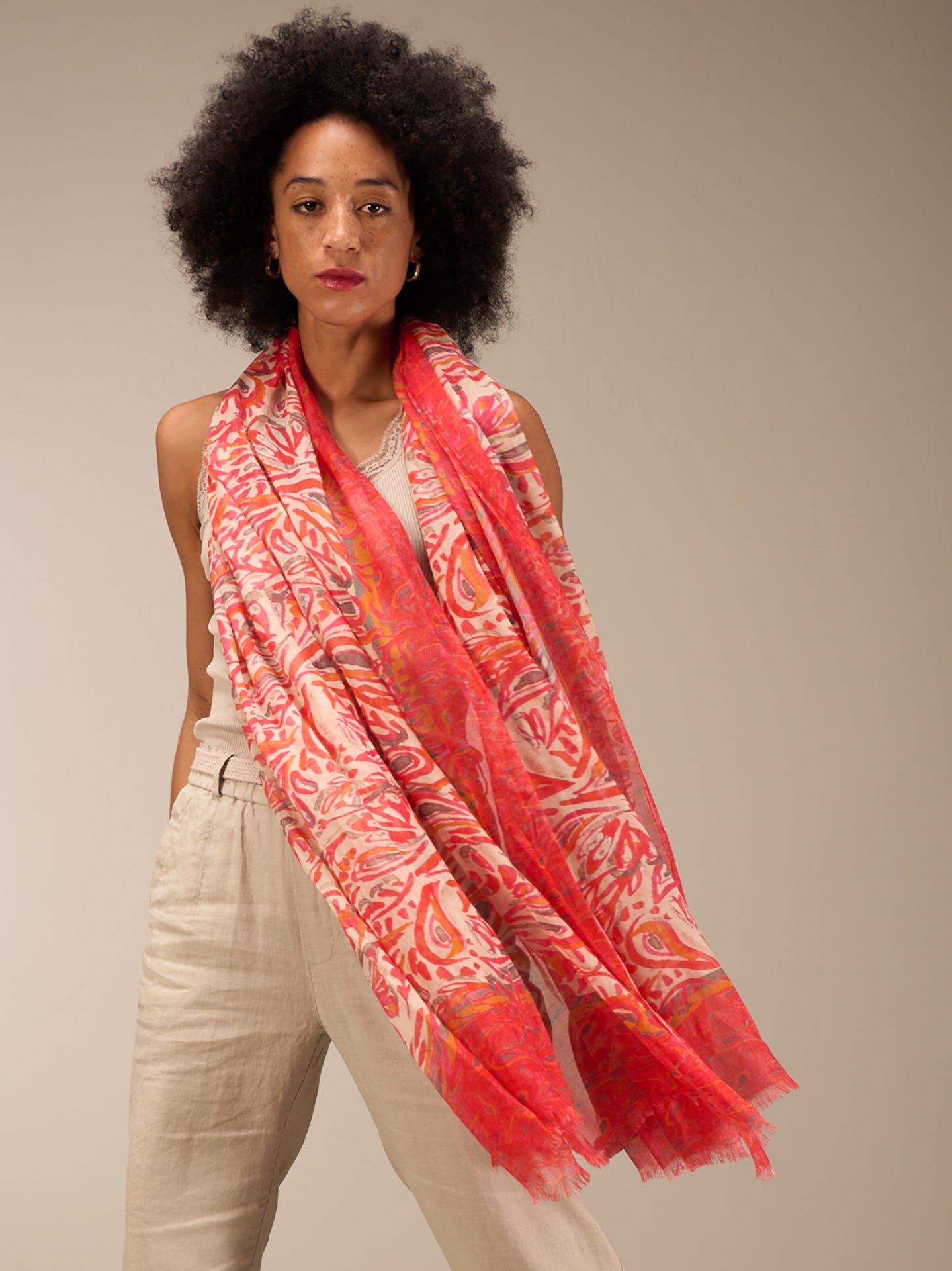 The large 120x200cm size is perfect for varied styling. Casually draped around the neck and shoulders, this scarf will instantly enhance any outfit and become a favourite accessory. The scarf is printed all over with hand-drawn prints and has shorter edges with fringes. 100% organic cotton from certified cultivation.