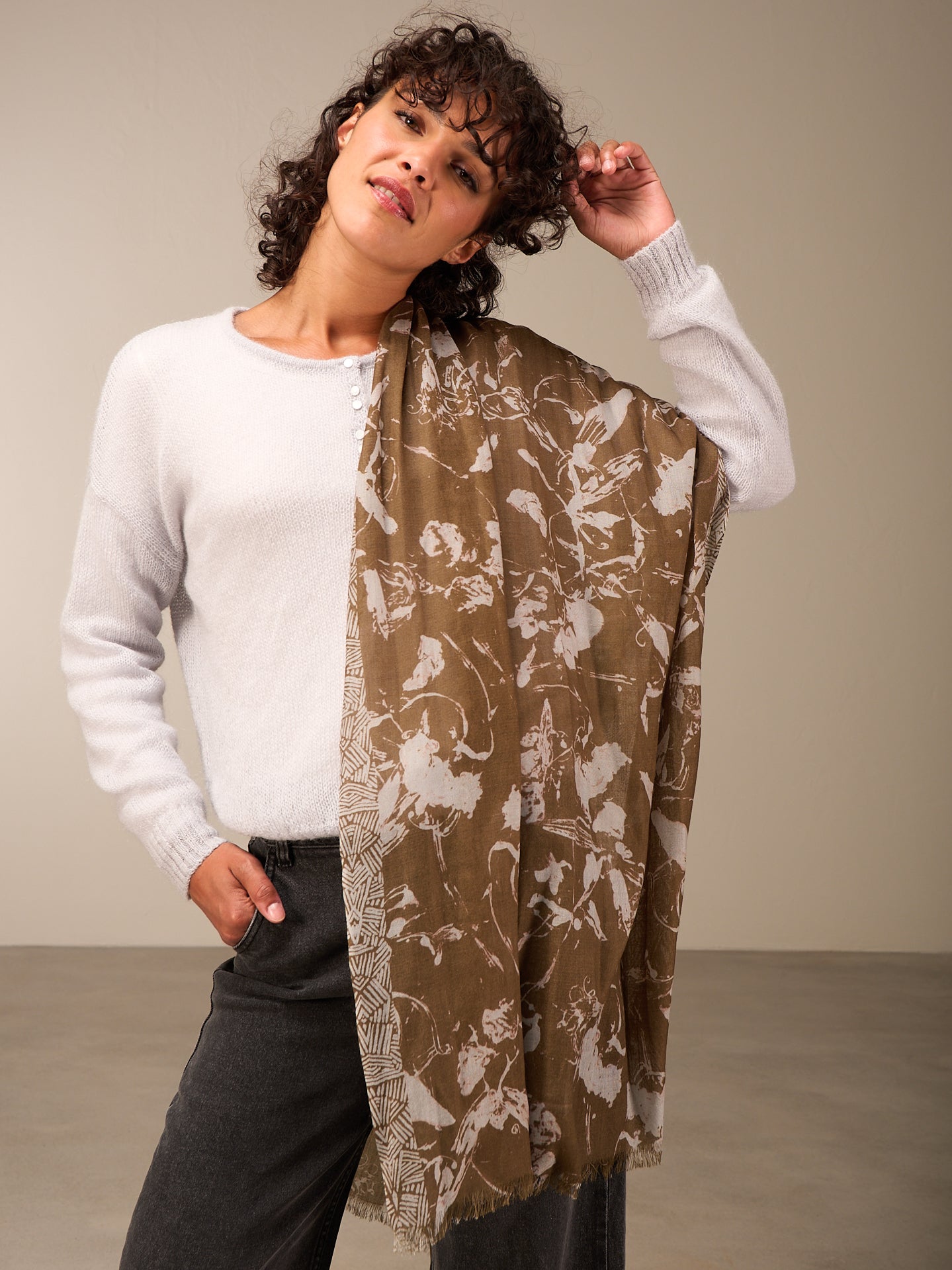 High-quality scarf with hand-drawn all-over print in the size 70x200cm. 100% wool with a woven edge and short fringes.