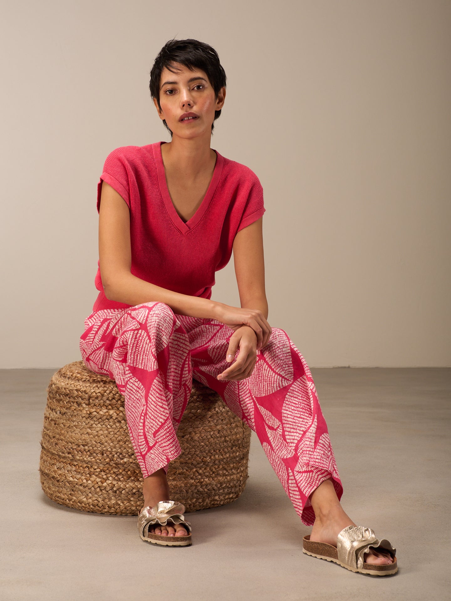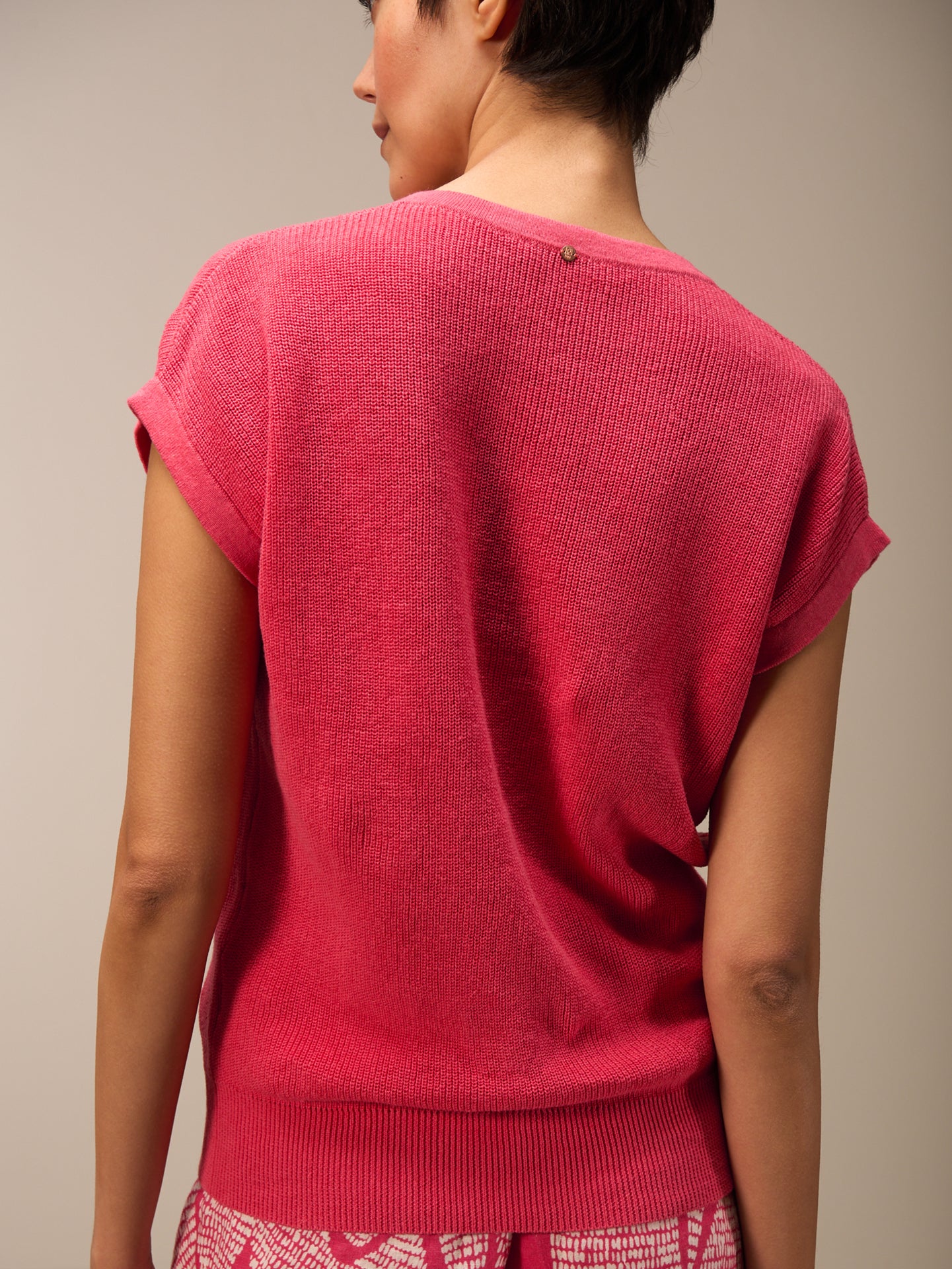 Short-sleeved pullover with a V-neckline and a special ribbed trim at the hem and armhole. The 55% linen and 45% cotton fabric ensures a high level of comfort.