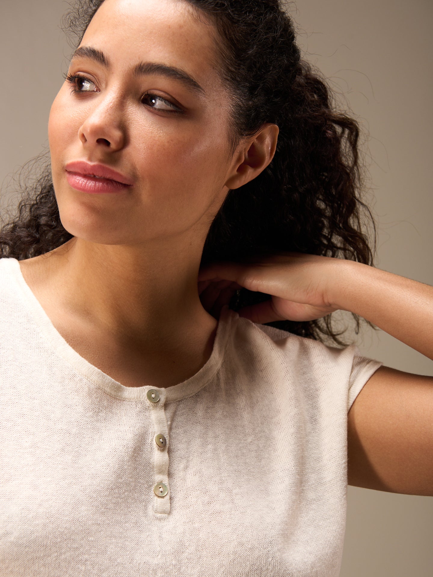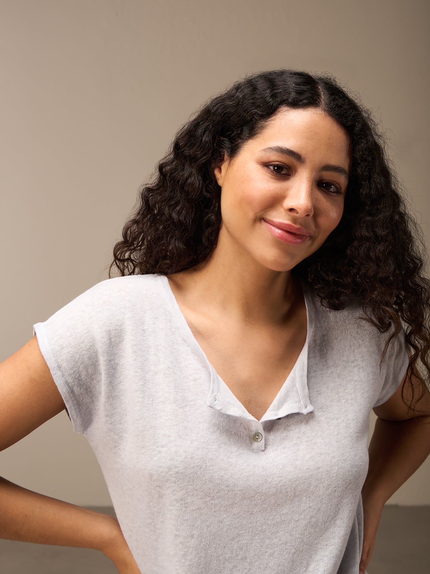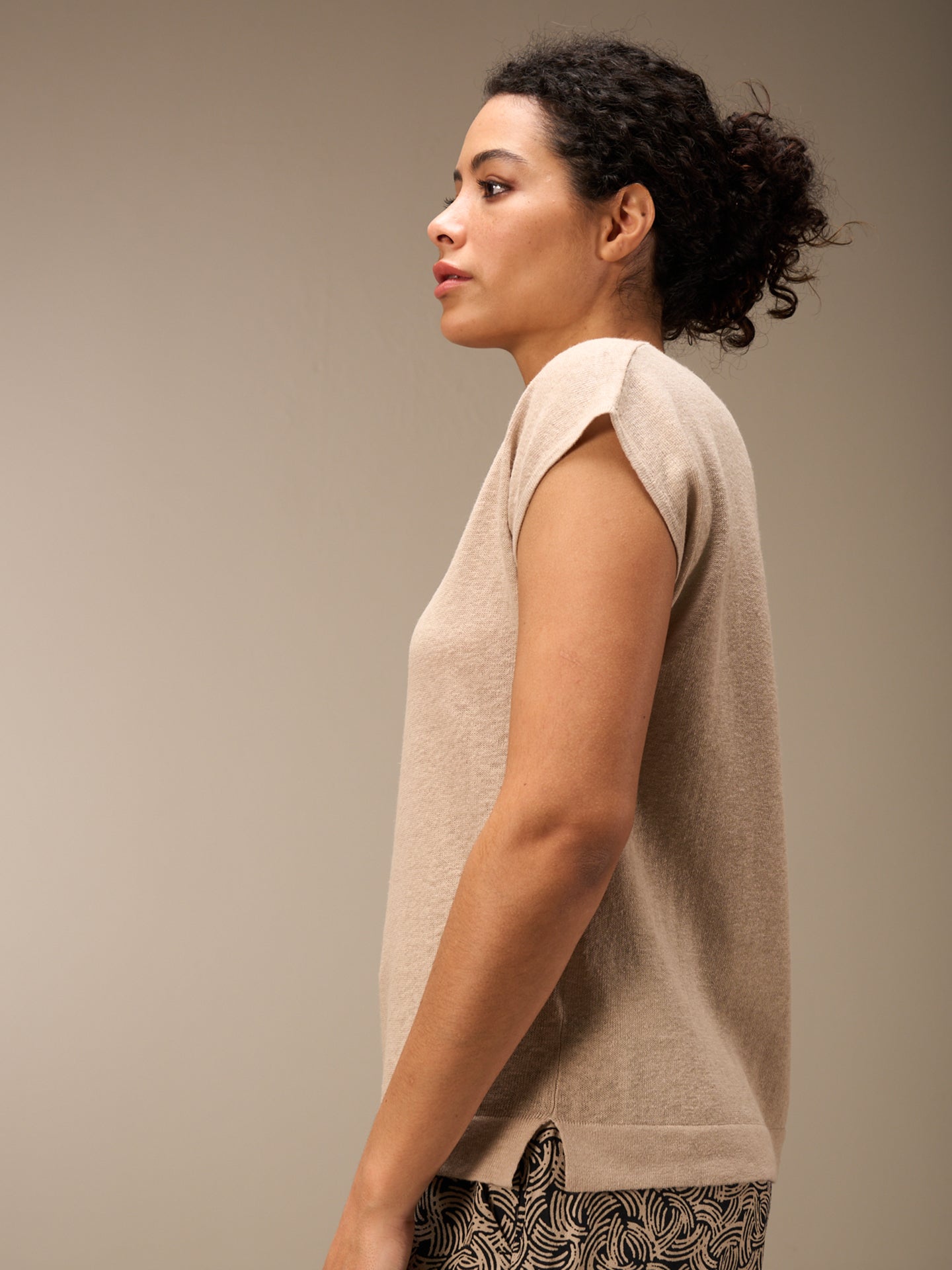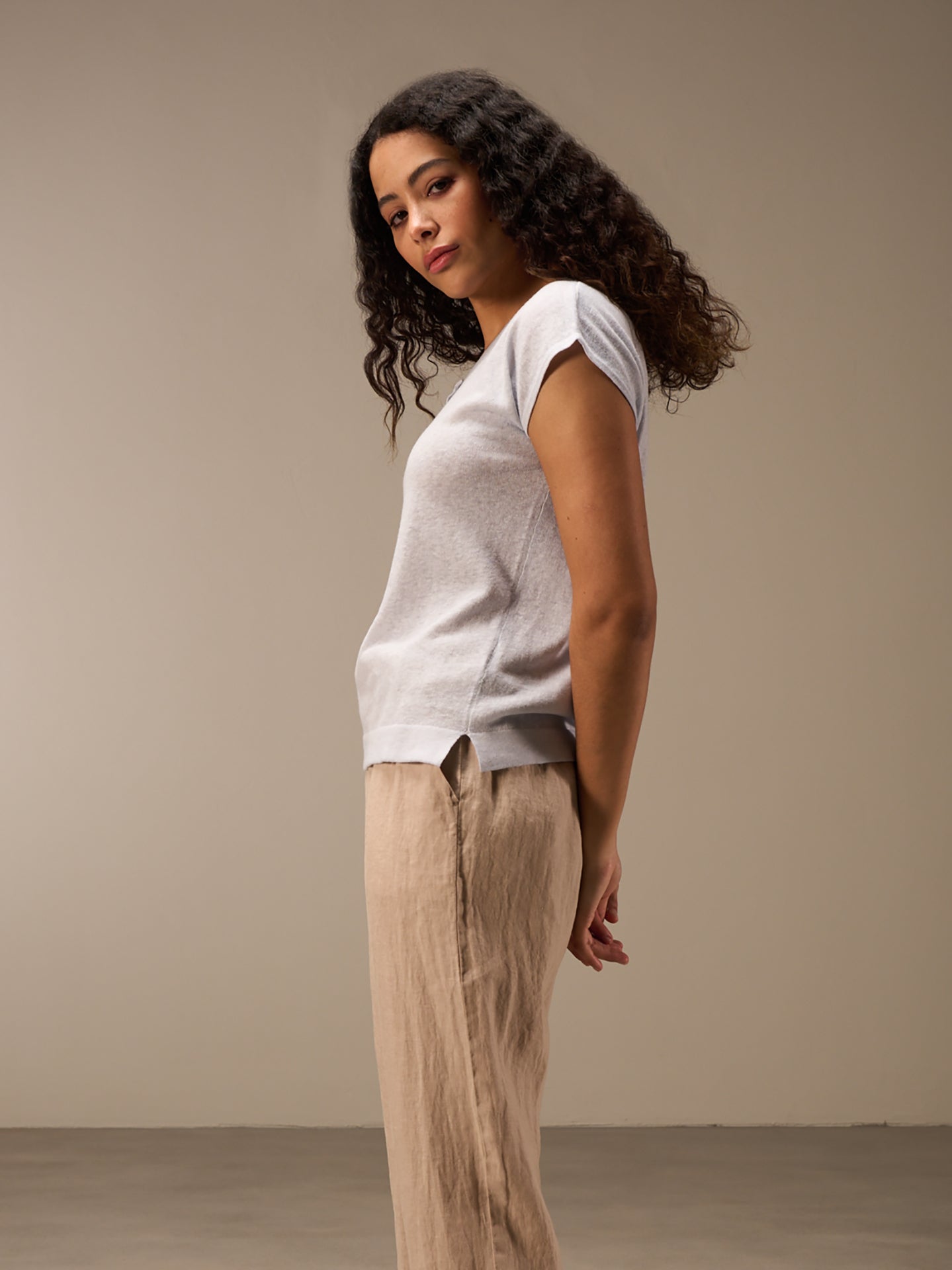 Fine sleeveless pullover with a round neck and high-quality tone-in-tone mother-of-pearl buttons made from a comfortable 100% linen knit. A special inside-out dyeing process lends the shirt a lovely look. Irregularities in the color mean that every piece is unique. The faded effect is enhanced.