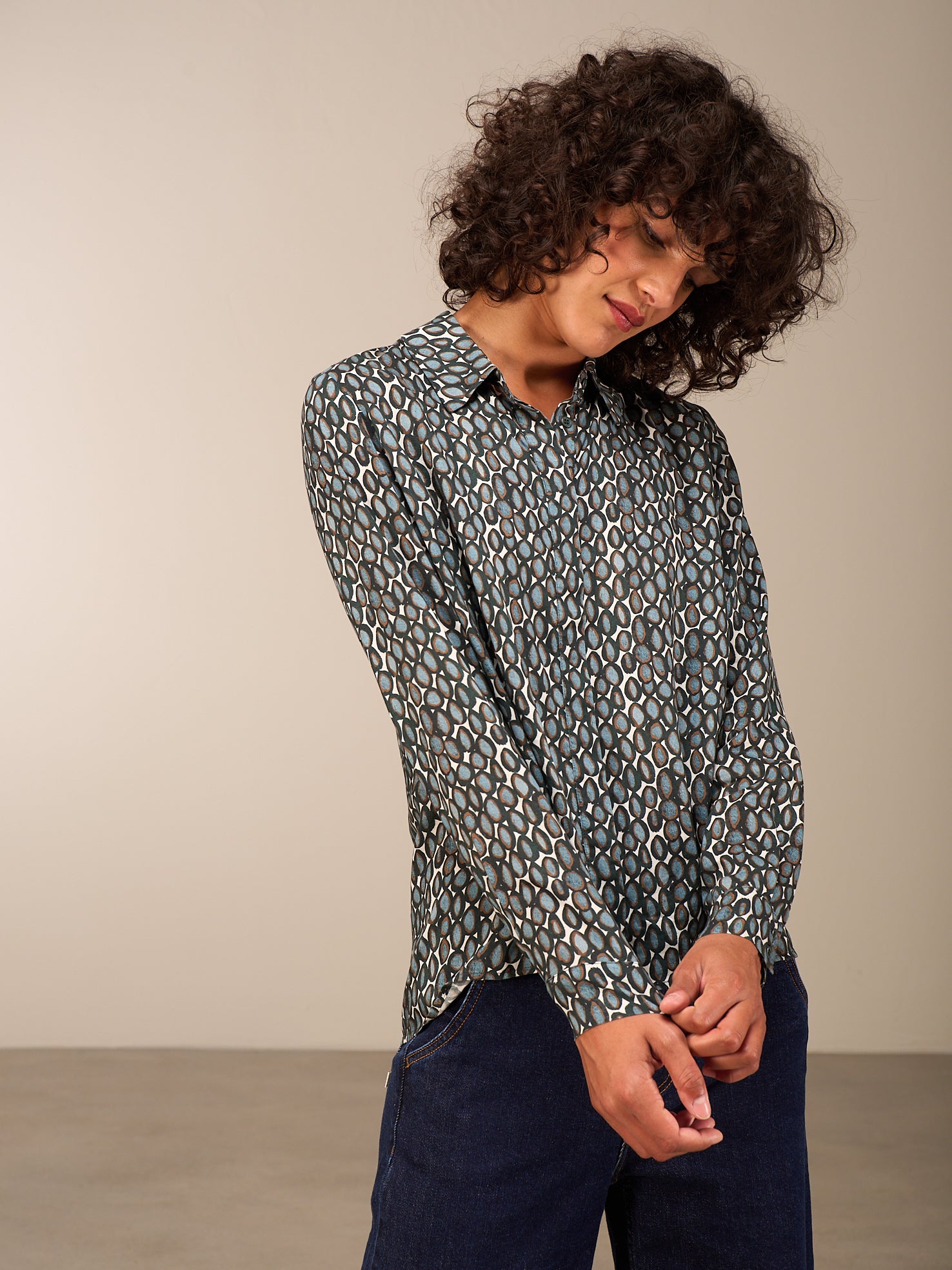 Chemisier à manches longues boutonné, avec patte de boutonnage cachée et boutons assortis, en ligne A confortable et imprimé allover dessiné à la main.