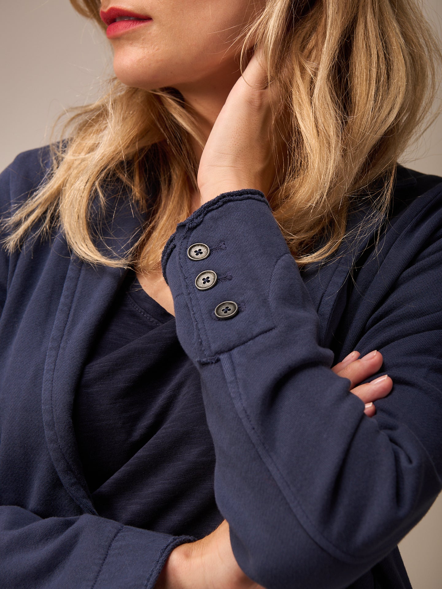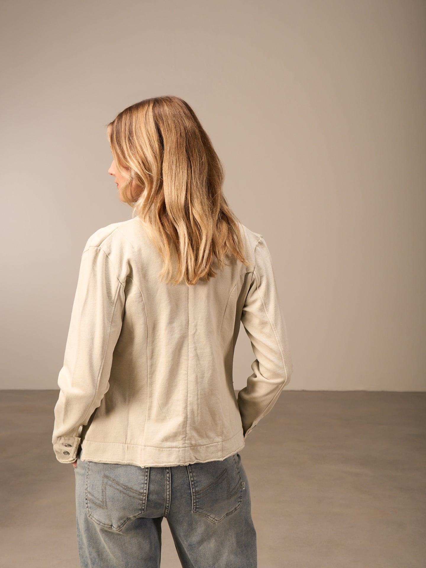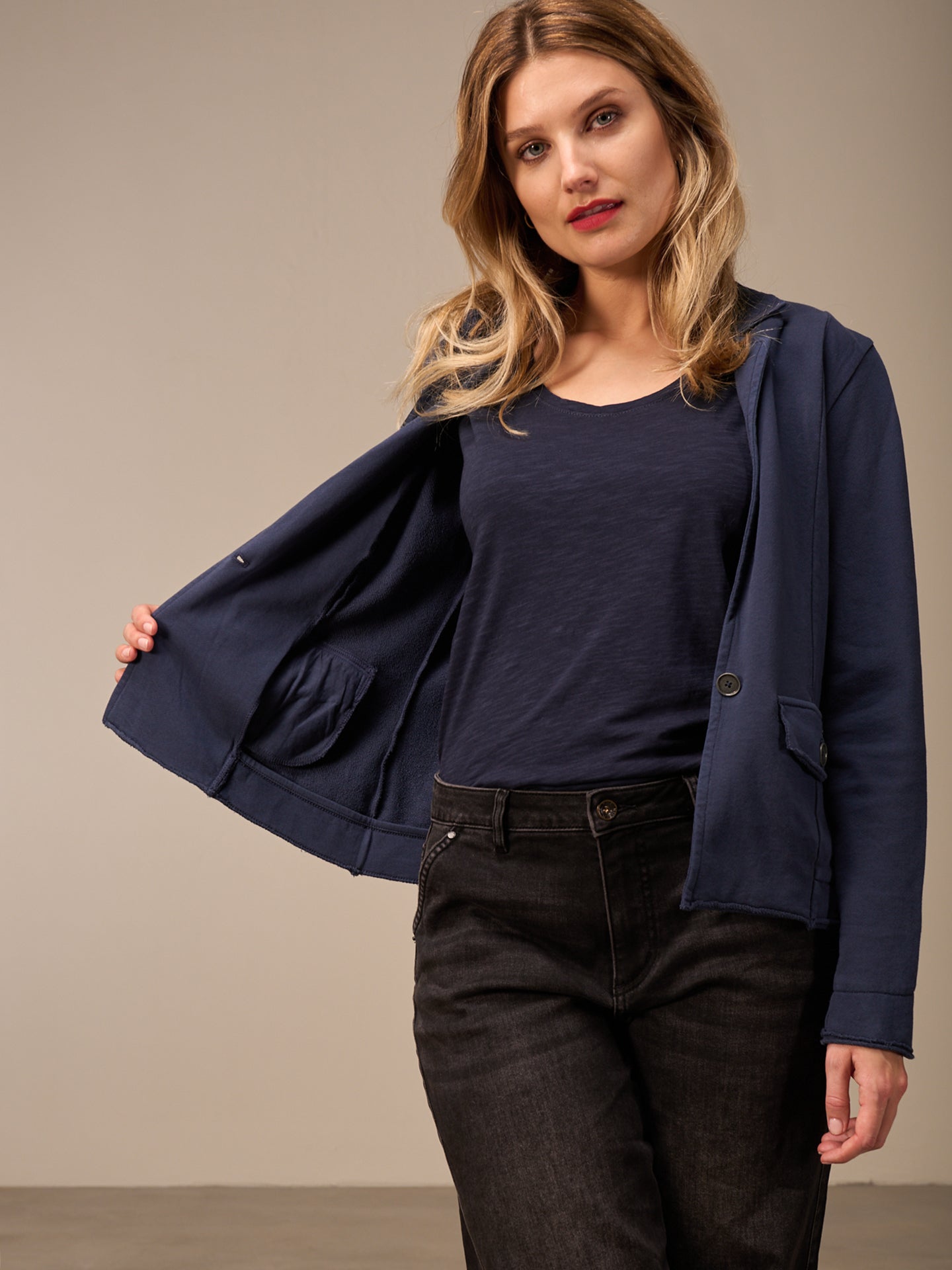Veste blazer à la silhouette étroite avec col à revers et poches plaquées avec ourlet à bords francs. 100% coton de qualité bio certifié GOTS. Teint en pièce; les irrégularités de couleur rendent chaque pièce unique. L’effet décoloré s’en trouve renforcé.