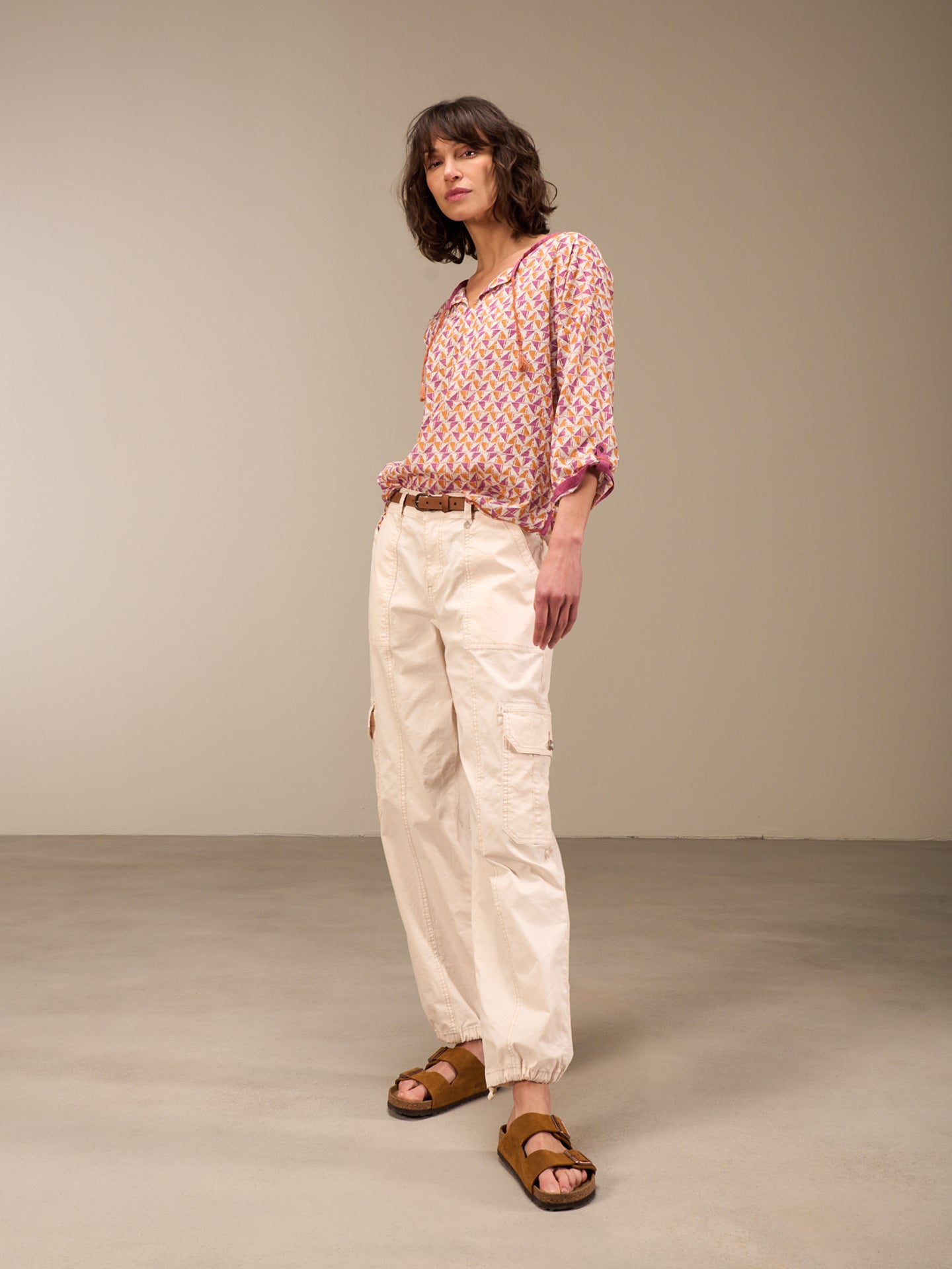 Blouse à col rond à la coupe décontractée avec de petites fentes et des manches 3/4 avec des languettes pour les retrousser. Les pompons décoratifs sur les cordons de l'encolure font de ce chemisier un véritable accroche-regard.
