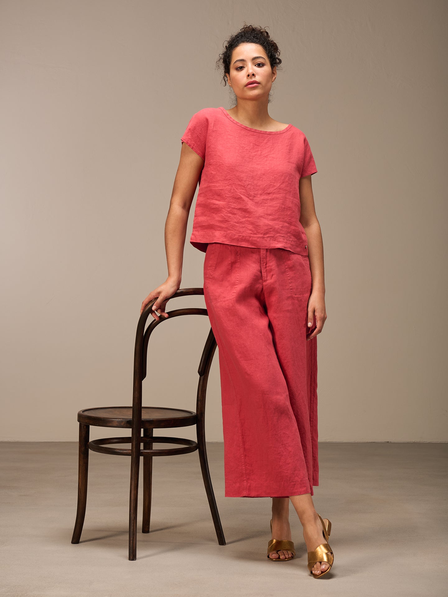 Chemisier féminin à la coupe décontractée, légèrement raccourcie et casquée, avec une petite fente décorative dans l'encolure du dos et sur les coutures latérales. La qualité 100% lin assure un confort idéal même par des températures estivales.