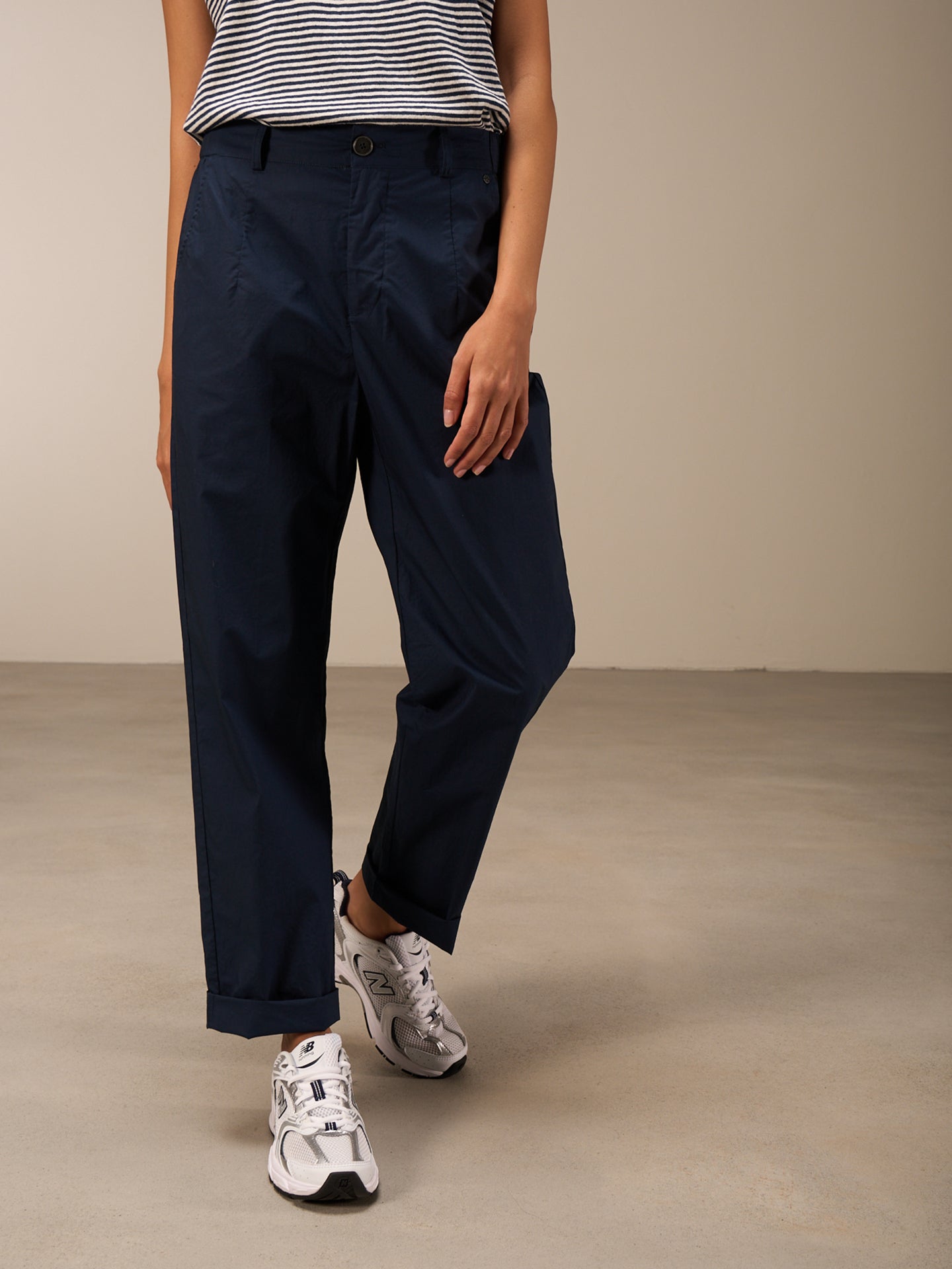 Pantalon décontracté avec une taille élastique à l'arrière pour une coupe confortable. La ceinture en tissu complète le look raffiné. En 100% coton bio issu de cultures certifiées, avec une touche de papier estivale.