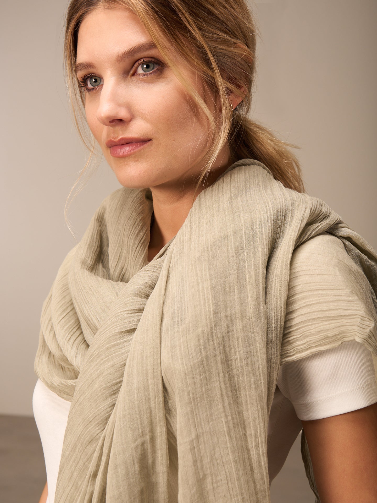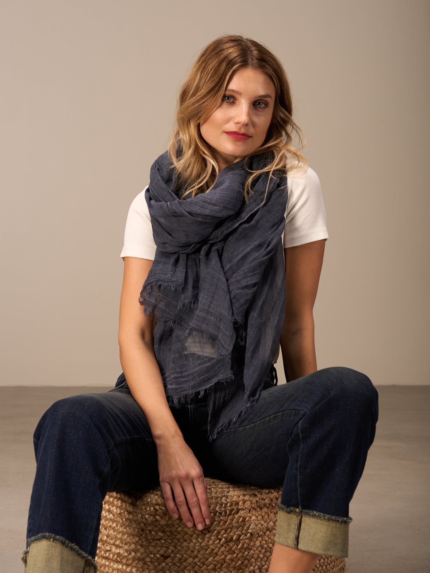 Écharpe unie; dimensions: 120 x 200 cm. 100% coton issu de l’agriculture biologique certifiée. Grâce à un procédé de teinture intérieure spécial, l’écharpe a un beau look délavé. Les irrégularités de couleur rendent chaque pièce unique. L’effet décoloré s’en trouve renforcé.