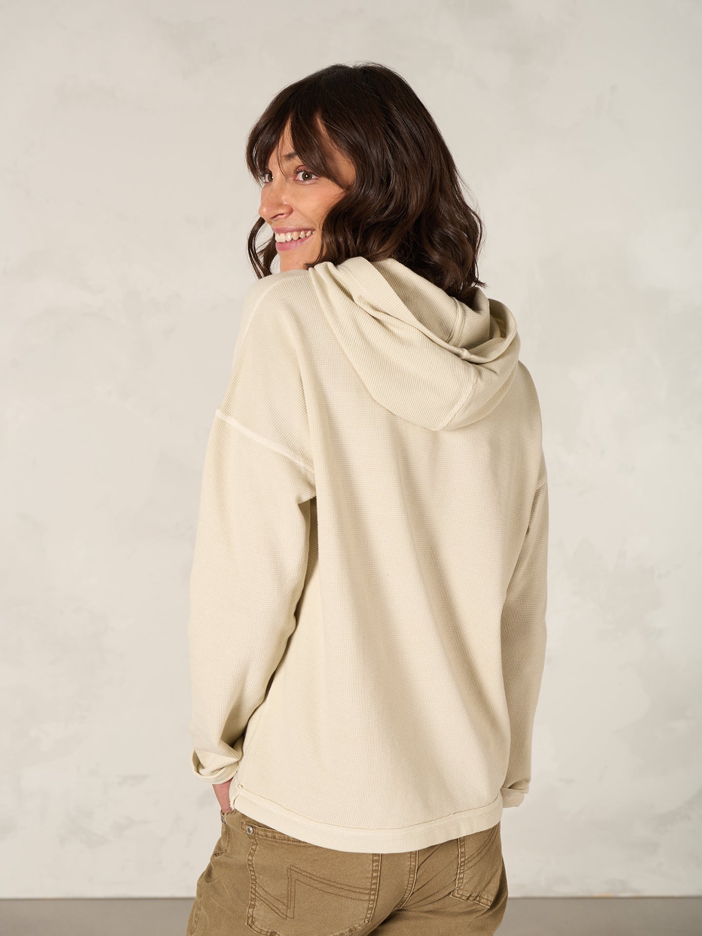 Pull-over à la coupe cassée avec une capuche pratique et des manches longues dans un look gaufré attrayant. Le cordon de serrage avec ruban à l'ourlet permet différents styles. 100% coton bio certifié GOTS. Teint en pièce. Les irrégularités de la couleur rendent la pièce unique. L'effet de décoloration s'accentue au lavage.