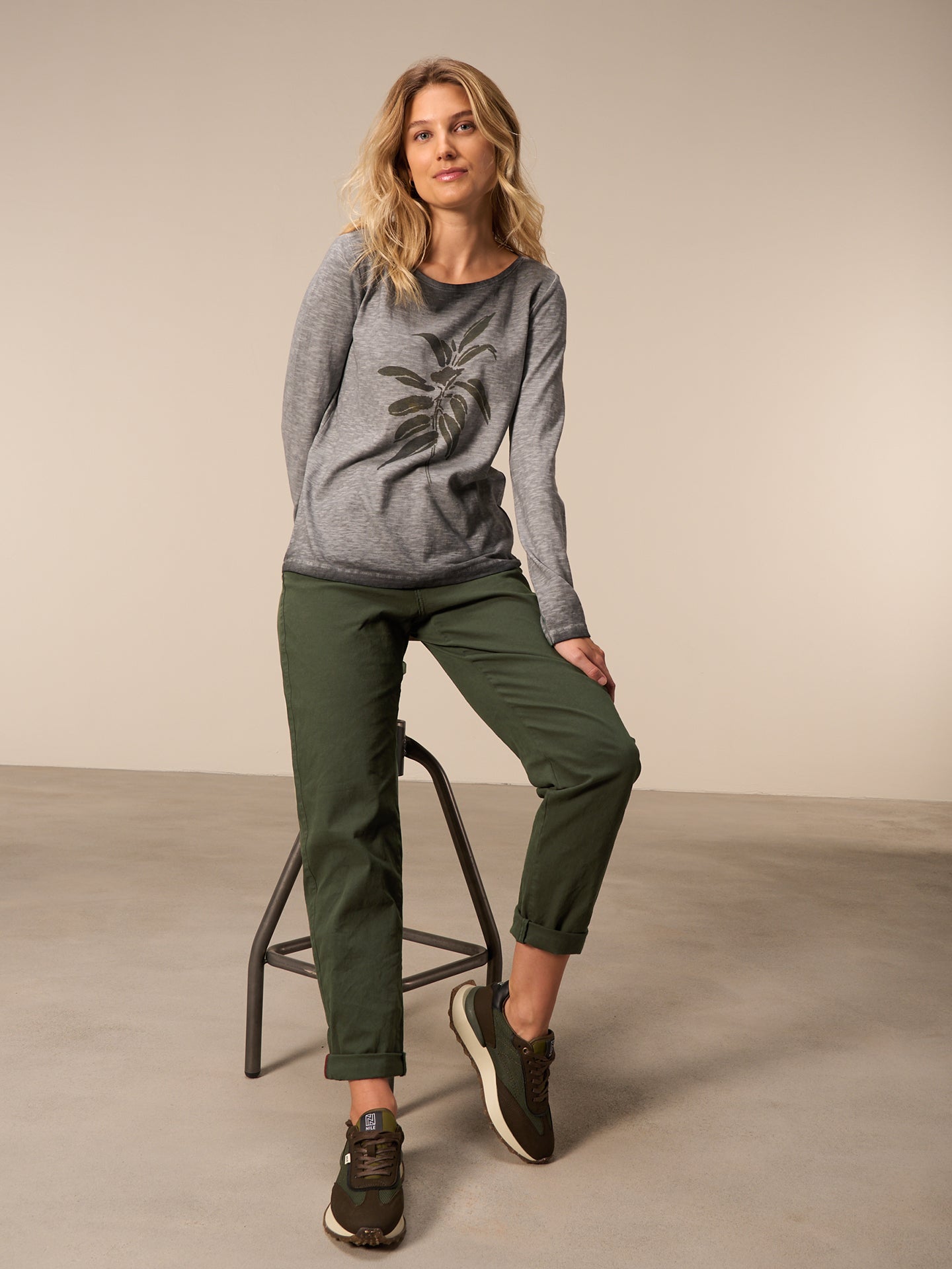T-shirt à manches longues à la coupe décontractée en jersey flammé, encolure U-Boot et imprimé placé. 100% coton de qualité bio certifié GOTS. Inside dirty dye. Les irrégularités de la couleur rendent la pièce unique. L'effet de décoloration s'accentue au lavage.