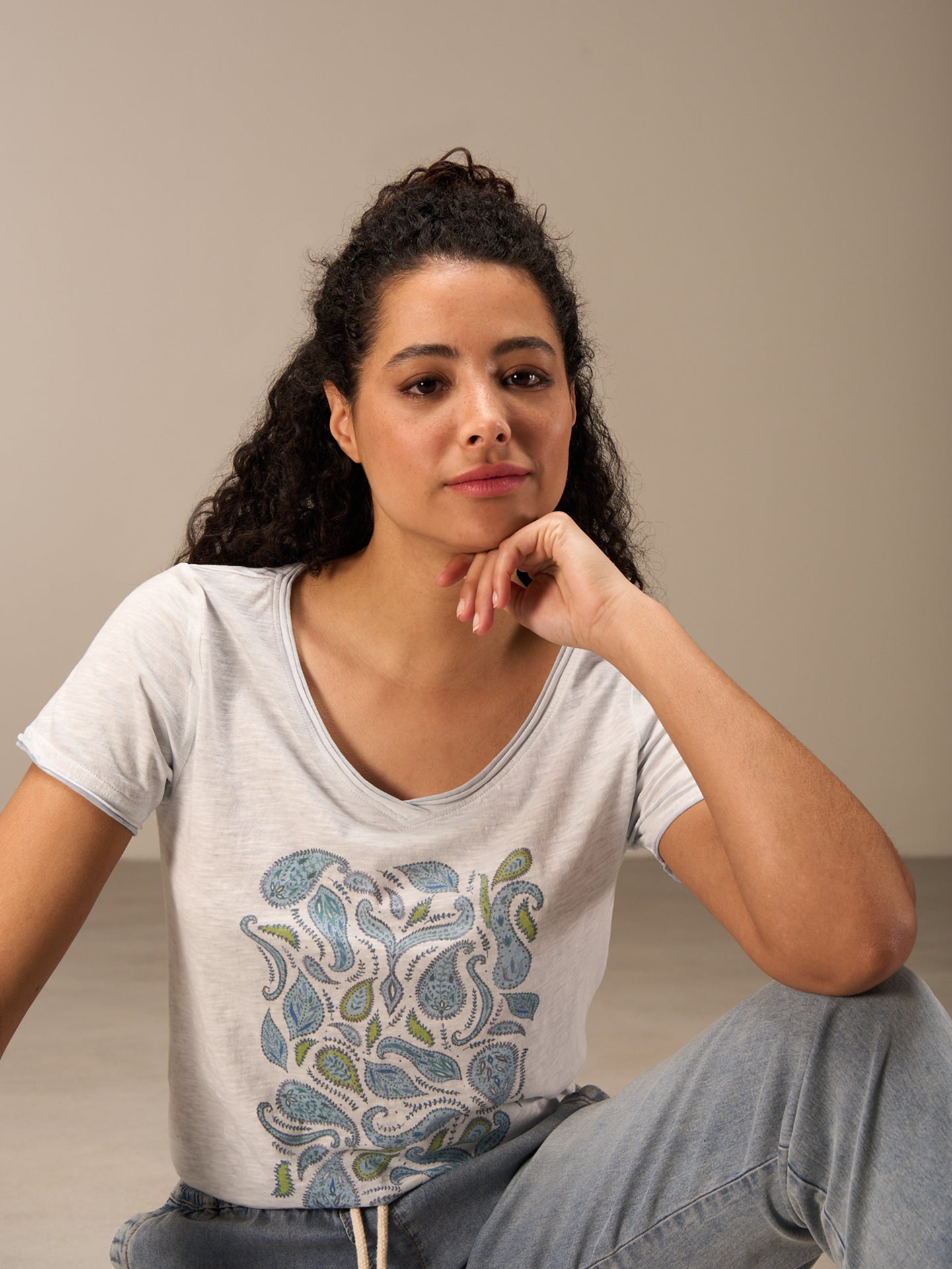 T-shirt à la coupe décontractée en jersey flammé avec un imprimé placé et une encolure en V à bords ouverts.