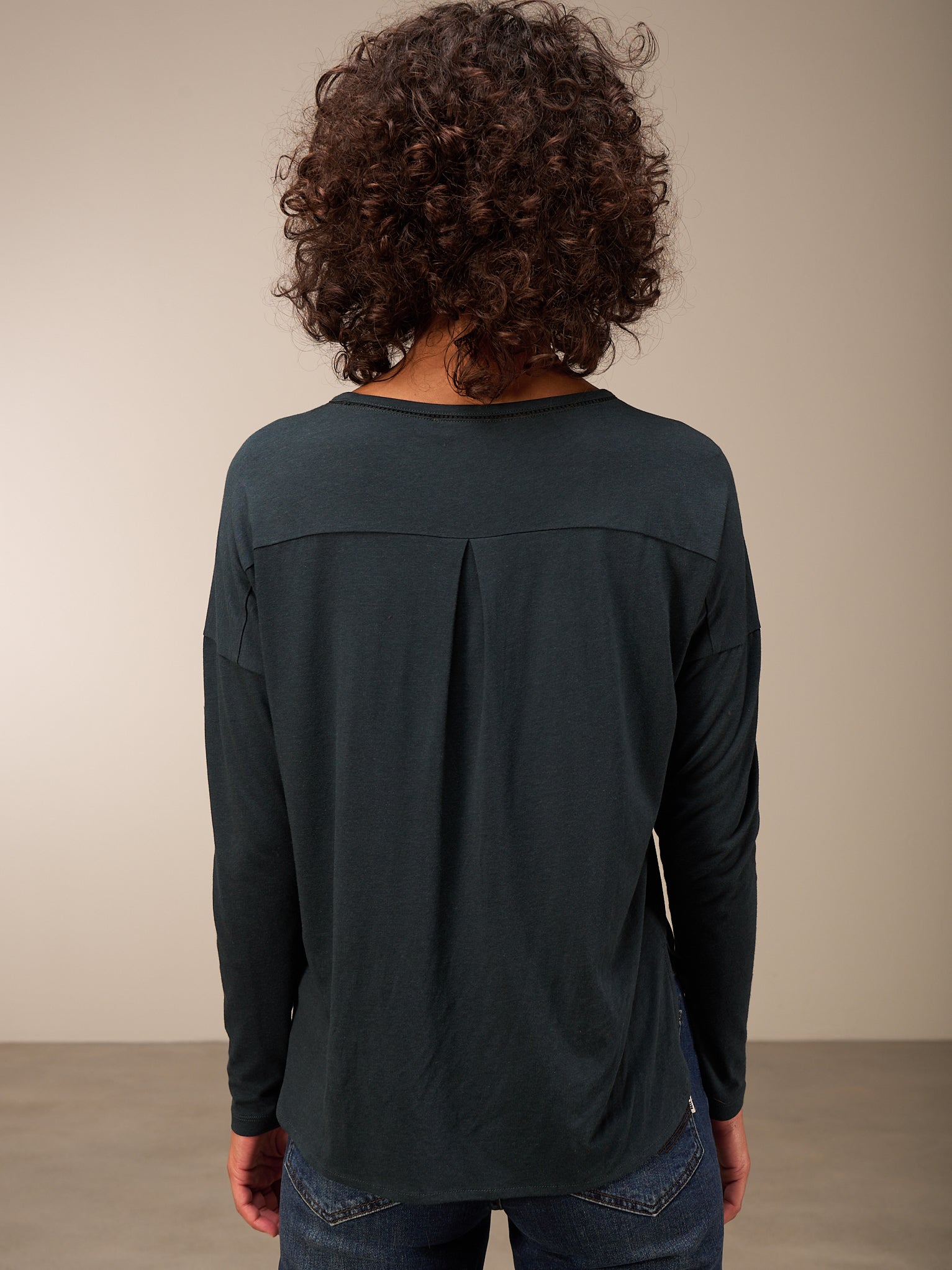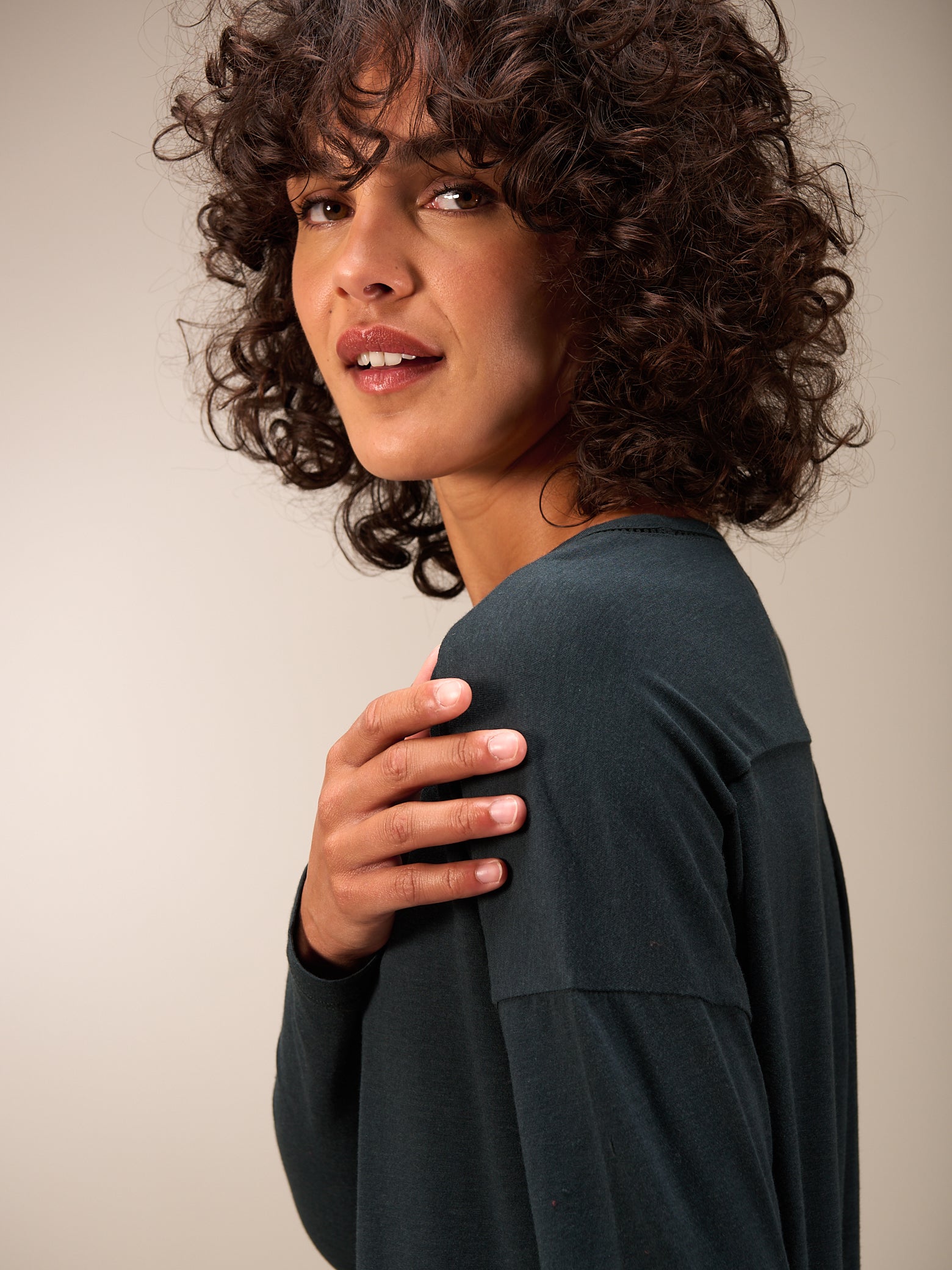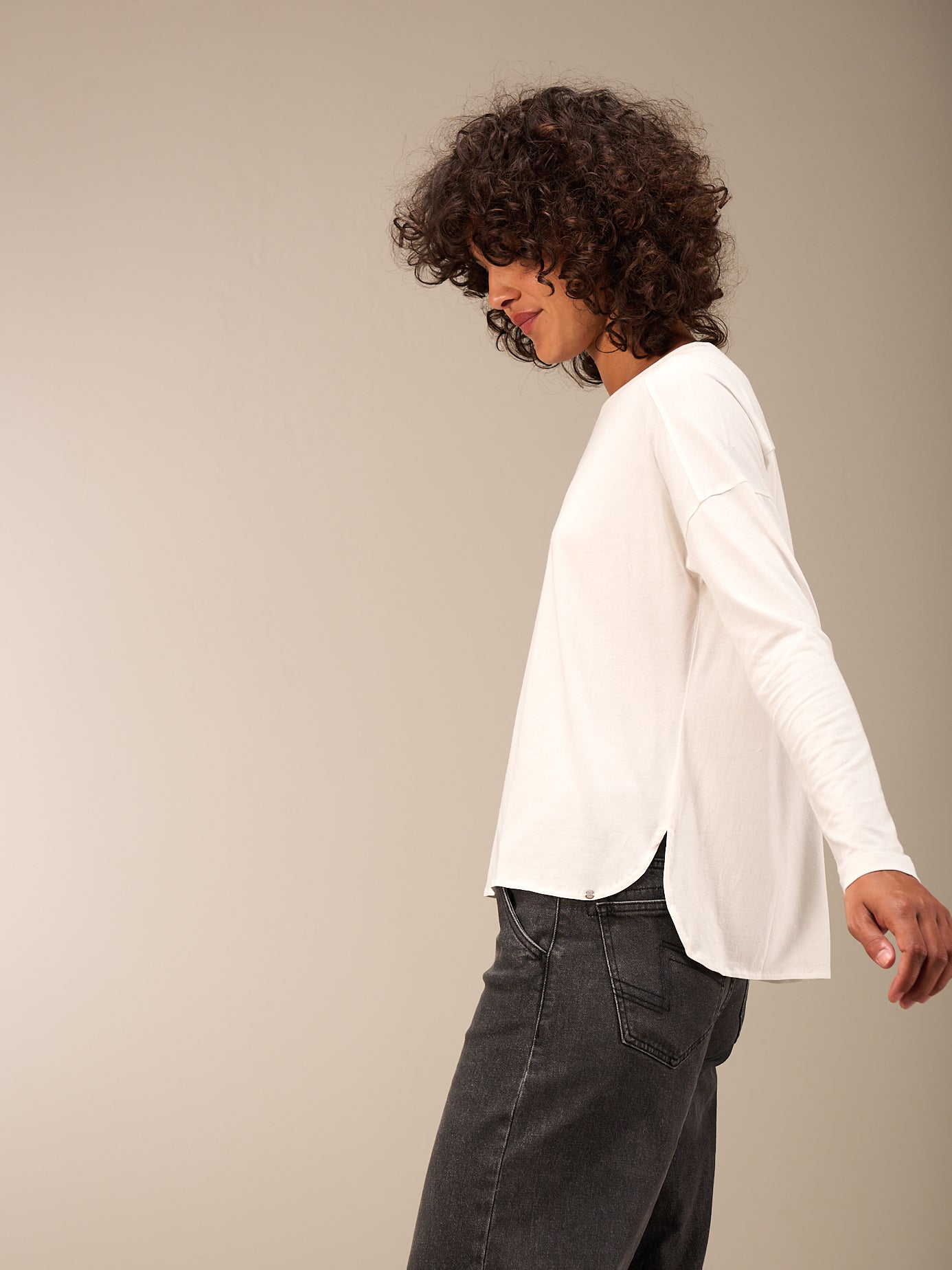 T-shirt à manches longues et à coupe large avec col rond, épaules recoupées et manches longues et étroites. Le dos légèrement plus long, dont le pli lui donne l'ampleur nécessaire, lui confère un look décontracté.