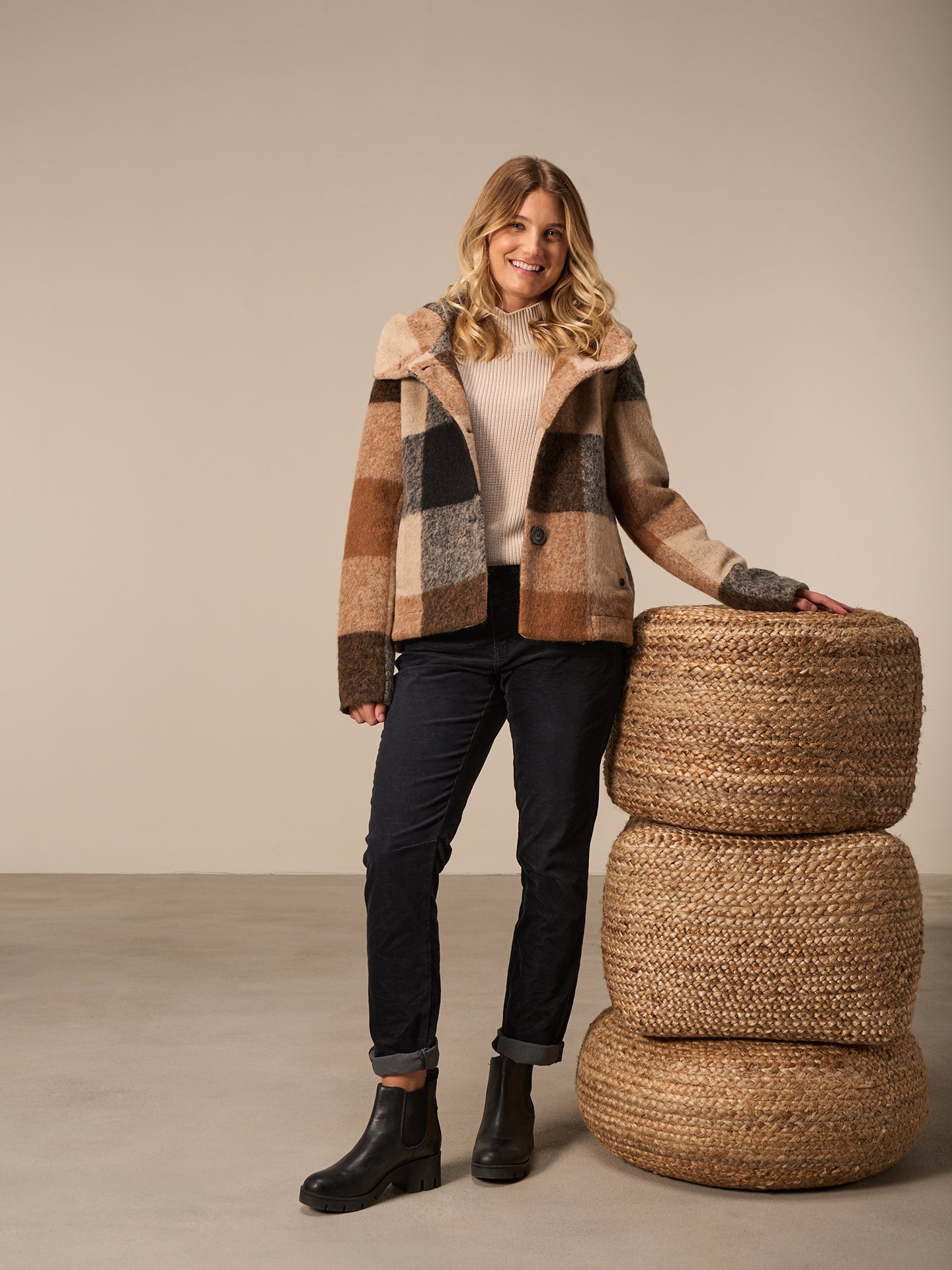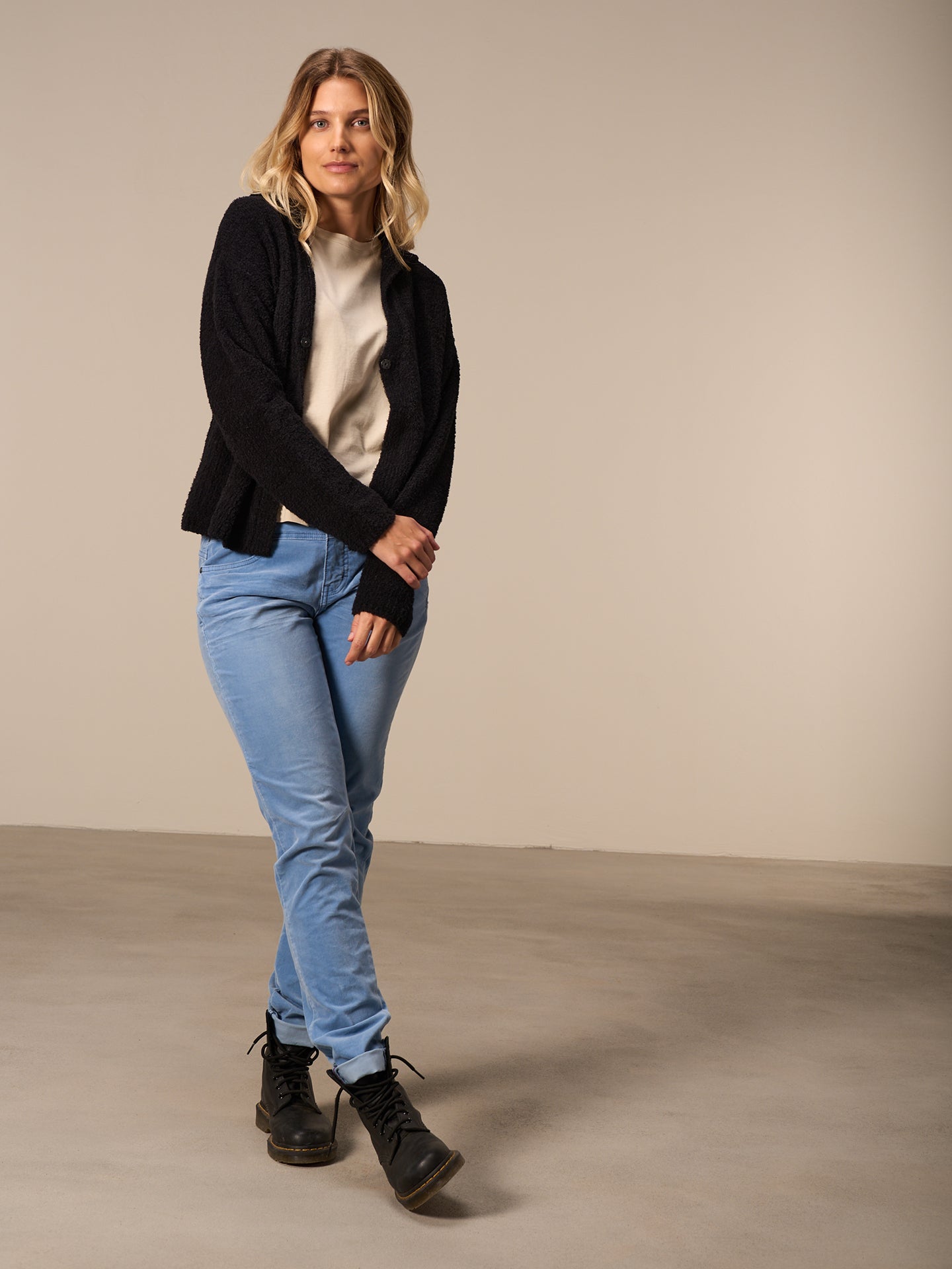 Pantalon en velours côtelé à fines ribs avec une coupe décontractée sur les hanches. Les jambes du pantalon se resserrent vers la cheville et sont retroussées pour un look cool.