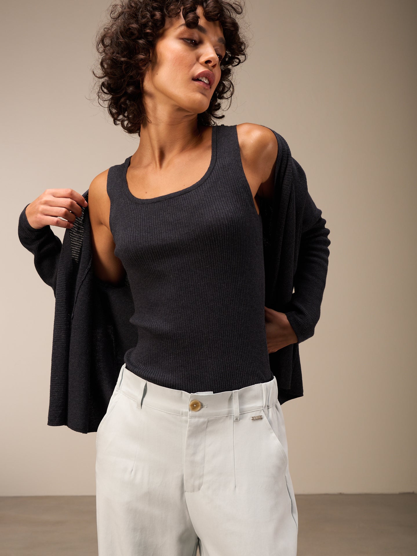 Top côtelé moulant à col rond tricoté en fil mélangé avec un coton 100% bio particulièrement valorisant.