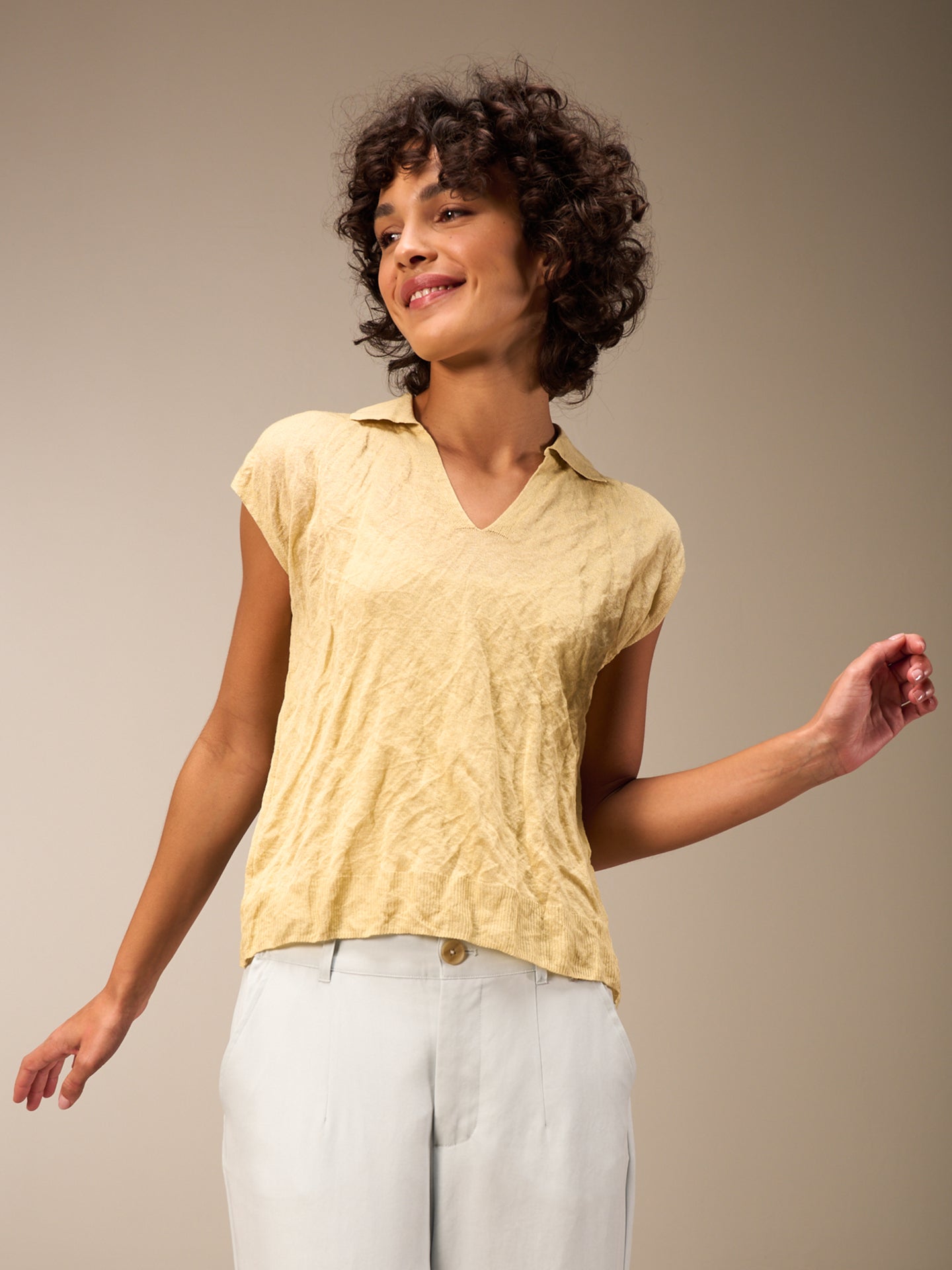 Pull sans manches légèrement transparent avec un col polo stylé. L'aspect froissé élégant est dû aux fils métalliques travaillés.