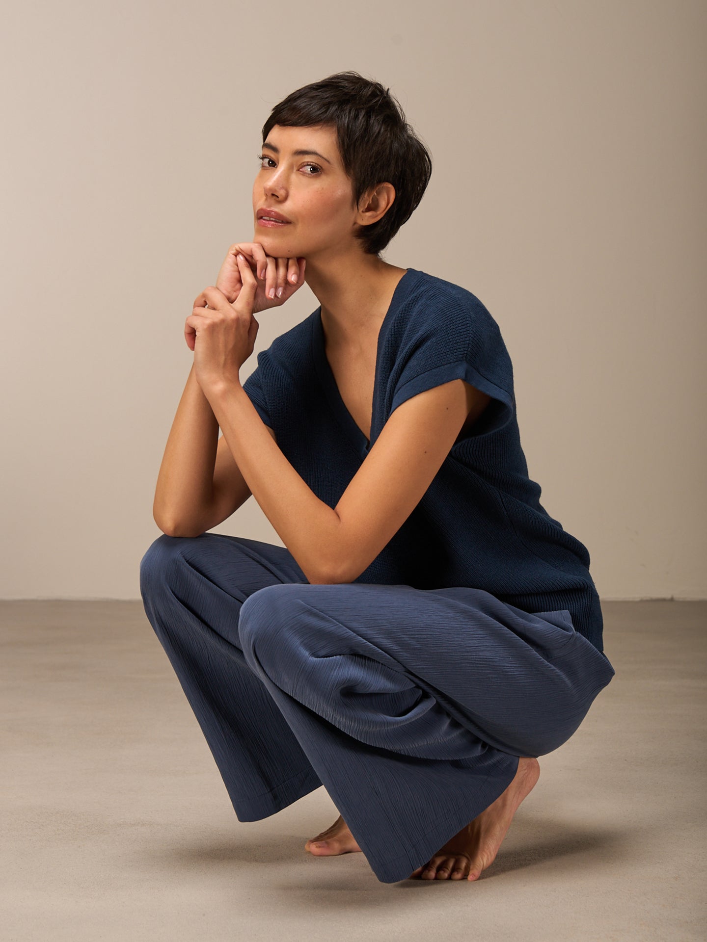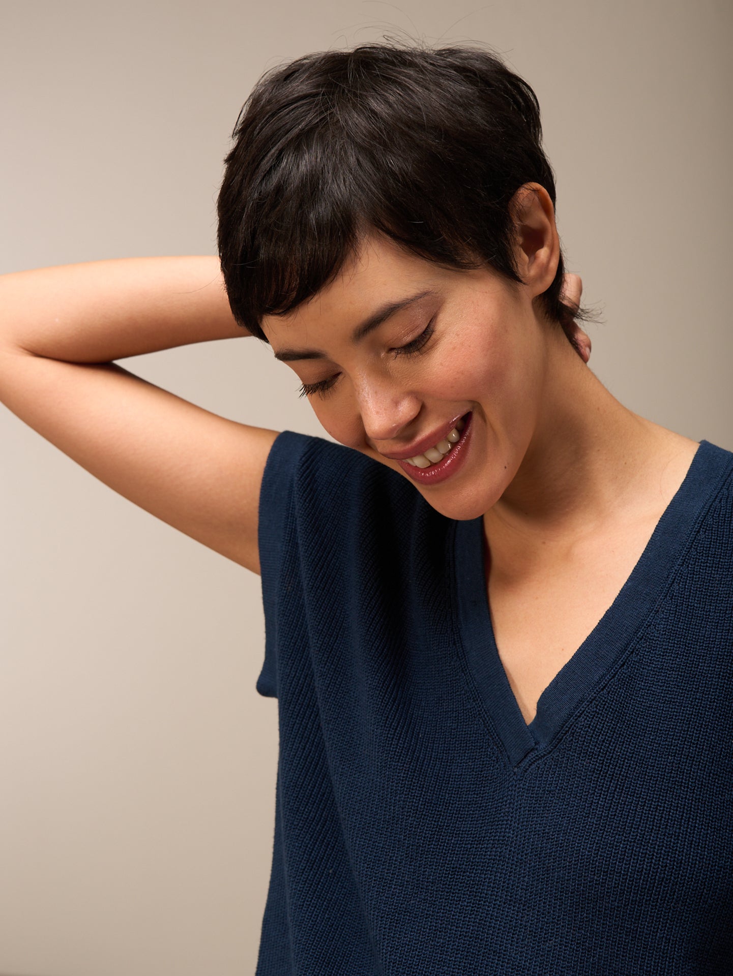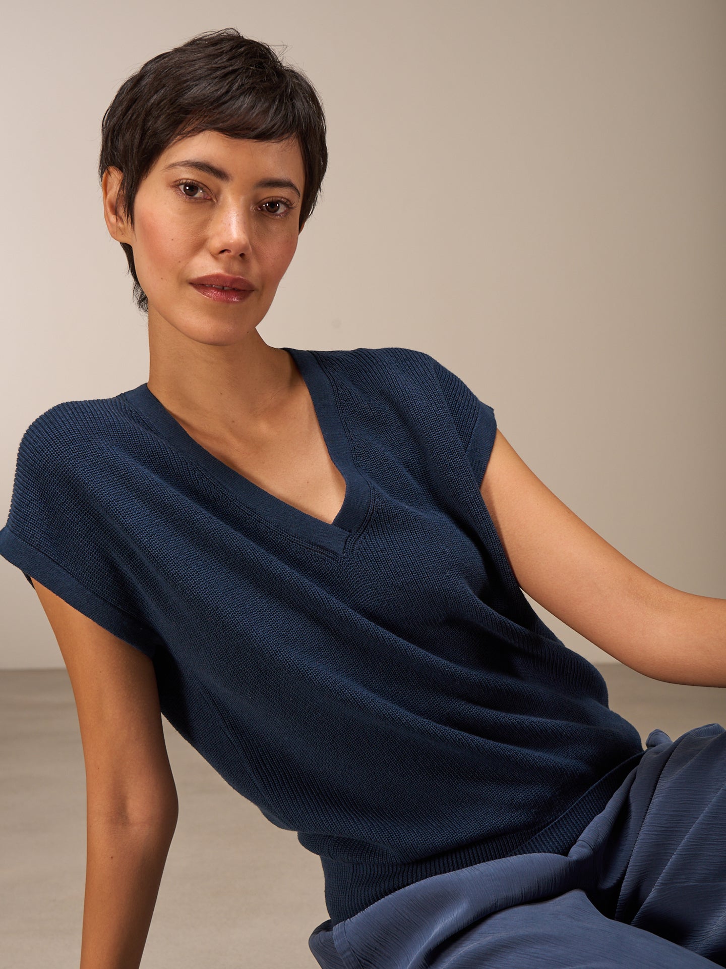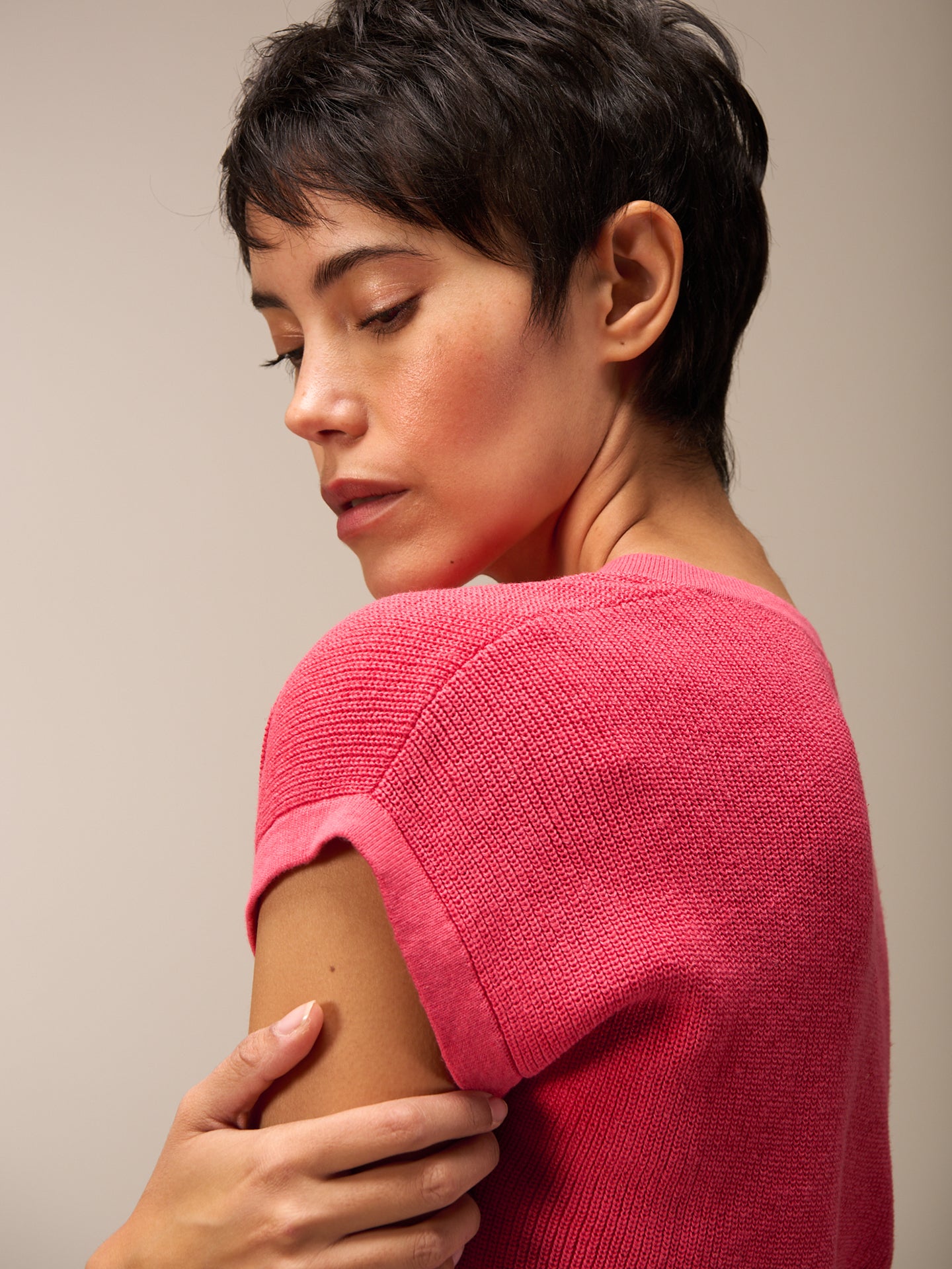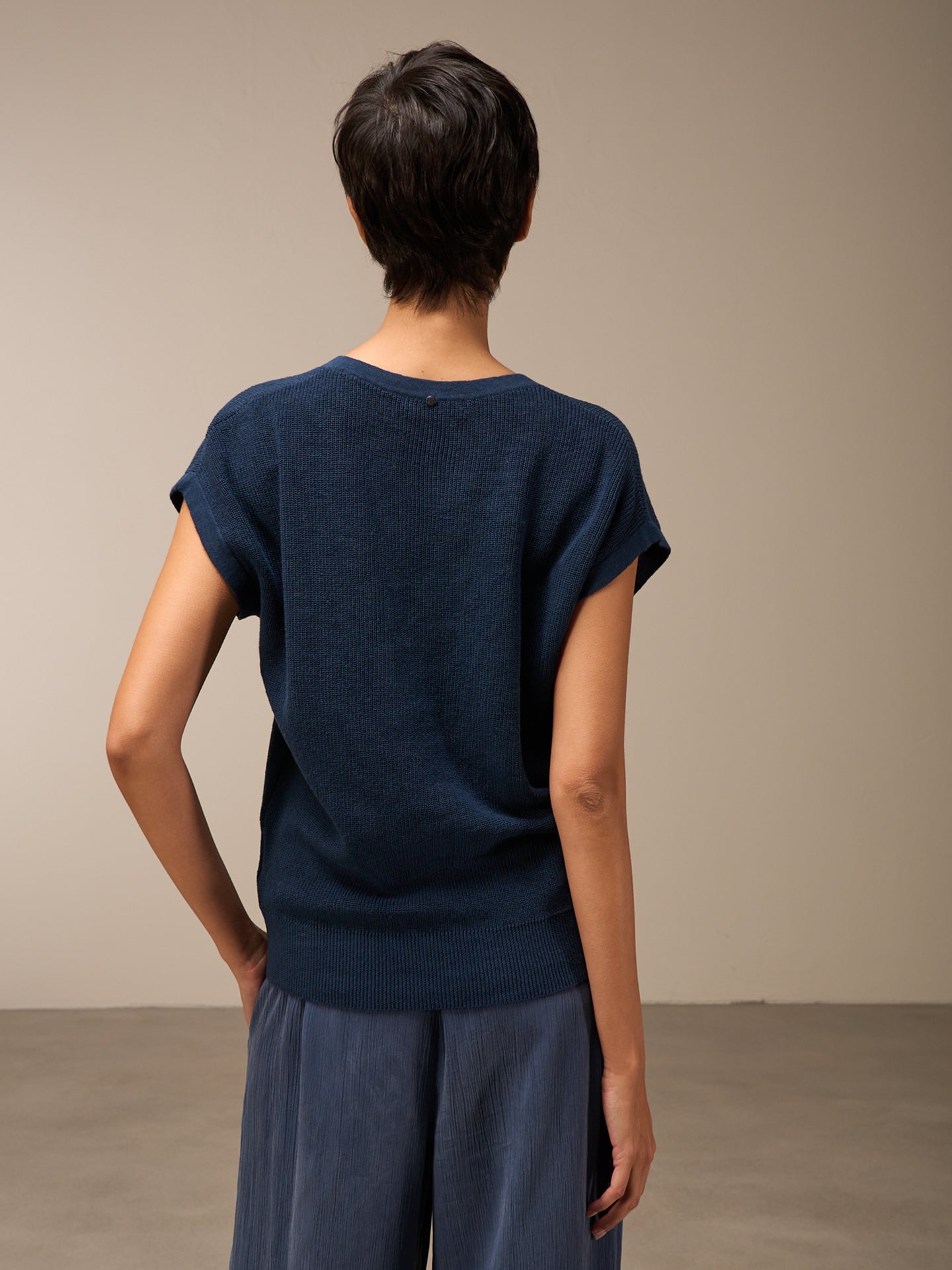 Pull à manches courtes avec encolure en V et une bordure côtelée spéciale à l'ourlet et aux emmanchures. La qualité de 55% de lin et de 45% de coton assure un grand confort.