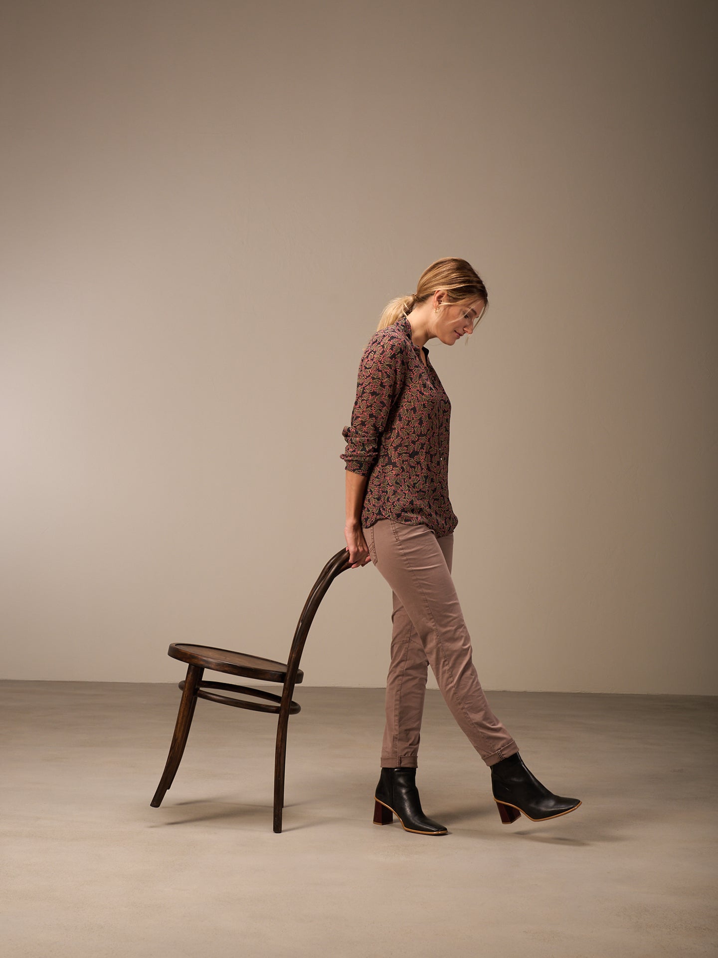 Leicht taillierte Bluse mit kleinem Stehkragen mit Bändeli, die langen Ärmel haben einen Manchettenabschluss mit Knopf. Aus Eco Viskose, die aus nachhaltiger Holzwirtschaft gewonnen wird.
