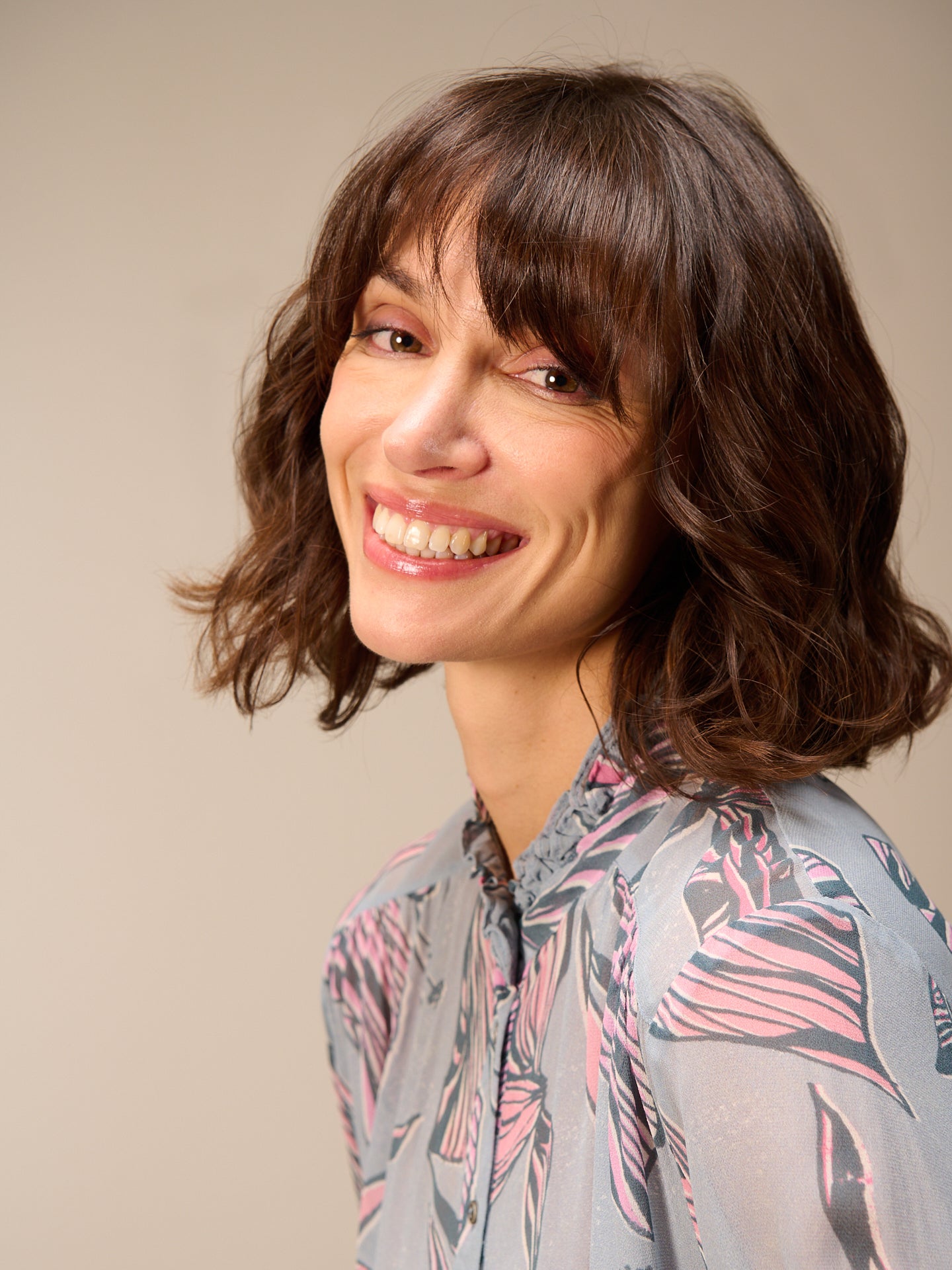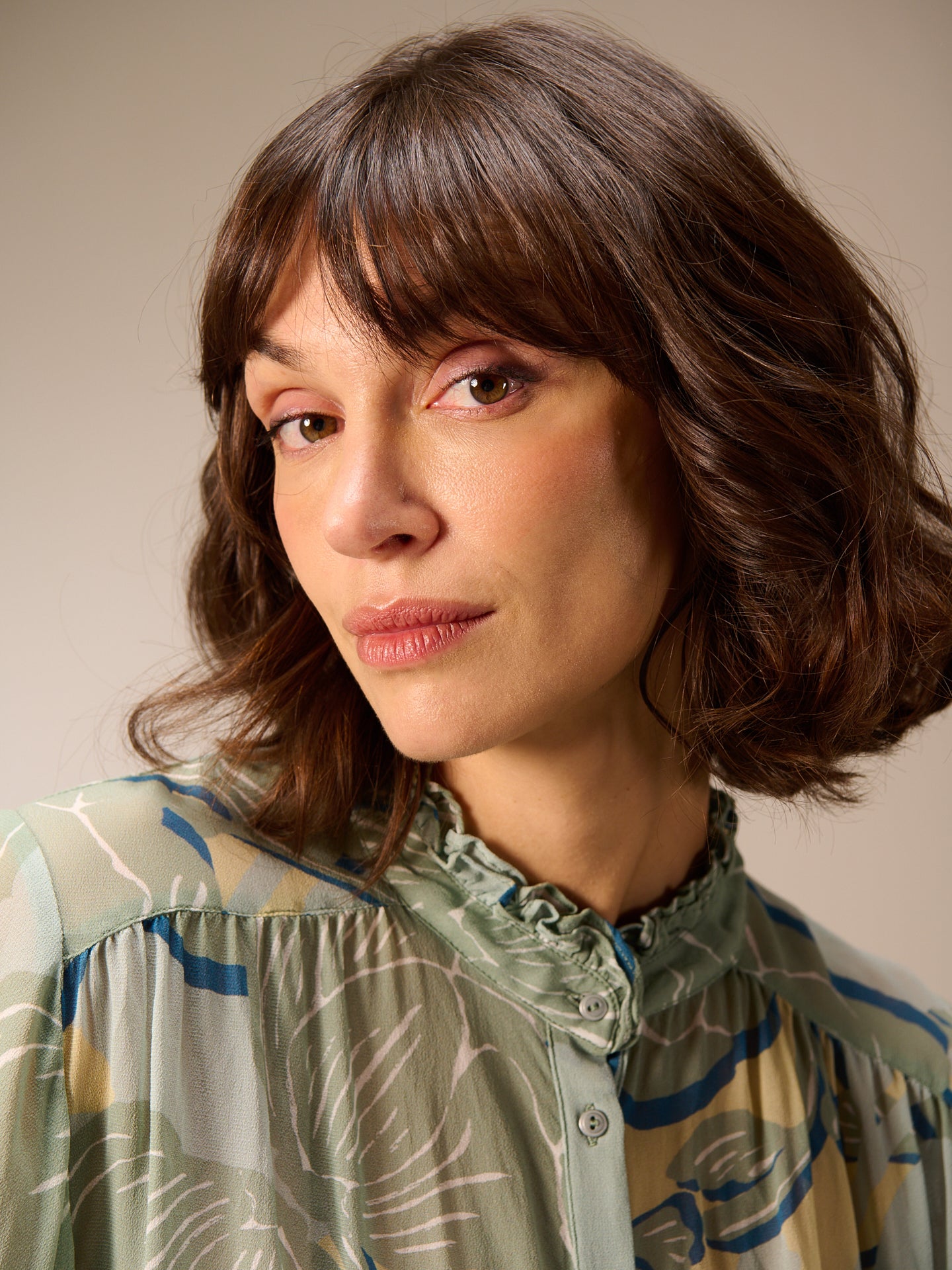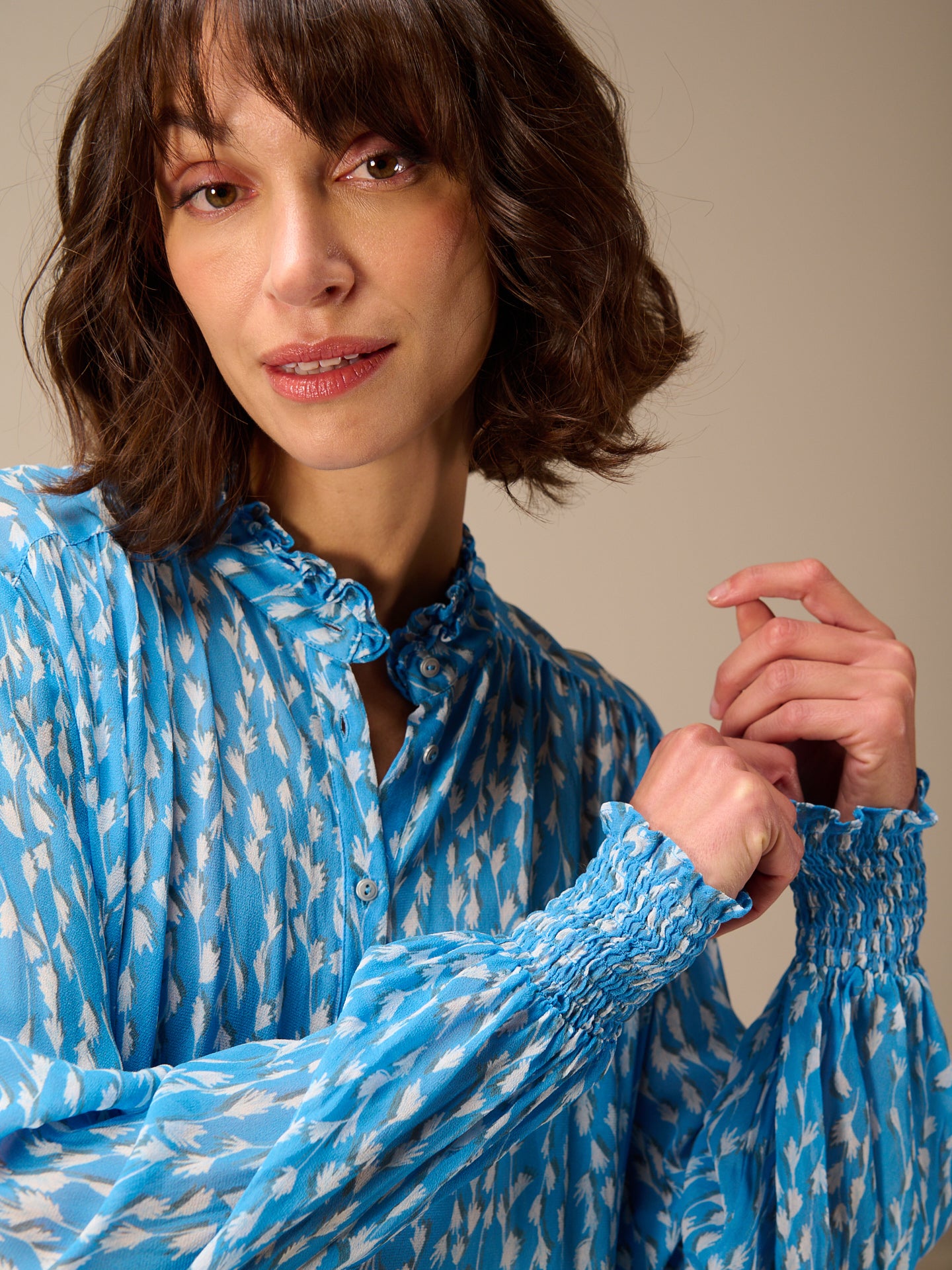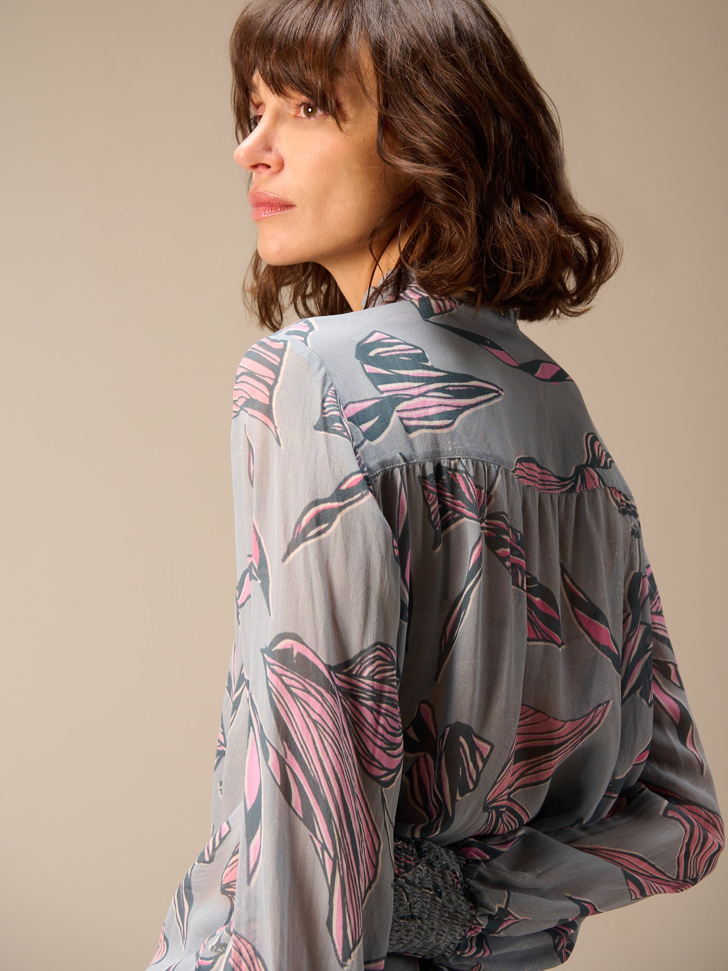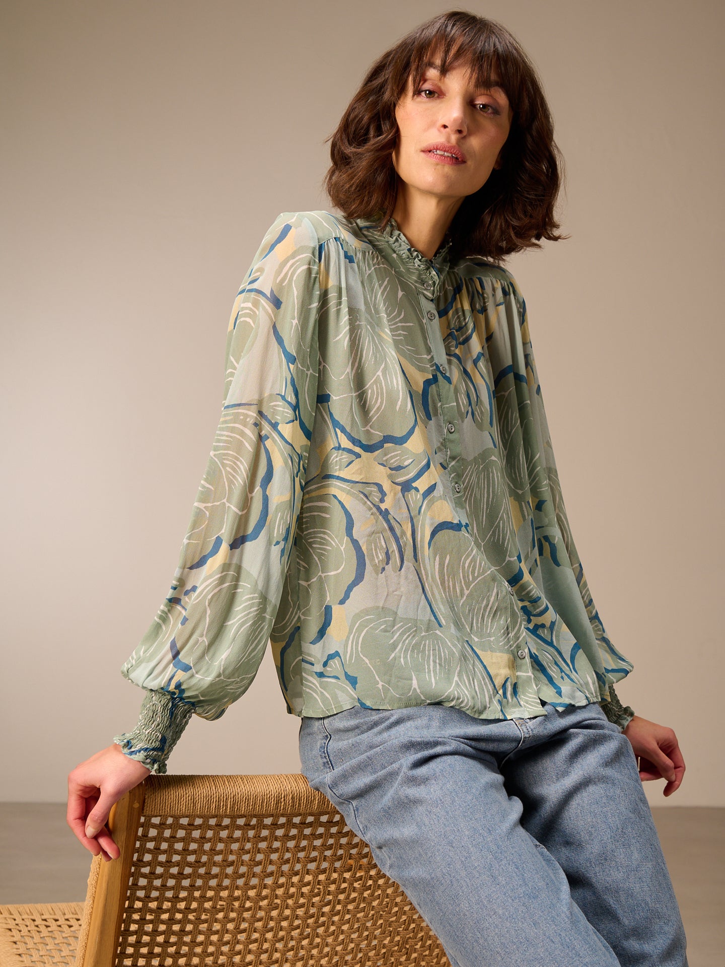 Camicetta ampia abbottonata con stampa all-over disegnata a mano, maniche lunghe e graziosi dettagli smockati sui polsini. Il piccolo colletto alto con volant e gli eleganti bottoni in metallo completano lo stile.
