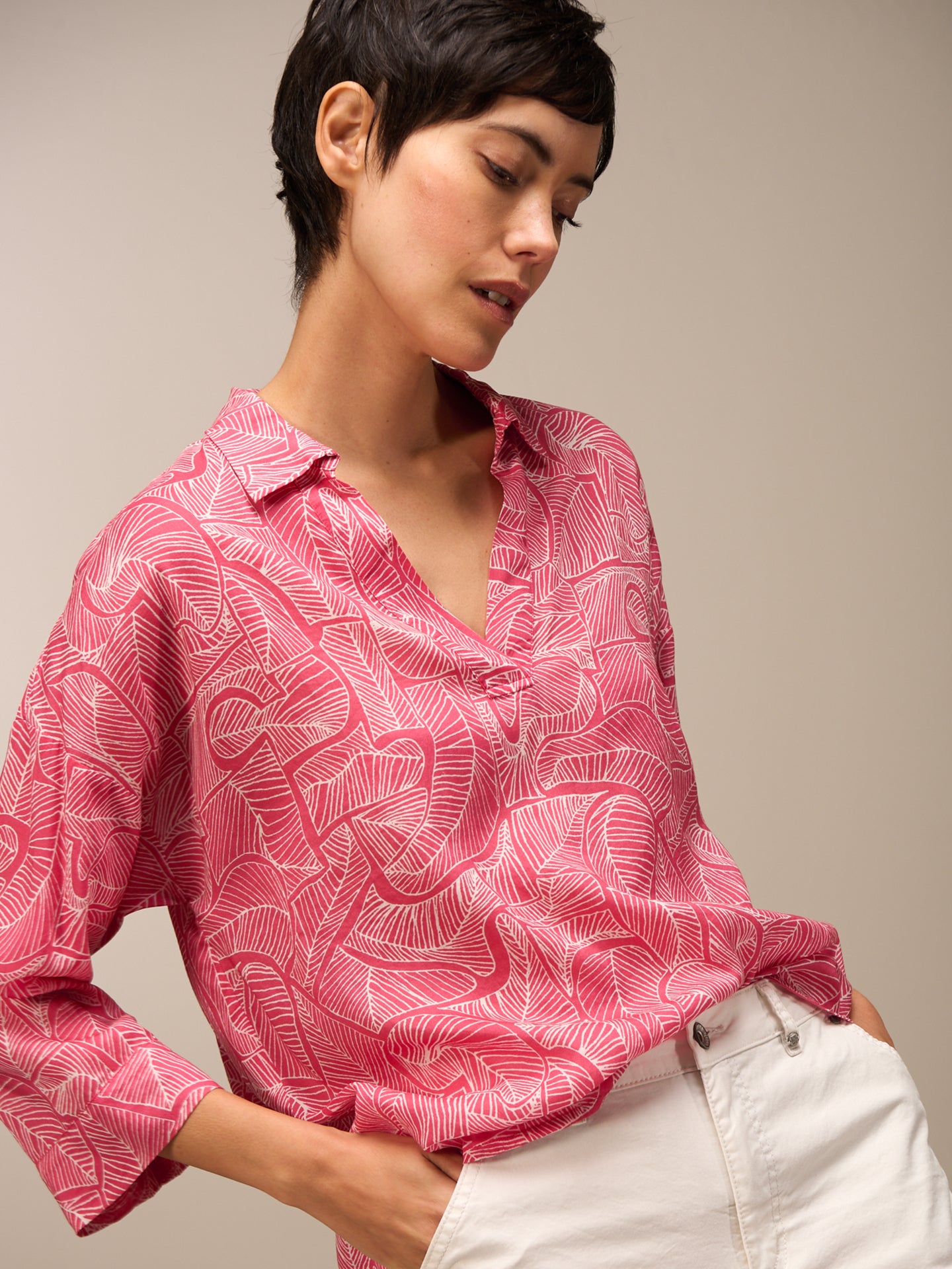 Blusa casual e leggera con stampa all-over disegnata a mano, collo chemisier, scollo a V aperto e maniche larghe a 3/4. Realizzata in 100% Lyocell certificato TENCELTM.