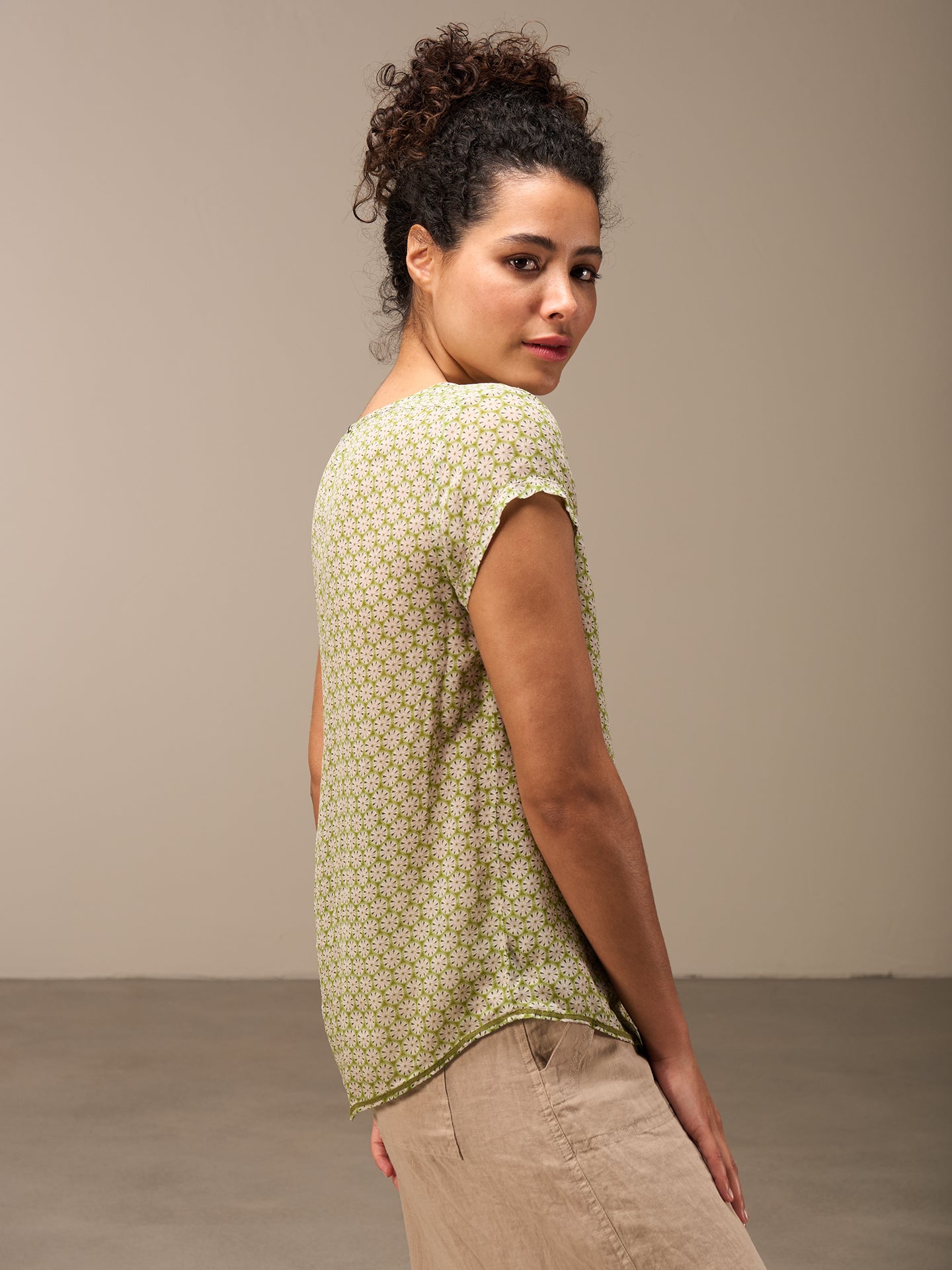 Camicetta dal taglio dritto con maniche corte e giromanica. I nastri decorativi sullo scollo completano lo stile estivo.