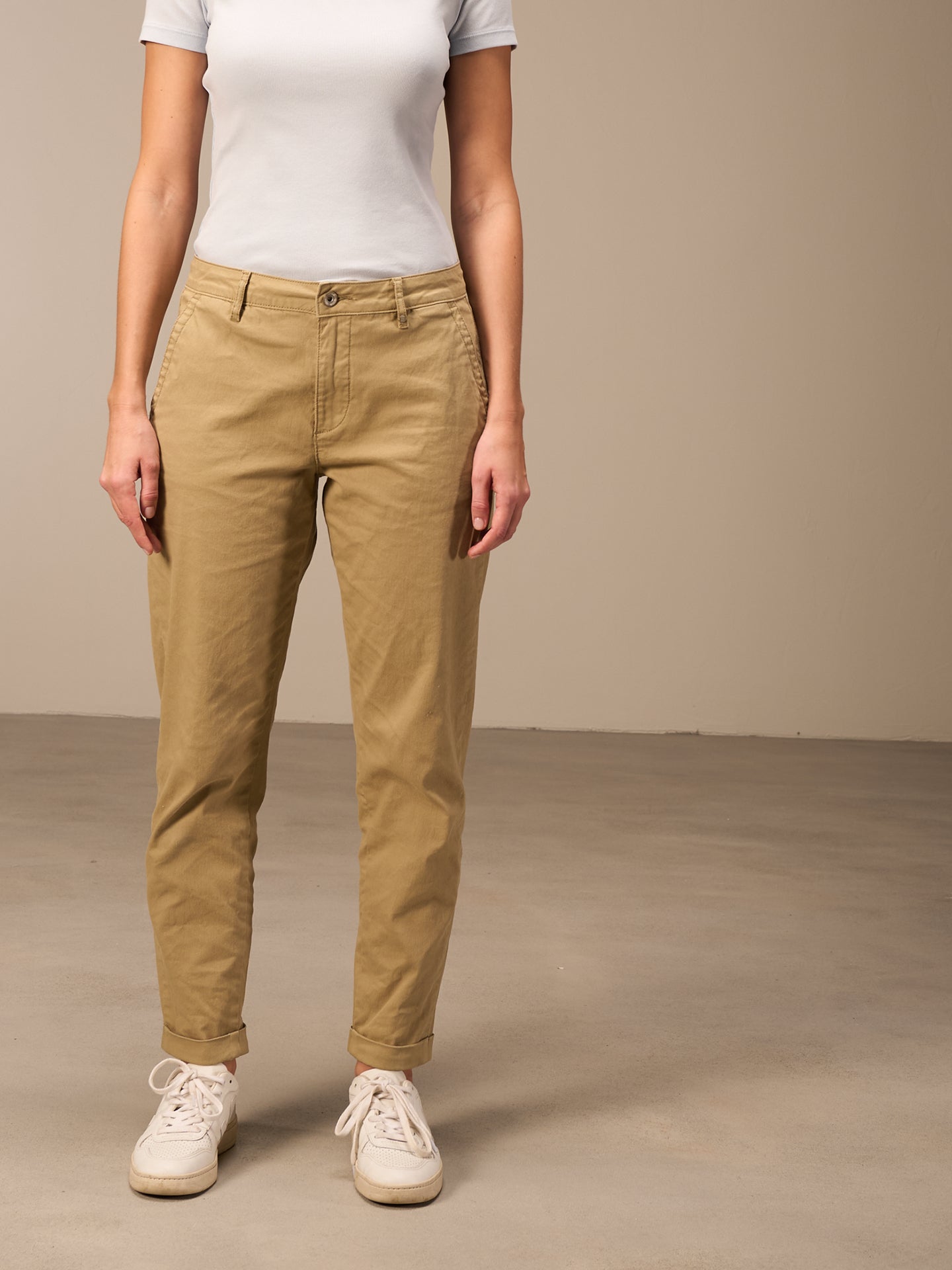 Pantaloni dalla vestibilità morbida con gamba aderente, vita media con passanti per cintura, chiusura con zip e tasche laterali. Il tessuto elasticizzato dalla trama raffinata è composto per il 98% da cotone biologico proveniente da coltivazioni certificate e per il 2% da elastan.