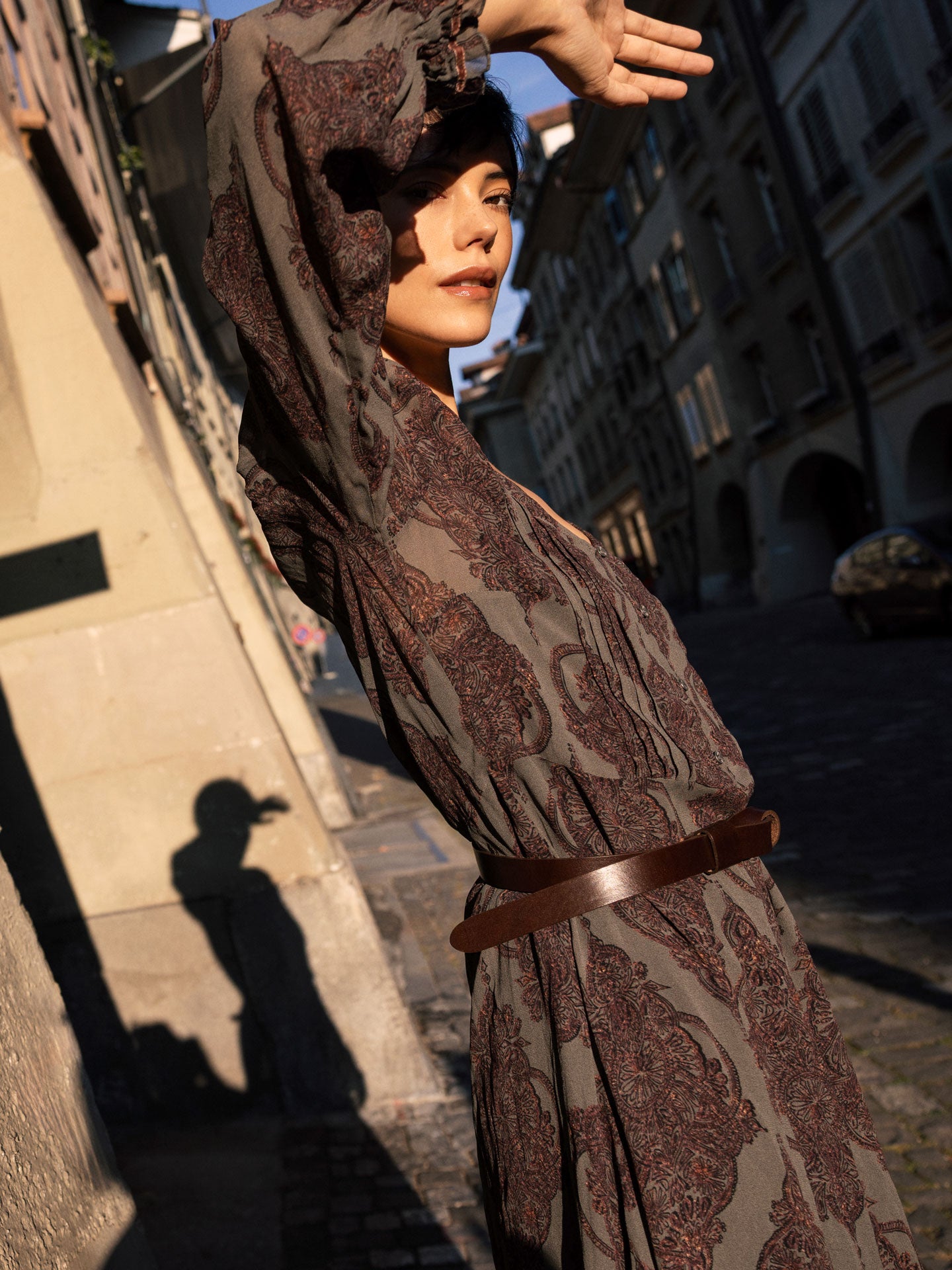 Abito lungo con volant sulla gonna e stampa all-over disegnata a mano, scollo a V e maniche lunghe con bordi elasticizzati. La cintura con elaborati elementi decorativi completa questo abito decorativo. Sottoveste separata.