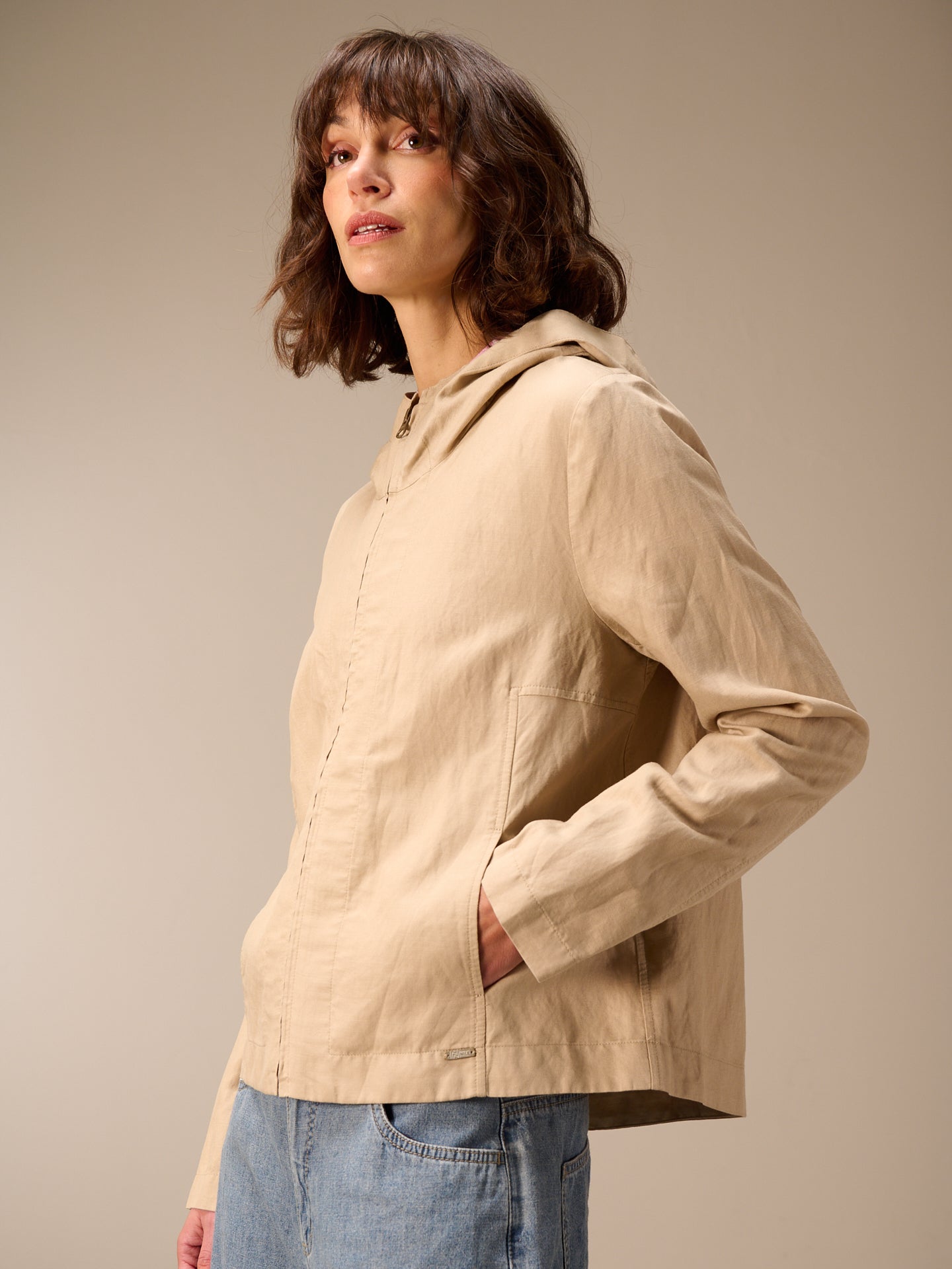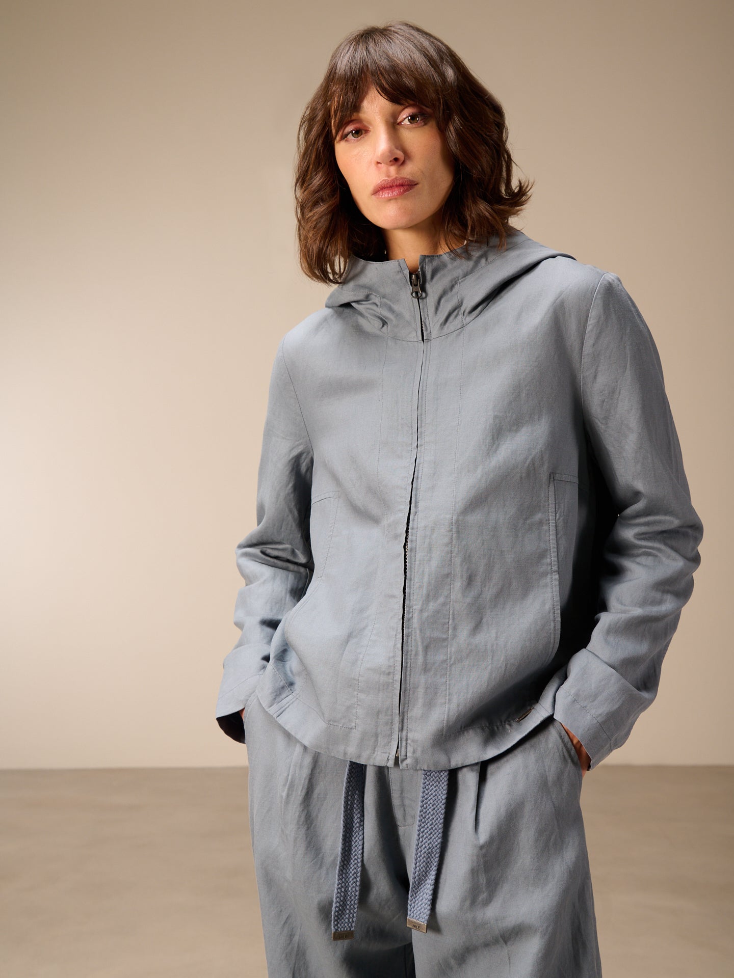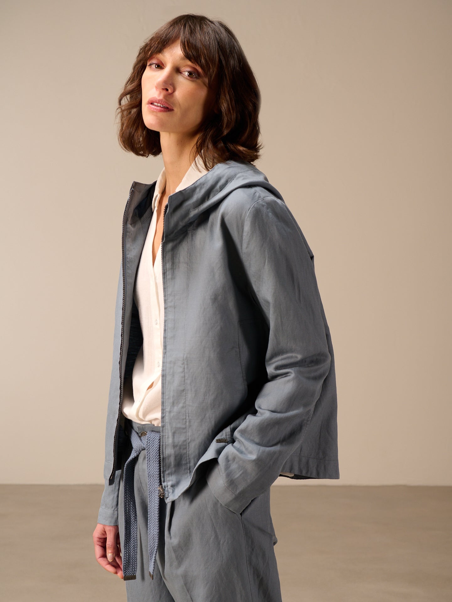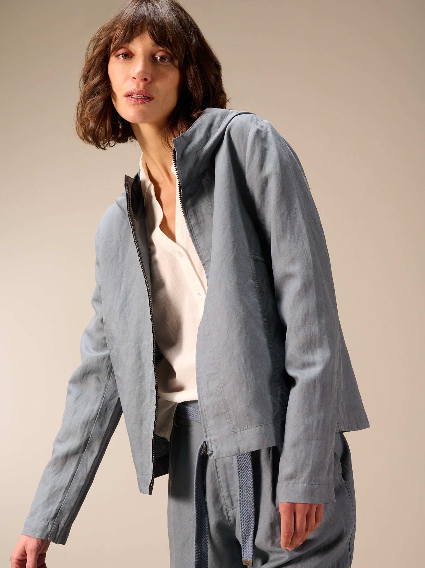Leggera giacca primaverile con cappuccio, cerniera nascosta e pratica tasca dalla linea ad A che valorizza la silhouette. Il pregiato misto lino garantisce un comfort ideale.