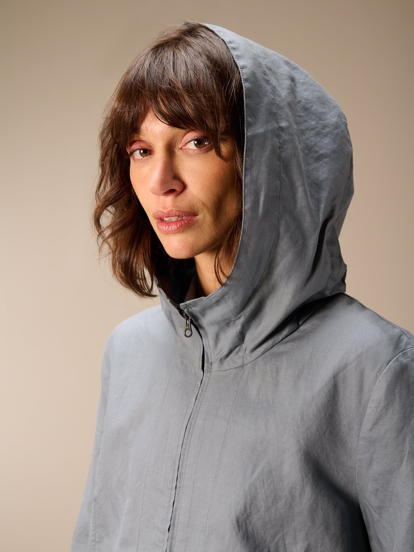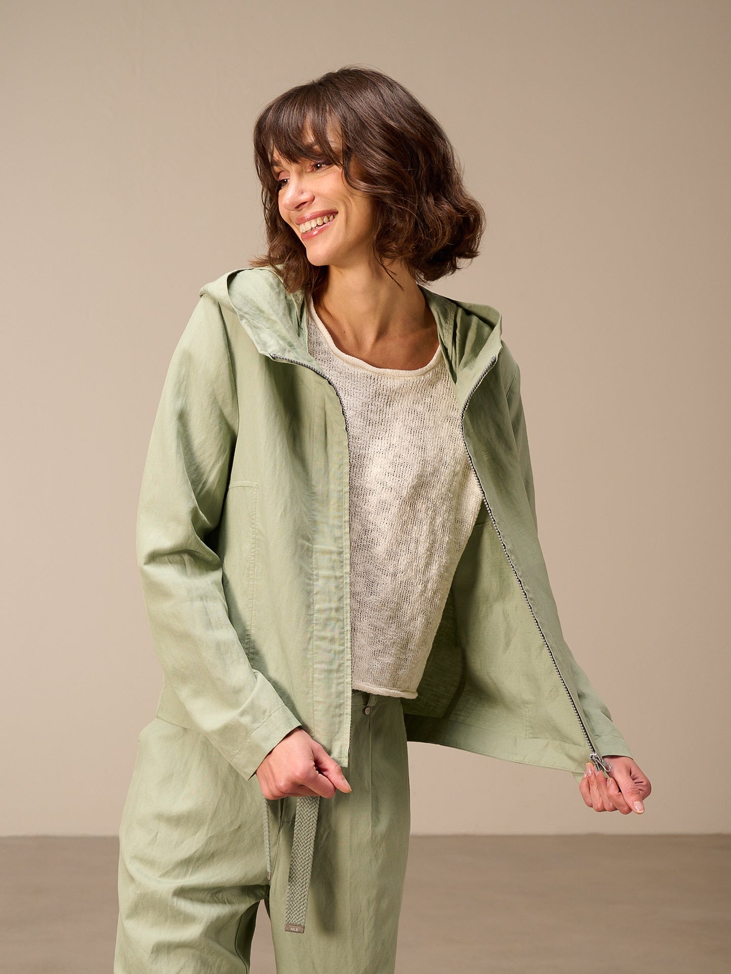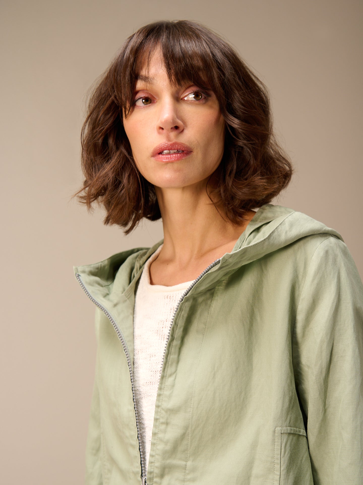 Leggera giacca primaverile con cappuccio, cerniera nascosta e pratica tasca dalla linea ad A che valorizza la silhouette. Il pregiato misto lino garantisce un comfort ideale.