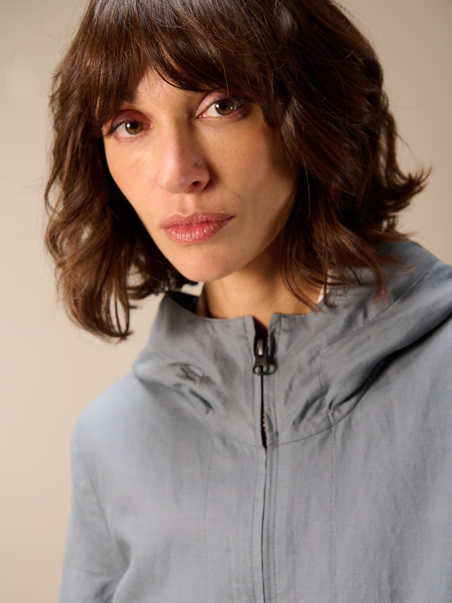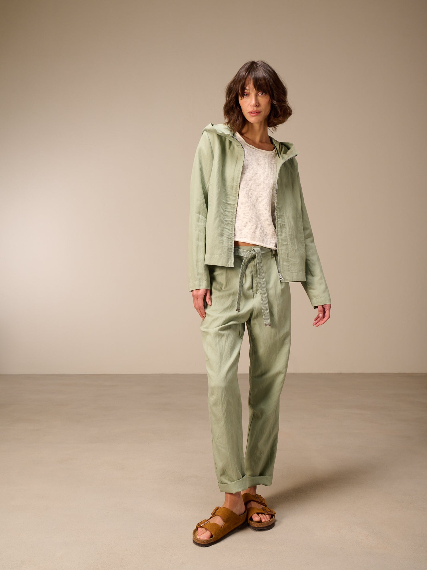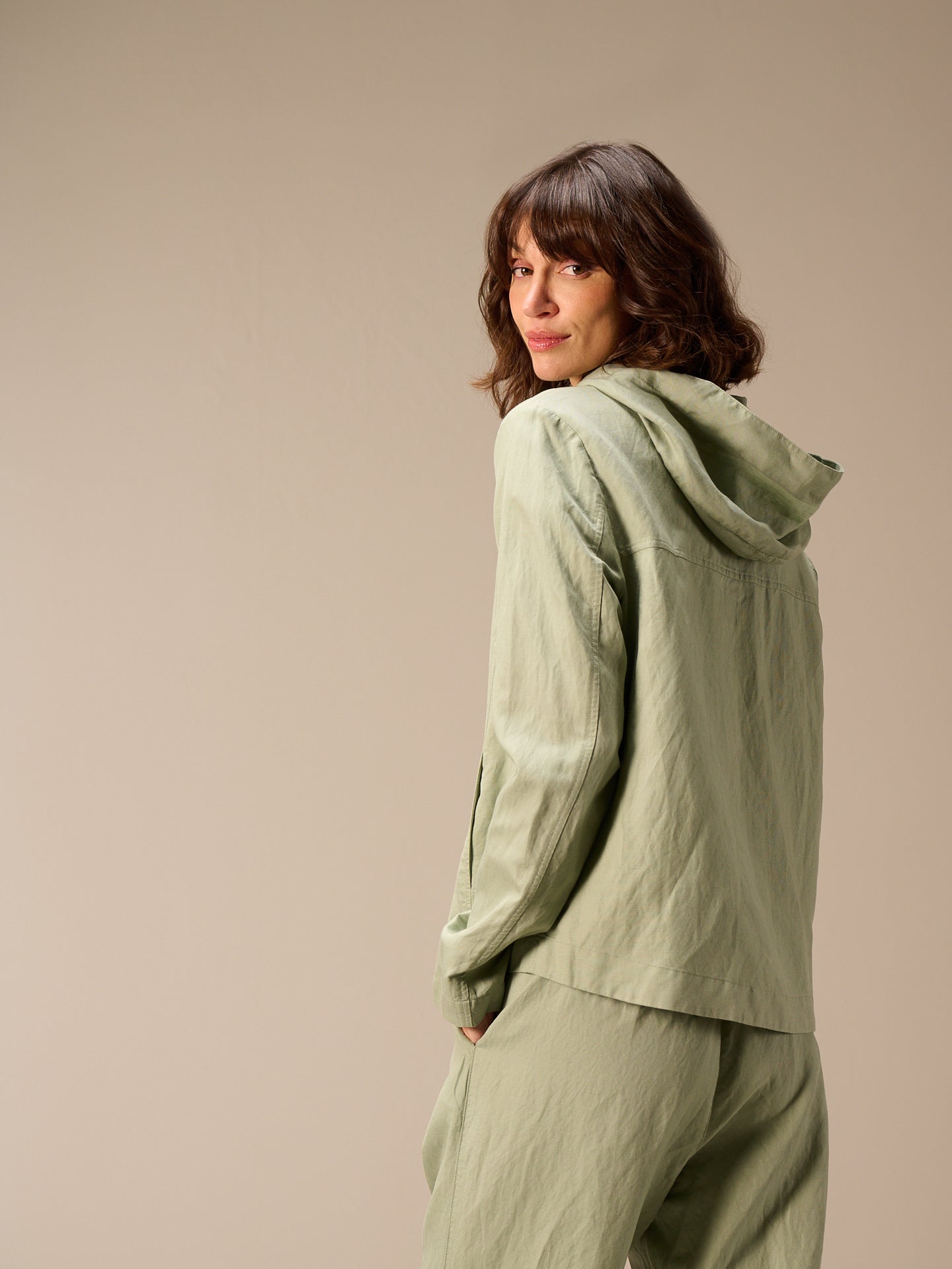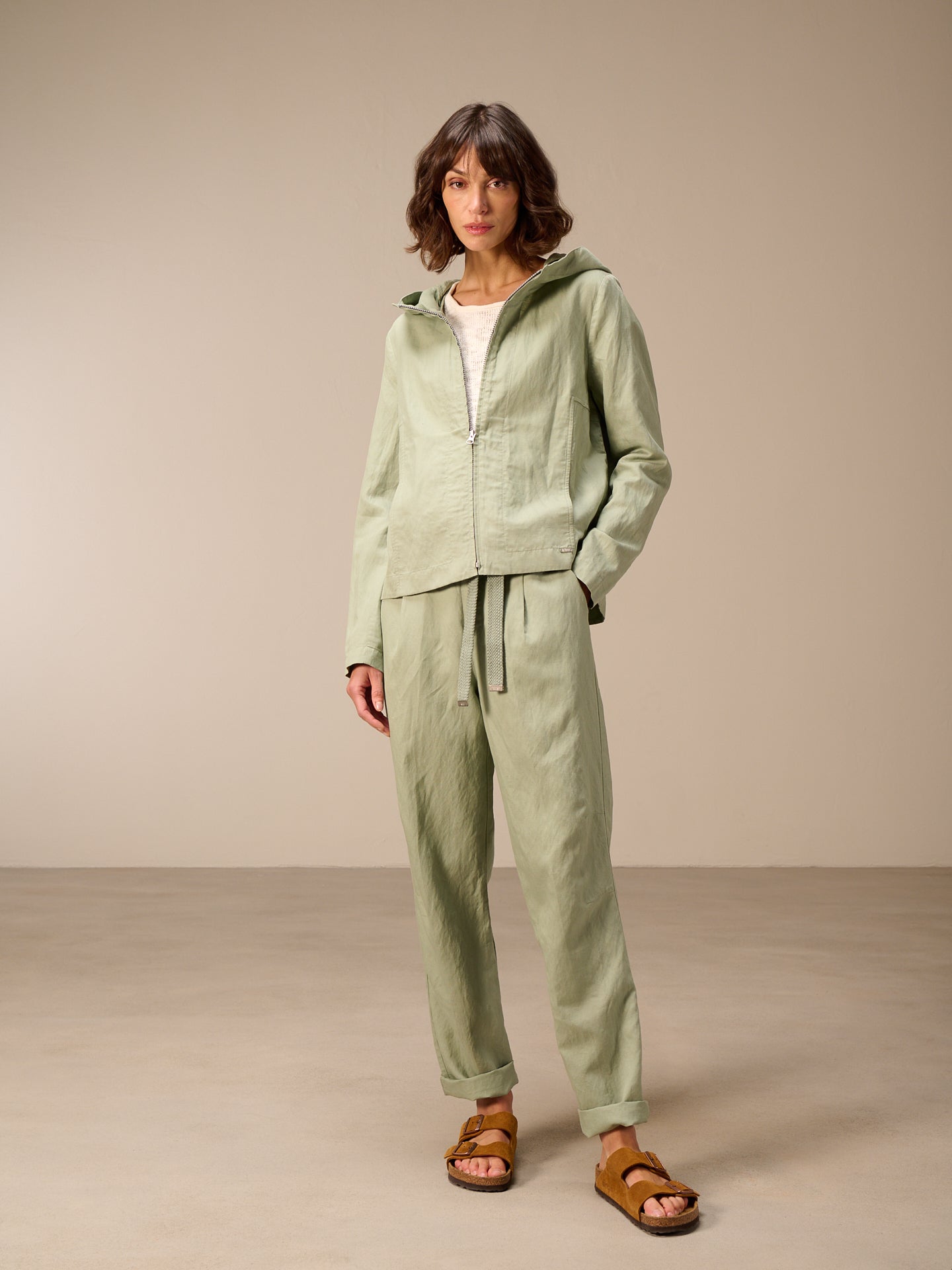 Leggera giacca primaverile con cappuccio, cerniera nascosta e pratica tasca dalla linea ad A che valorizza la silhouette. Il pregiato misto lino garantisce un comfort ideale.