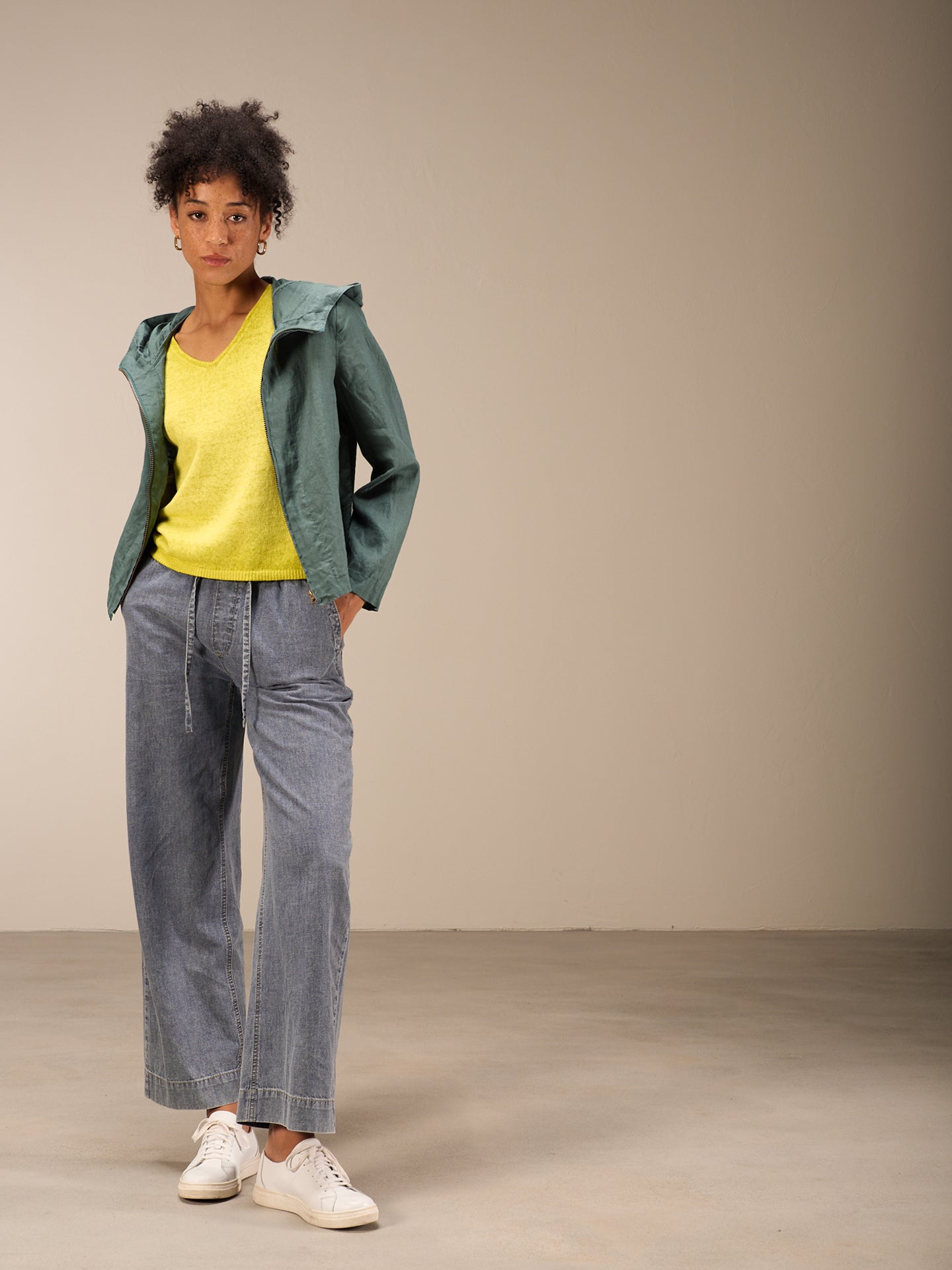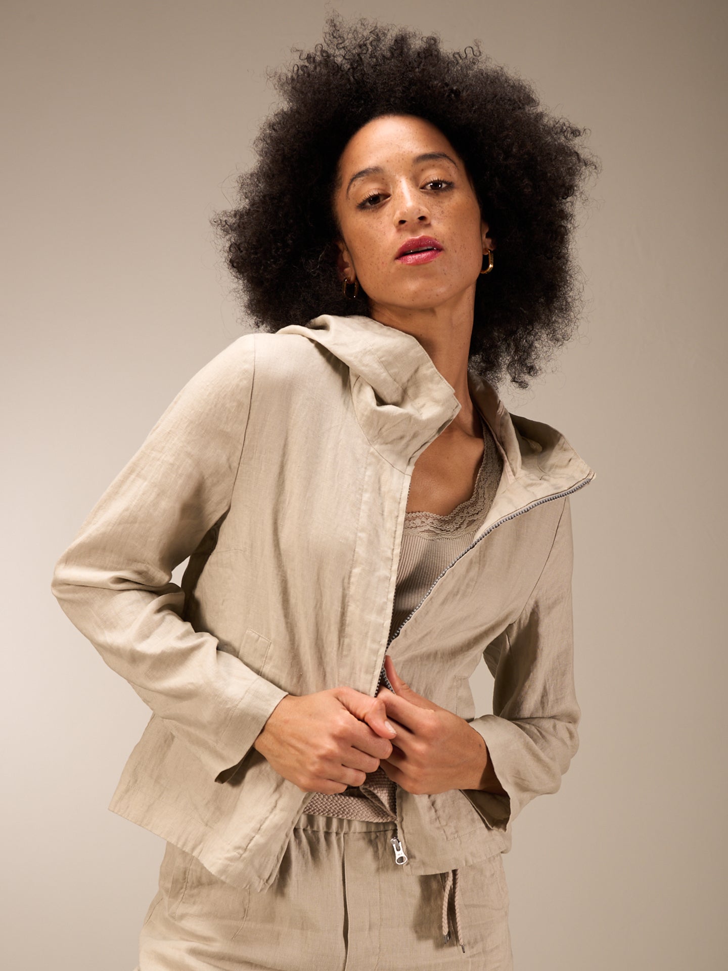 Leggera giacca primaverile con cappuccio dalla linea ad A che valorizza la silhouette. Il 100% lino garantisce un comfort ideale anche con le temperature estive.