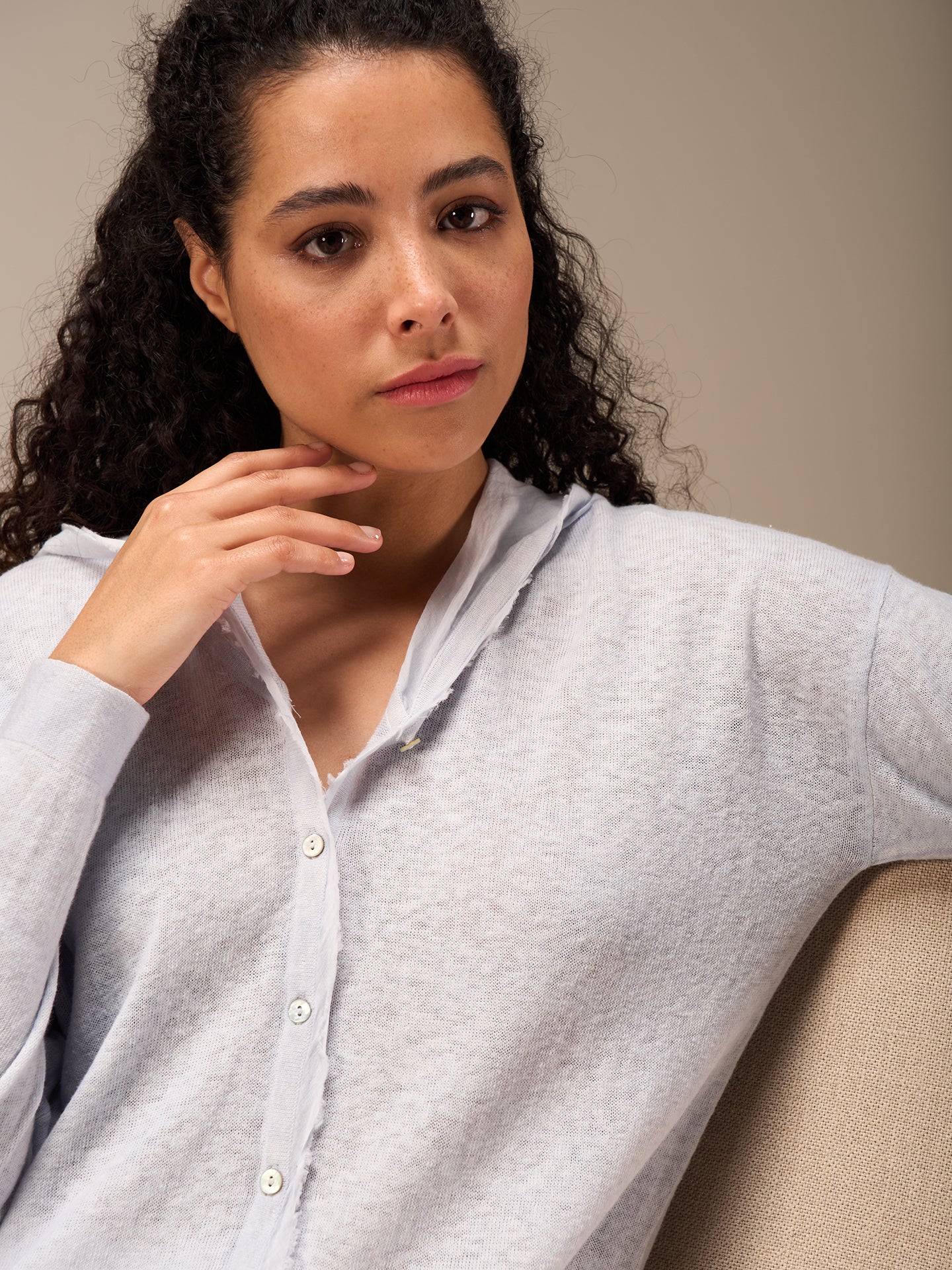 Cardigan ampio con cappuccio in lino intrecciato e abbottonatura con eleganti bottoni in madreperla e bordi sfrangiati. Il piacevole tessuto in maglia di lino al 100% rende questo cardigan un capo perfetto per l'estate. Uno speciale processo di tintura interna conferisce alla maglia un look accattivante. Le irregolarità nel colore rendono il capo unico. L'effetto slavato è accentuato.