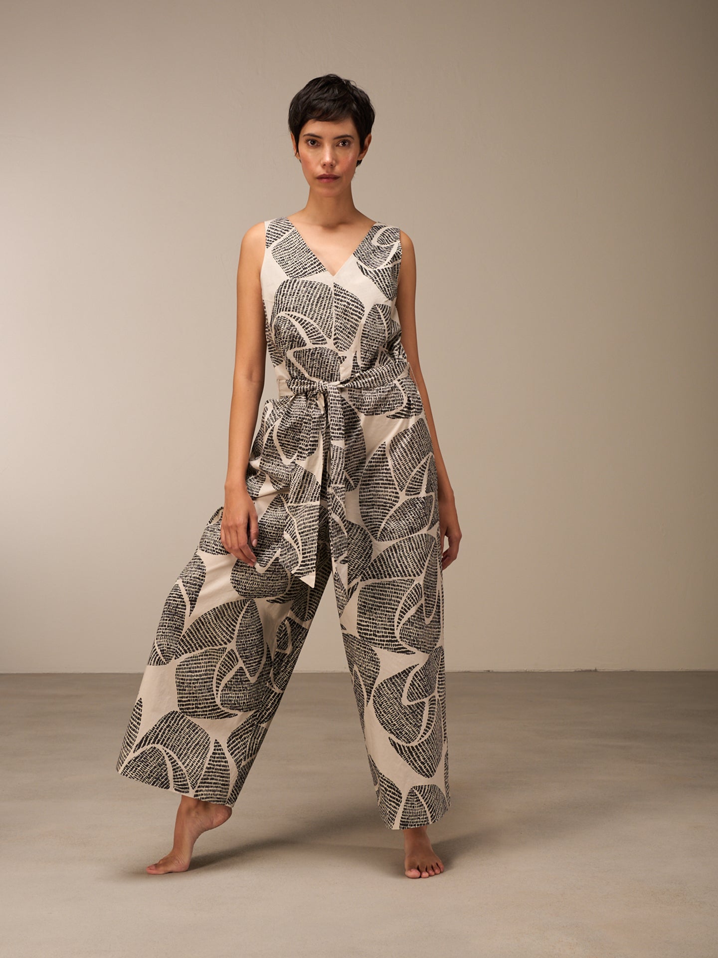 Tuta casual e leggera con gamba ampia dal taglio dritto e cintura larga, realizzata in cotone biologico al 100% proveniente da coltivazioni certificate, con una fresca sensazione cartacea al tatto. Le fresche stampe disegnate a mano regalano un tocco estivo.
