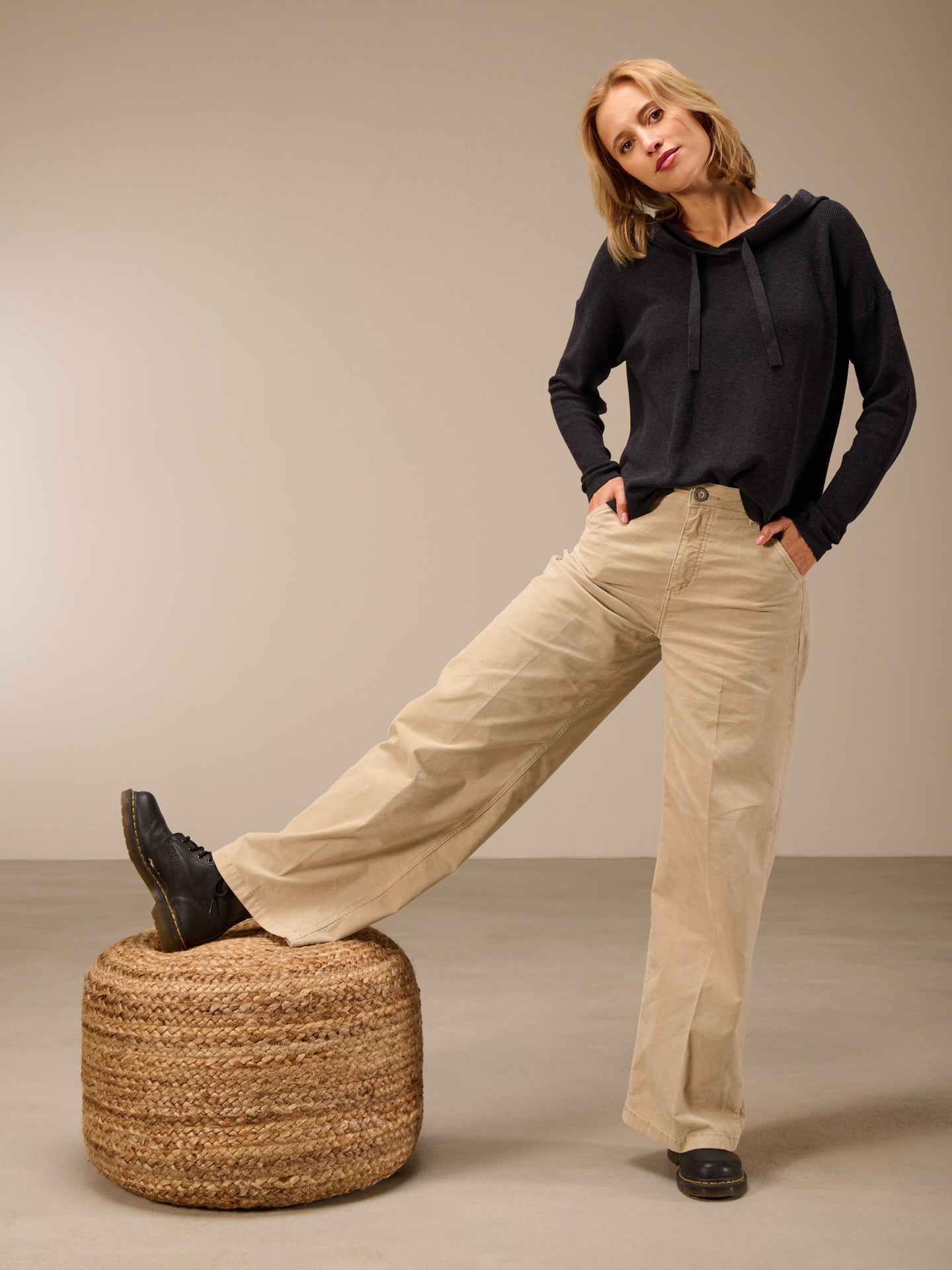Felpa con cappuccio dal taglio morbido, lavorata a maglia con motivo a mezzo punto inglese e bordi a coste sulle maniche.